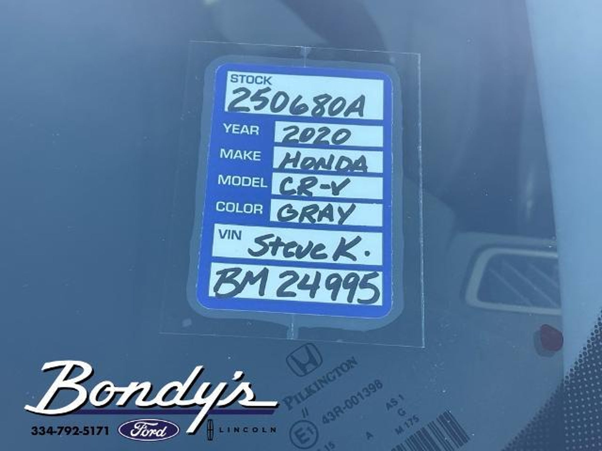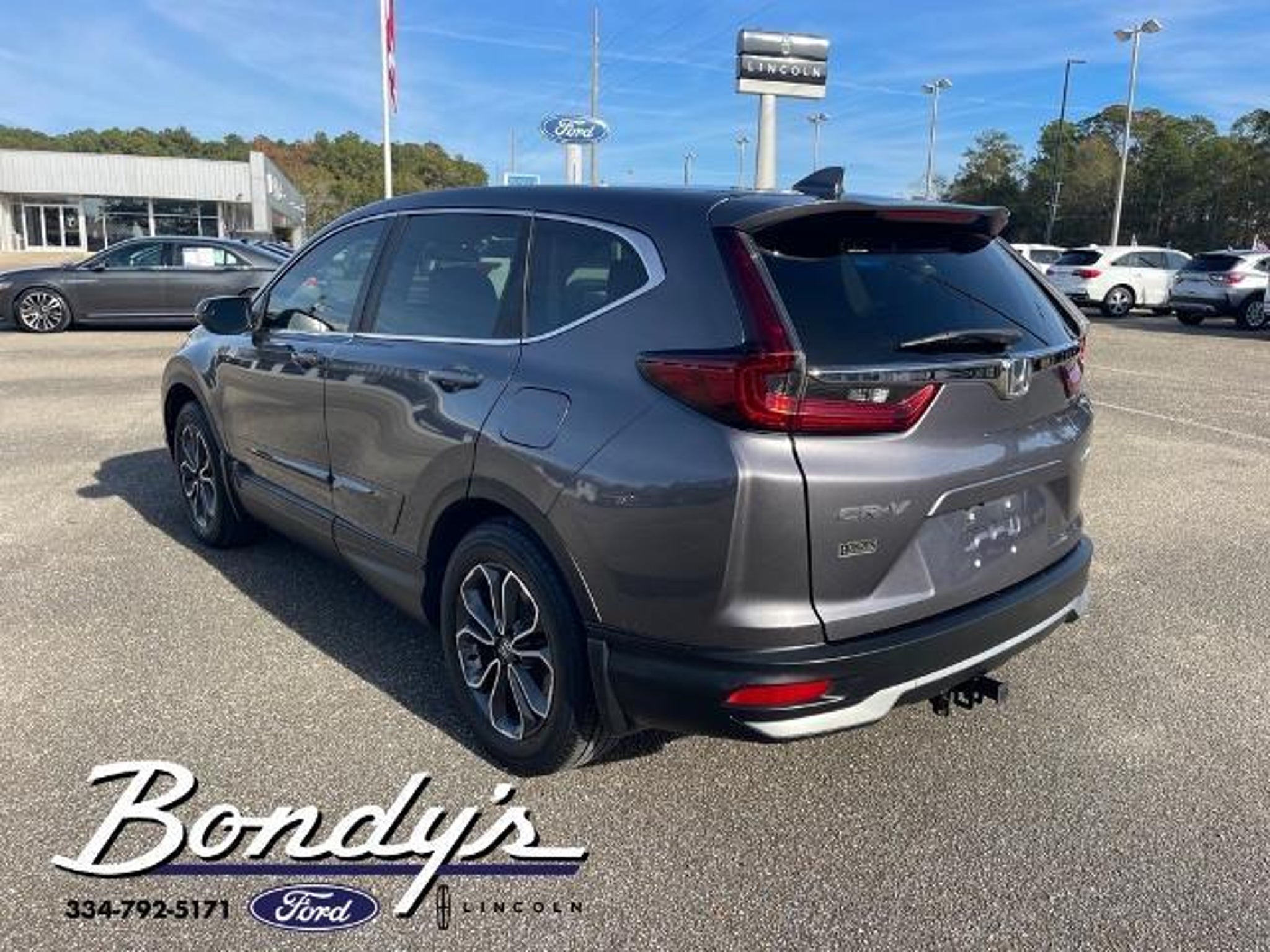 Priced below KBB Fair Purchase Price! CARFAX One-Owner. Clean CARFAX. 2020 Honda CR-V EX AWD, 18 Alloy Wheels, 4-Wheel Disc Brakes, 5.64 Axle Ratio, 6 Speakers, ABS brakes, Adaptive Cruise Control: Adaptive Cruise Control (ACC) with Low-Speed Follow, Air Conditioning, Alloy wheels, AM/FM radio: SiriusXM, Apple CarPlay/Android Auto, Auto High-beam Headlights, Automatic temperature control, Blind Spot Information (BSI) System warning, Brake assist, Bumpers: body-color, Cloth Seat Trim, Compass, Delay-off headlights, Driver door bin, Driver vanity mirror, Dual front impact airbags, Dual front side impact airbags, Electronic Stability Control, Exterior Parking Camera Rear, Forward collision: Collision Mitigation Braking System (CMBS) FCW mitigation, Four wheel independent suspension, Front anti-roll bar, Front Bucket Seats, Front Center Armrest, Front dual zone A/C, Front fog lights, Front reading lights, Heated door mirrors, Heated Front Bucket Seats, Heated front seats, Illuminated entry, Low tire pressure warning, Occupant sensing airbag, Outside temperature display, Overhead airbag, Overhead console, Panic alarm, Passenger door bin, Passenger vanity mirror, Power door mirrors, Power driver seat, Power moonroof, Power steering, Power windows, Radio data system, Radio: 180-Watt AM/FM/HD/SiriusXM Audio System, Rear anti-roll bar, Rear seat center armrest, Rear window defroster, Rear window wiper, Remote keyless entry, Security system, Speed control, Speed-sensing steering, Speed-Sensitive Wipers, Split folding rear seat, Spoiler, Steering wheel mounted audio controls, Tachometer, Telescoping steering wheel, Tilt steering wheel, Traction control, Trip computer, Turn signal indicator mirrors, Variably intermittent wipers, AWD. Sonic Gray Pearl AWD 1.5L I4 DOHC 16V CVT THIS VEHICLE IS LOCATED AT BONDY'S FORD LINCOLN AT 3615 ROSS CLARK CIRCLE DOTHAN, AL 36303. PLEASE CALL US AT 800-239-5171 TO ASK US ANY QUESTIONS! MON-FRI SALES IS HERE FROM 8:30 TO 7:00 AND SAT 8:30 TO 6:00. WE ARE CLOSED ON SUNDAYS. Call Toll Free 800-239-5171 or 334-792-5171.