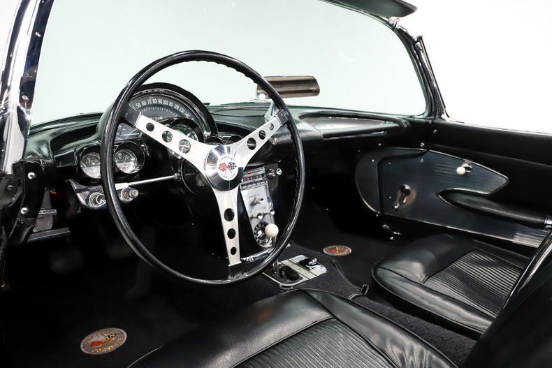 UNDERSIDE: Its exceptionally clean under the car, the frame is smooth and not even pitted. The fiberglass floors are clean too. The steering and suspension has been gone through, it has Delco shocks. It also has a fresh exhaust system with Dynamax mufflers and correctly positioned tail pipes. The brake system was redone and has been upgraded with discs in front, the e-brake is hooked up. Looking up at the motor it is clean Chevy orange, the fuel pump, starter and flywheel cover look fresh. It has a correct T10 4-speed transmission and the driveshaft leads back to its correct 1961 rear end.