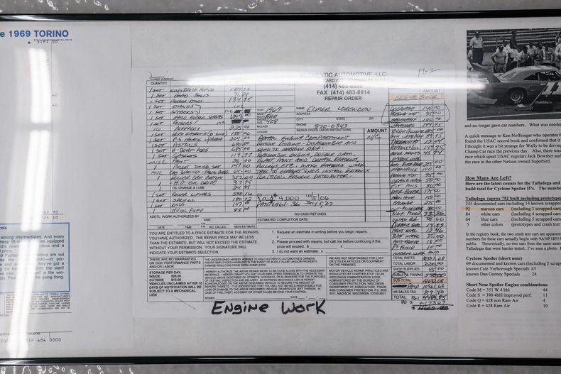 The Talladega was equipped by the factory with the 428ci Cobra Jet V8 engine, known for its impressive performance and reliability. The street-legal engine featured cast-iron block/heads along with a forged steel crankshaft and connecting rods. It incorporated a dual-plane intake manifold, high-lift camshaft and larger valves. The Cobra Jet was also equipped with a clutch fan and oil-cooler. With a compression ratio of 10.6:1, the factory Cobra Jet was very conservatively rated at 335 horsepower and 440lb/ft of torque. Based on available data, this 428 has been built for additional performance. It is now equipped with Edelbrock aluminum heads, Edelbrock Performer intake and Holley dual-feed carburetor. There are also receipts for the internal machine work performed.