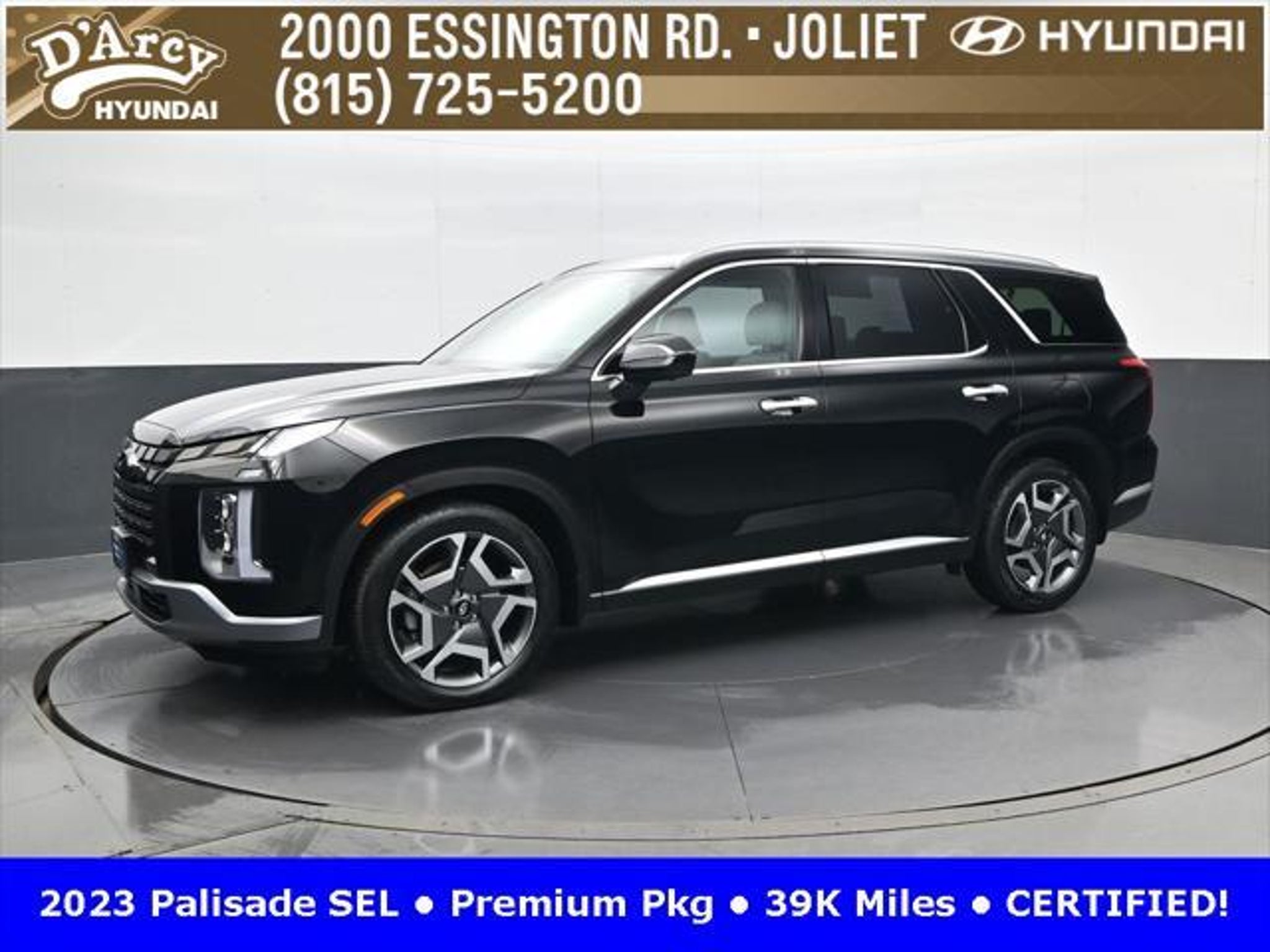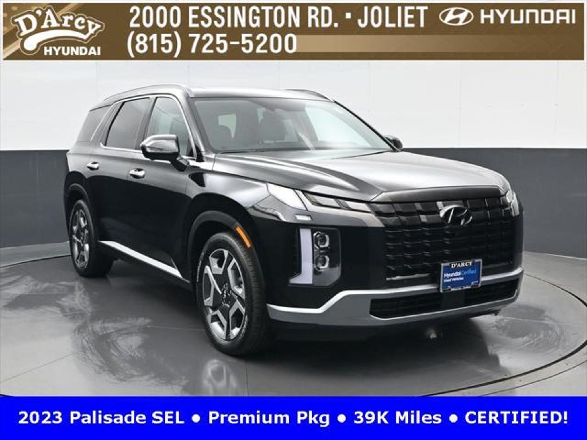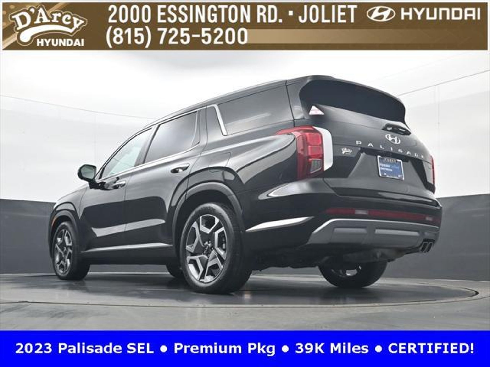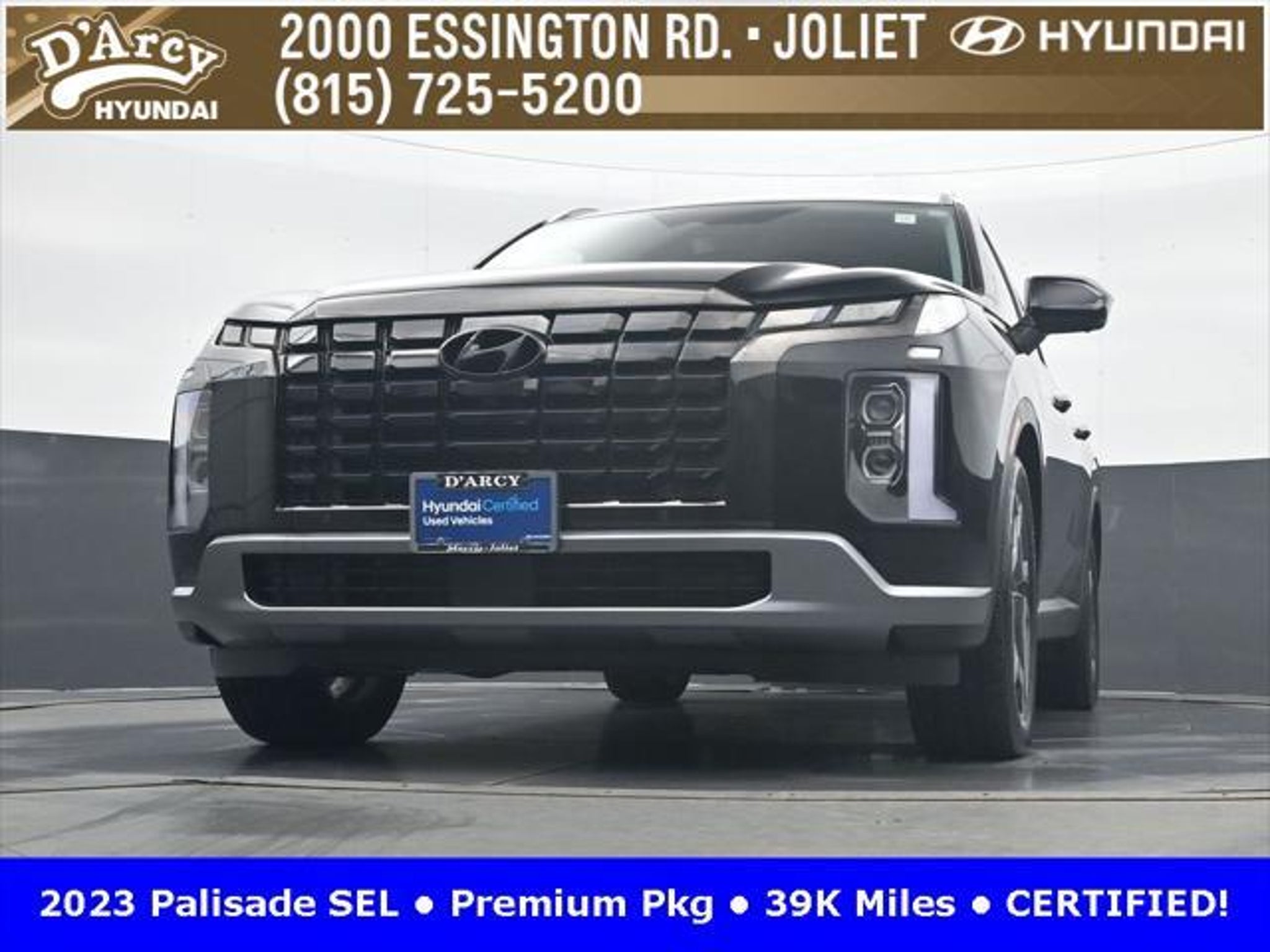 CARFAX One-Owner. ONE OWNER LOCAL TRADE!, LOW MILES!, GREAT VEHICLE HISTORY!, REMAINING FULL FACTORY WARRANTY!, SUNROOF!, LEATHER!, BOUGHT HERE SERVICED HERE!, HYUNDAI CERTIFIED!, FULLY SERVICED AND READY TO GO!. Certified. Abyss Black Pearl 2023 Hyundai Palisade SEL AWD 8-Speed Automatic with SHIFTRONIC V6 Hyundai Certified Used Vehicles Details: * Powertrain Limited Warranty: 120 Month/100,000 Mile (whichever comes first) from original in-service date * Warranty Deductible: $50 * Includes 10-year/Unlimited Mileage Roadside Assistance with Rental Car and Trip Interruption Reimbursement; Please See Dealers for Specific Vehicle Eligibility Requirements. 10-Year/100,000 Mile Hybrid/EV Battery Warranty. 3-Months SiriusXM Trial Subscription. Complimentary 1 Year (Connected Care & Remote Pkgs). * 173 Point Inspection * Roadside Assistance * Limited Warranty: 60 Month/60,000 Mile (whichever comes first) from original in-service date * Vehicle History Discover the D'Arcy Difference! We care - we are here and we are ready to help! Stop by today to see up to date information, including showroom and service hours, and how to make an appointment or schedule delivery. D'Arcy Motors has been serving Joliet and its surrounding communities for over 25 years. Our business philosophy, which is to sell cars one car at a time and to make the guest the most important part of the process, has remained the same since 1991. Contact us today to experience the D'Arcy Difference! Pulse® Safer Braking Technology for $399 added to all New and CPO"“ The rear-end collision deterrent that rapidly pulses your third brake light four times before going solid when you press the brake pedal. This feature enhances safety by helping alert trailing drivers. Discover the D'Arcy Difference! We care - we are here and we are ready to help! Stop by today to see up to date information, including showroom and service hours, and how to make an appointment or schedule delivery. D'Arcy Motors has been serving Joliet and its surrounding communities for over 25 years. Our business philosophy, which is to sell cars one car at a time and to make the guest the most important part of the process, has remained the same since 1991. Contact us today to experience the D'Arcy Difference! This 2023 Hyundai Palisade comes equipped with: 8-Passenger Bench Seating (115-Volt AC Power Outlet, 12.3 Full-Digital Multi-Information Display, 3rd Row USB Outlets, 8-Passenger Seating, Acoustic Rear Side Glass, Auto Leveling Rear Suspension, Blind-Spot View Monitor, Driver 4-Way Power Lumbar Support, Driver Talk (In-Car Intercom), Forward Collision Avoidance Assist, Front Parking Sensors, harman/kardon® Audio System, Heated 2nd Row Seats, Heated Steering Wheel, Highway Driving Assist II (HDA), Hydro-Phobic Front Side Glass, Integrated Memory Driver Seat & Mirrors, Power Sunroof, Rear Side Window Sunshades, Surround View Monitor, Ventilated Front & 2nd-Row Seats, and Wheels: 20 x 7.5J Alloy), Cargo Package (Cargo Blocks, Cargo Net, and Cargo Tray), 3.648 Axle Ratio, 3rd row seats: split-bench, 4-Wheel Disc Brakes, 6 Speakers, ABS brakes, Air Conditioning, Alloy wheels, AM/FM radio: SiriusXM, Apple CarPlay & Android Auto, Auto High-beam Headlights, Auto-dimming door mirrors, Auto-dimming Rear-View mirror, Automatic temperature control, Brake assist, Bumpers: body-color, Carpeted Floor Mats, Delay-off headlights, Driver door bin, Driver vanity mirror, Dual front impact airbags, Dual front side impact airbags, Electronic Stability Control, Emergency communication system: Blue Link Connected Car Service (3-year complimentary subscription), Exterior Parking Camera Rear, First Aid Kit, Four wheel independent suspension, Front anti-roll bar, Front Bucket Seats, Front Center Armrest, Front dual zone A/C, Front reading lights, Fully automatic headlights, Garage door transmitter: HomeLink, H-Tex Leatherette Seat Trim, Heated door mirrors