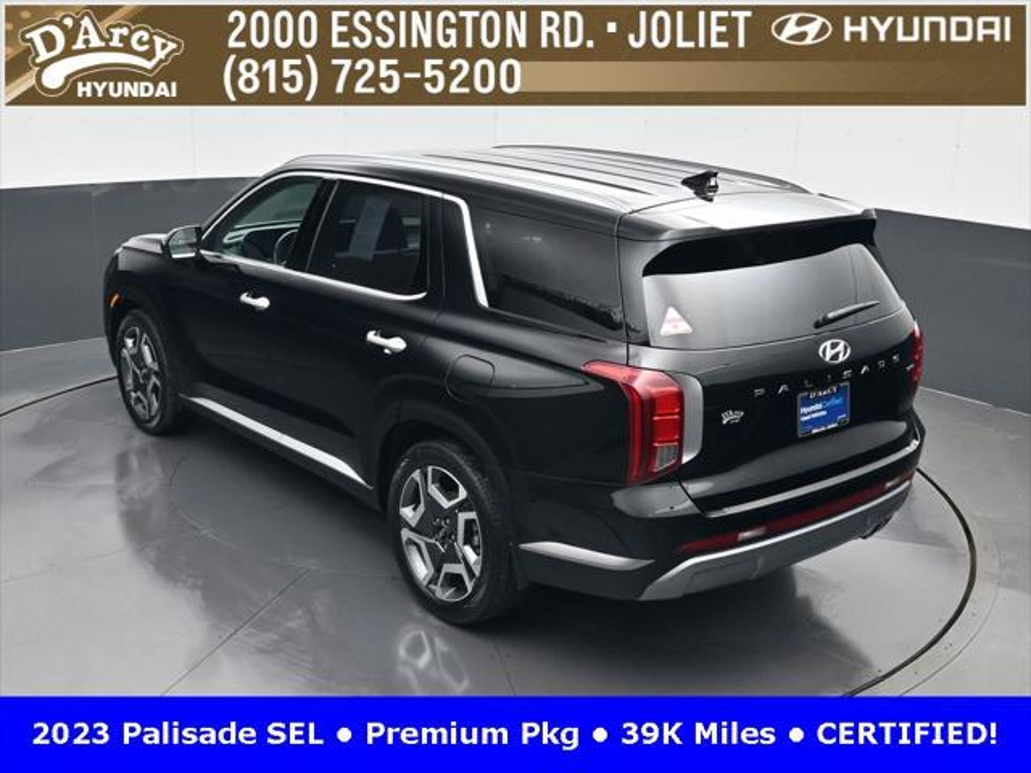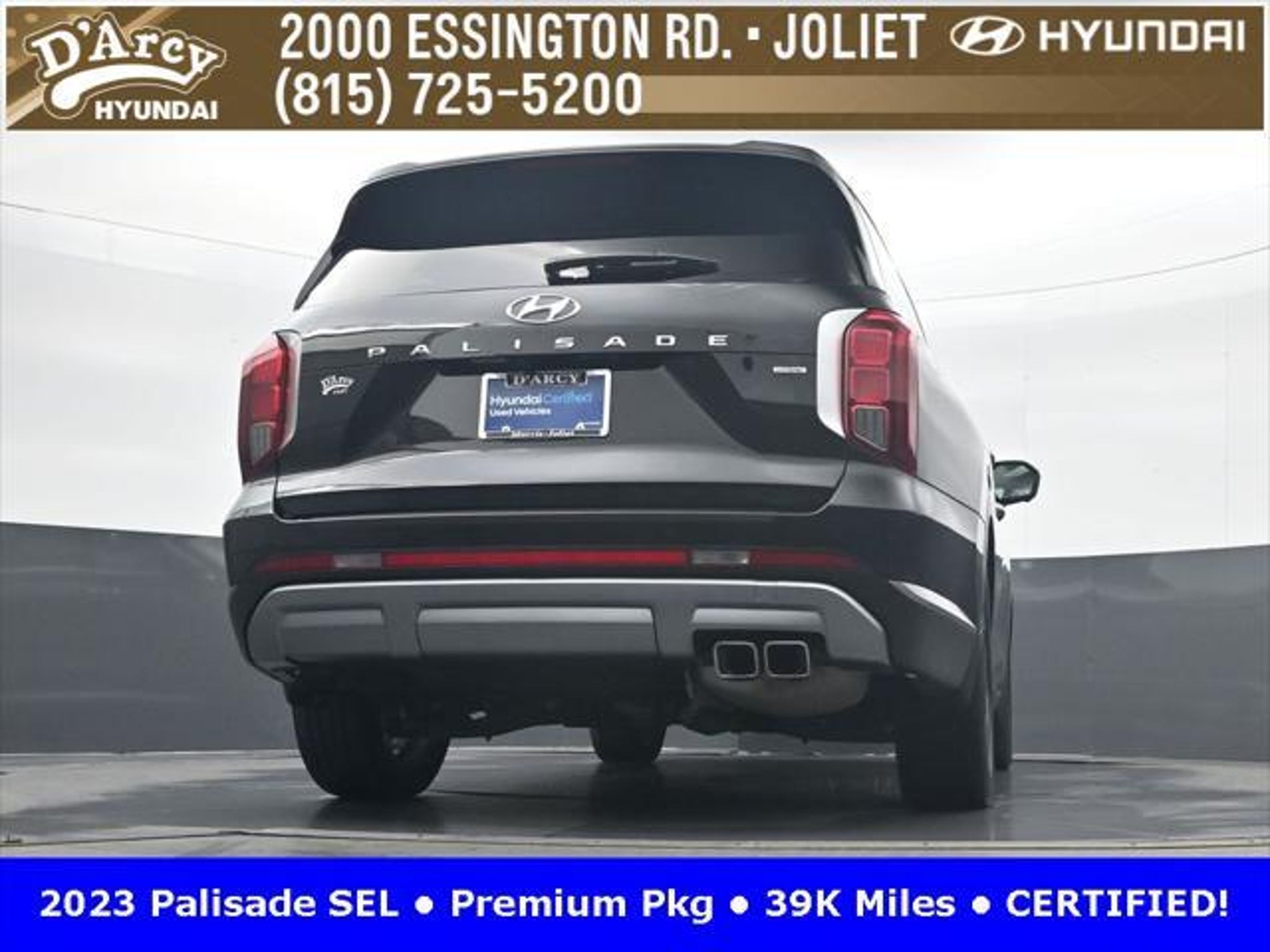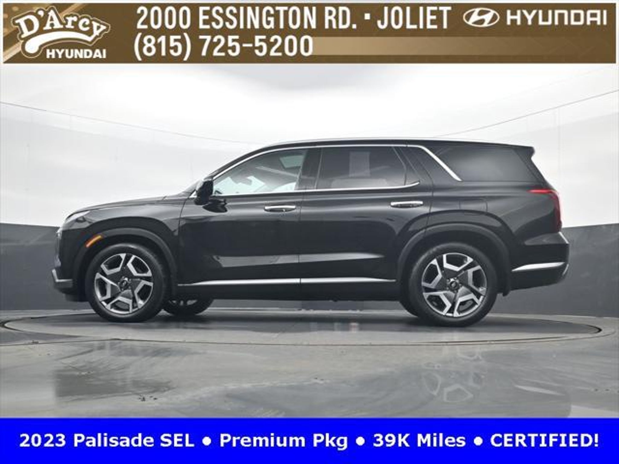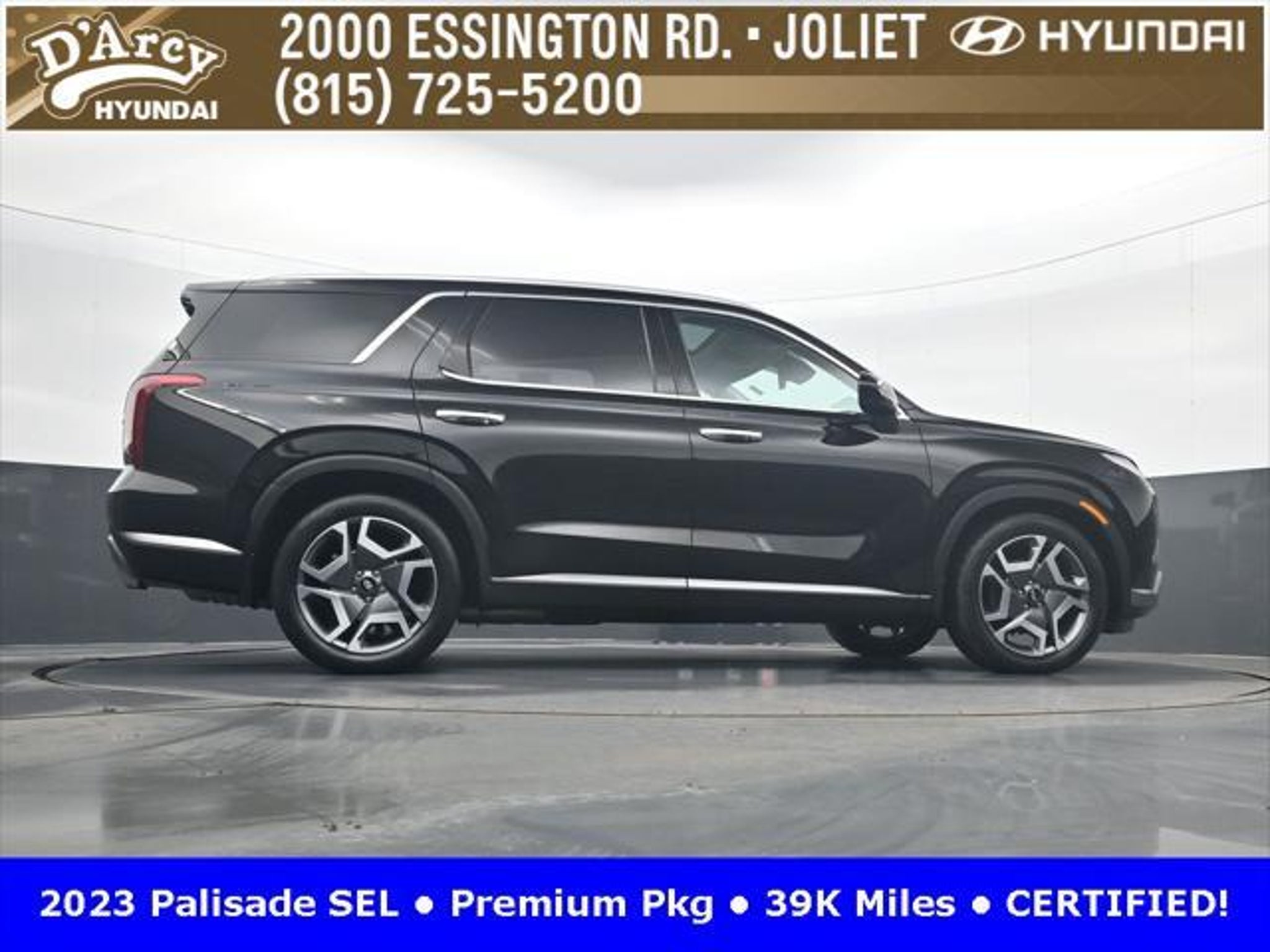 CARFAX One-Owner. ONE OWNER LOCAL TRADE!, LOW MILES!, GREAT VEHICLE HISTORY!, REMAINING FULL FACTORY WARRANTY!, SUNROOF!, LEATHER!, BOUGHT HERE SERVICED HERE!, HYUNDAI CERTIFIED!, FULLY SERVICED AND READY TO GO!. Certified. Abyss Black Pearl 2023 Hyundai Palisade SEL AWD 8-Speed Automatic with SHIFTRONIC V6 Hyundai Certified Used Vehicles Details: * Powertrain Limited Warranty: 120 Month/100,000 Mile (whichever comes first) from original in-service date * Warranty Deductible: $50 * Includes 10-year/Unlimited Mileage Roadside Assistance with Rental Car and Trip Interruption Reimbursement; Please See Dealers for Specific Vehicle Eligibility Requirements. 10-Year/100,000 Mile Hybrid/EV Battery Warranty. 3-Months SiriusXM Trial Subscription. Complimentary 1 Year (Connected Care & Remote Pkgs). * 173 Point Inspection * Roadside Assistance * Limited Warranty: 60 Month/60,000 Mile (whichever comes first) from original in-service date * Vehicle History Discover the D'Arcy Difference! We care - we are here and we are ready to help! Stop by today to see up to date information, including showroom and service hours, and how to make an appointment or schedule delivery. D'Arcy Motors has been serving Joliet and its surrounding communities for over 25 years. Our business philosophy, which is to sell cars one car at a time and to make the guest the most important part of the process, has remained the same since 1991. Contact us today to experience the D'Arcy Difference! Pulse® Safer Braking Technology for $399 added to all New and CPO"“ The rear-end collision deterrent that rapidly pulses your third brake light four times before going solid when you press the brake pedal. This feature enhances safety by helping alert trailing drivers. Discover the D'Arcy Difference! We care - we are here and we are ready to help! Stop by today to see up to date information, including showroom and service hours, and how to make an appointment or schedule delivery. D'Arcy Motors has been serving Joliet and its surrounding communities for over 25 years. Our business philosophy, which is to sell cars one car at a time and to make the guest the most important part of the process, has remained the same since 1991. Contact us today to experience the D'Arcy Difference! This 2023 Hyundai Palisade comes equipped with: 8-Passenger Bench Seating (115-Volt AC Power Outlet, 12.3 Full-Digital Multi-Information Display, 3rd Row USB Outlets, 8-Passenger Seating, Acoustic Rear Side Glass, Auto Leveling Rear Suspension, Blind-Spot View Monitor, Driver 4-Way Power Lumbar Support, Driver Talk (In-Car Intercom), Forward Collision Avoidance Assist, Front Parking Sensors, harman/kardon® Audio System, Heated 2nd Row Seats, Heated Steering Wheel, Highway Driving Assist II (HDA), Hydro-Phobic Front Side Glass, Integrated Memory Driver Seat & Mirrors, Power Sunroof, Rear Side Window Sunshades, Surround View Monitor, Ventilated Front & 2nd-Row Seats, and Wheels: 20 x 7.5J Alloy), Cargo Package (Cargo Blocks, Cargo Net, and Cargo Tray), 3.648 Axle Ratio, 3rd row seats: split-bench, 4-Wheel Disc Brakes, 6 Speakers, ABS brakes, Air Conditioning, Alloy wheels, AM/FM radio: SiriusXM, Apple CarPlay & Android Auto, Auto High-beam Headlights, Auto-dimming door mirrors, Auto-dimming Rear-View mirror, Automatic temperature control, Brake assist, Bumpers: body-color, Carpeted Floor Mats, Delay-off headlights, Driver door bin, Driver vanity mirror, Dual front impact airbags, Dual front side impact airbags, Electronic Stability Control, Emergency communication system: Blue Link Connected Car Service (3-year complimentary subscription), Exterior Parking Camera Rear, First Aid Kit, Four wheel independent suspension, Front anti-roll bar, Front Bucket Seats, Front Center Armrest, Front dual zone A/C, Front reading lights, Fully automatic headlights, Garage door transmitter: HomeLink, H-Tex Leatherette Seat Trim, Heated door mirrors