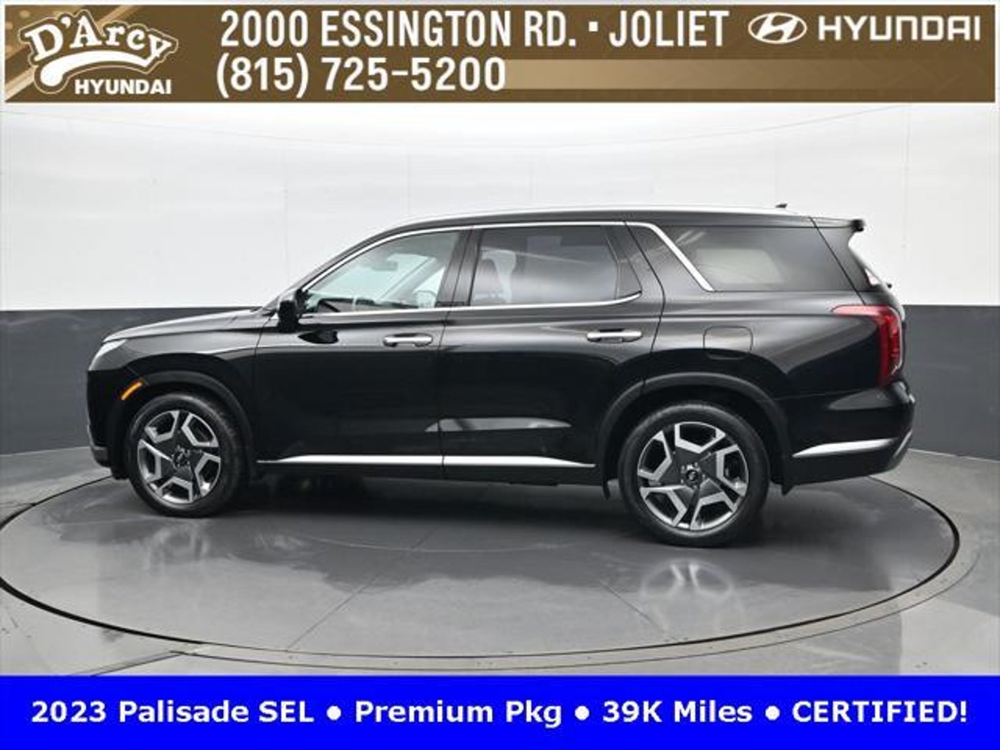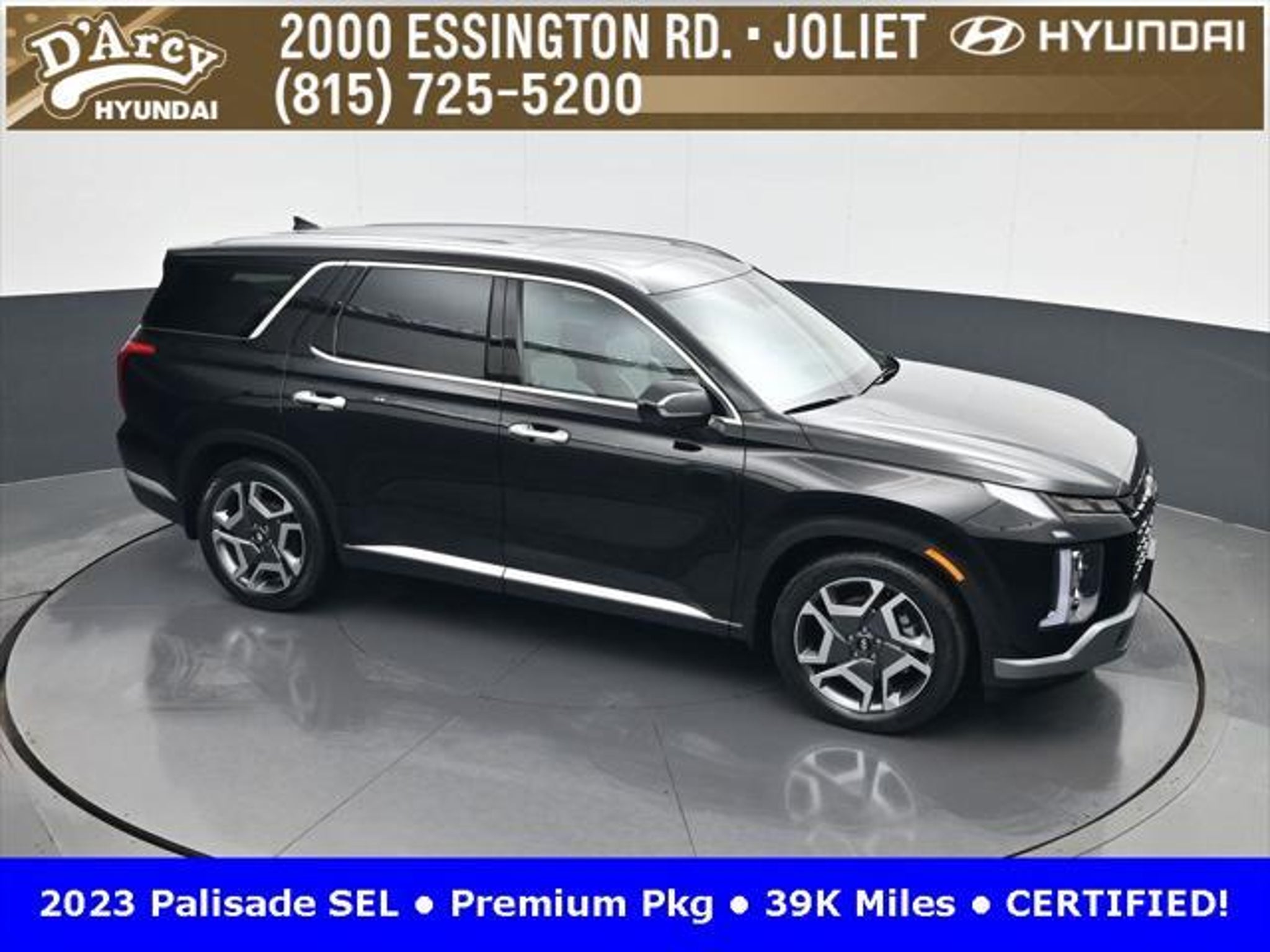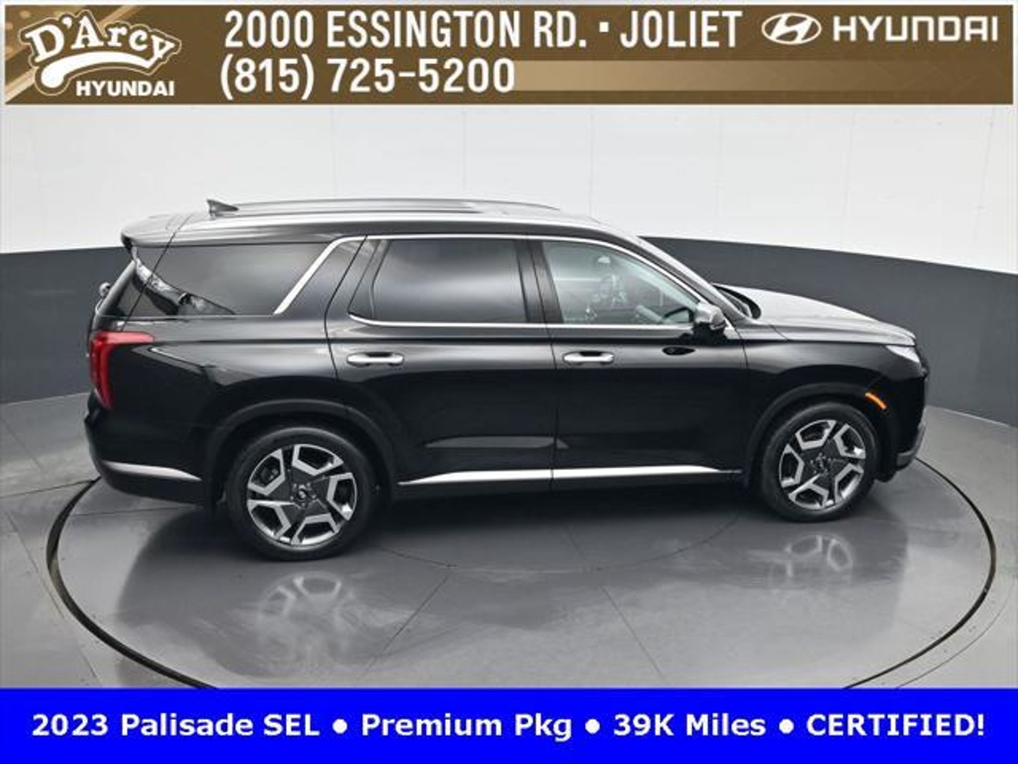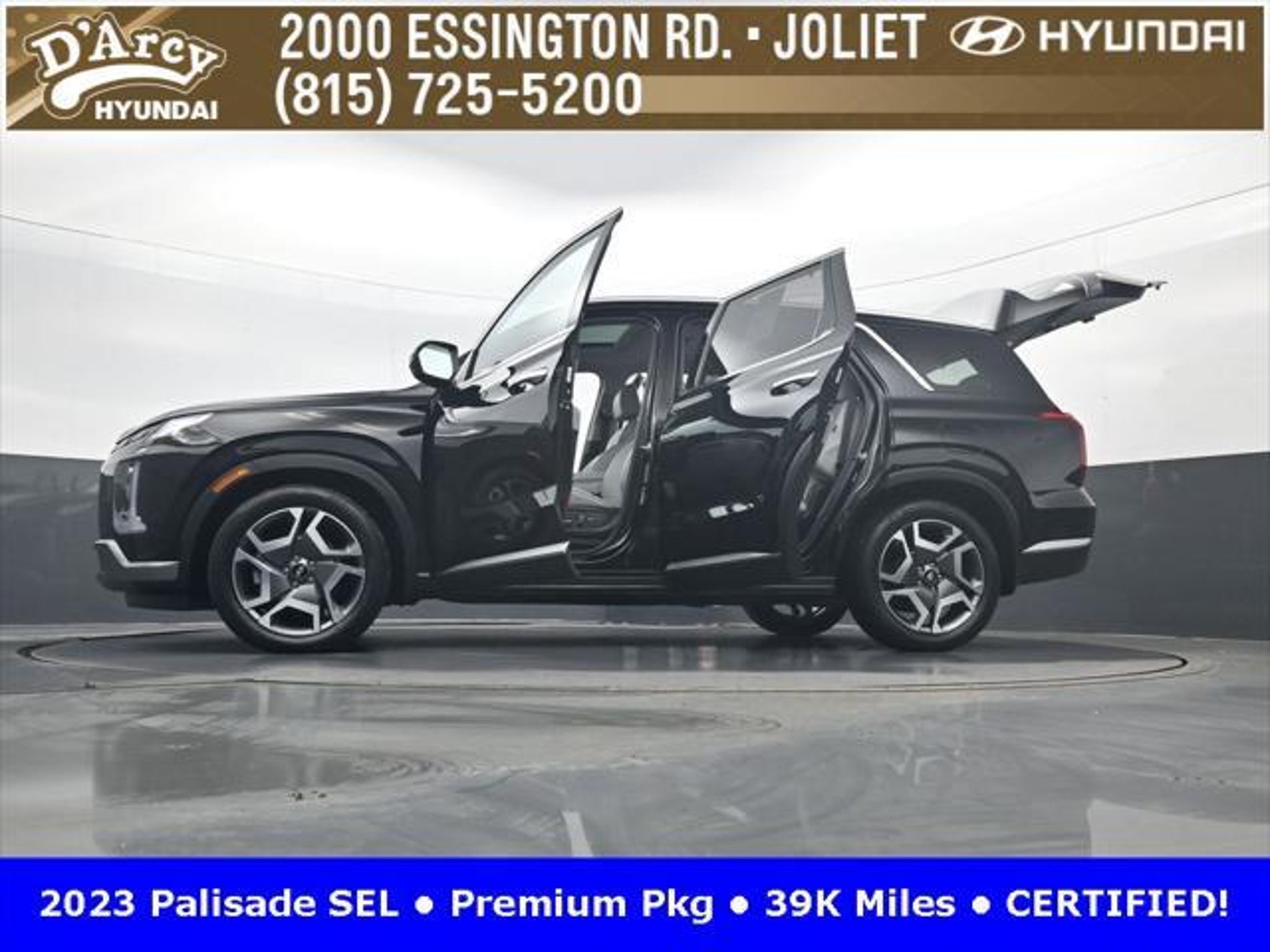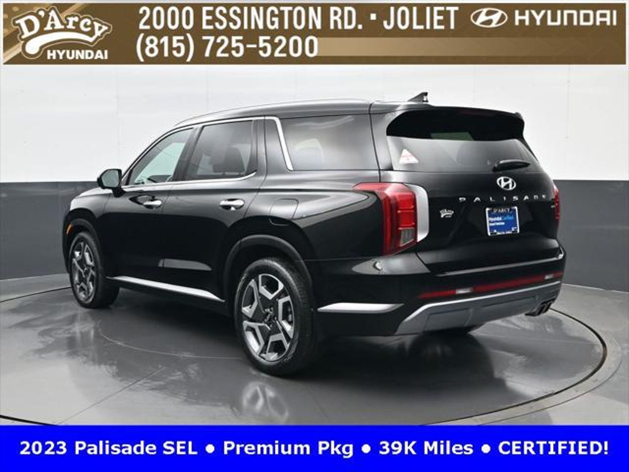 CARFAX One-Owner. ONE OWNER LOCAL TRADE!, LOW MILES!, GREAT VEHICLE HISTORY!, REMAINING FULL FACTORY WARRANTY!, SUNROOF!, LEATHER!, BOUGHT HERE SERVICED HERE!, HYUNDAI CERTIFIED!, FULLY SERVICED AND READY TO GO!. Certified. Abyss Black Pearl 2023 Hyundai Palisade SEL AWD 8-Speed Automatic with SHIFTRONIC V6 Hyundai Certified Used Vehicles Details: * Powertrain Limited Warranty: 120 Month/100,000 Mile (whichever comes first) from original in-service date * Warranty Deductible: $50 * Includes 10-year/Unlimited Mileage Roadside Assistance with Rental Car and Trip Interruption Reimbursement; Please See Dealers for Specific Vehicle Eligibility Requirements. 10-Year/100,000 Mile Hybrid/EV Battery Warranty. 3-Months SiriusXM Trial Subscription. Complimentary 1 Year (Connected Care & Remote Pkgs). * 173 Point Inspection * Roadside Assistance * Limited Warranty: 60 Month/60,000 Mile (whichever comes first) from original in-service date * Vehicle History Discover the D'Arcy Difference! We care - we are here and we are ready to help! Stop by today to see up to date information, including showroom and service hours, and how to make an appointment or schedule delivery. D'Arcy Motors has been serving Joliet and its surrounding communities for over 25 years. Our business philosophy, which is to sell cars one car at a time and to make the guest the most important part of the process, has remained the same since 1991. Contact us today to experience the D'Arcy Difference! Pulse® Safer Braking Technology for $399 added to all New and CPO"“ The rear-end collision deterrent that rapidly pulses your third brake light four times before going solid when you press the brake pedal. This feature enhances safety by helping alert trailing drivers. Discover the D'Arcy Difference! We care - we are here and we are ready to help! Stop by today to see up to date information, including showroom and service hours, and how to make an appointment or schedule delivery. D'Arcy Motors has been serving Joliet and its surrounding communities for over 25 years. Our business philosophy, which is to sell cars one car at a time and to make the guest the most important part of the process, has remained the same since 1991. Contact us today to experience the D'Arcy Difference! This 2023 Hyundai Palisade comes equipped with: 8-Passenger Bench Seating (115-Volt AC Power Outlet, 12.3 Full-Digital Multi-Information Display, 3rd Row USB Outlets, 8-Passenger Seating, Acoustic Rear Side Glass, Auto Leveling Rear Suspension, Blind-Spot View Monitor, Driver 4-Way Power Lumbar Support, Driver Talk (In-Car Intercom), Forward Collision Avoidance Assist, Front Parking Sensors, harman/kardon® Audio System, Heated 2nd Row Seats, Heated Steering Wheel, Highway Driving Assist II (HDA), Hydro-Phobic Front Side Glass, Integrated Memory Driver Seat & Mirrors, Power Sunroof, Rear Side Window Sunshades, Surround View Monitor, Ventilated Front & 2nd-Row Seats, and Wheels: 20 x 7.5J Alloy), Cargo Package (Cargo Blocks, Cargo Net, and Cargo Tray), 3.648 Axle Ratio, 3rd row seats: split-bench, 4-Wheel Disc Brakes, 6 Speakers, ABS brakes, Air Conditioning, Alloy wheels, AM/FM radio: SiriusXM, Apple CarPlay & Android Auto, Auto High-beam Headlights, Auto-dimming door mirrors, Auto-dimming Rear-View mirror, Automatic temperature control, Brake assist, Bumpers: body-color, Carpeted Floor Mats, Delay-off headlights, Driver door bin, Driver vanity mirror, Dual front impact airbags, Dual front side impact airbags, Electronic Stability Control, Emergency communication system: Blue Link Connected Car Service (3-year complimentary subscription), Exterior Parking Camera Rear, First Aid Kit, Four wheel independent suspension, Front anti-roll bar, Front Bucket Seats, Front Center Armrest, Front dual zone A/C, Front reading lights, Fully automatic headlights, Garage door transmitter: HomeLink, H-Tex Leatherette Seat Trim, Heated door mirrors