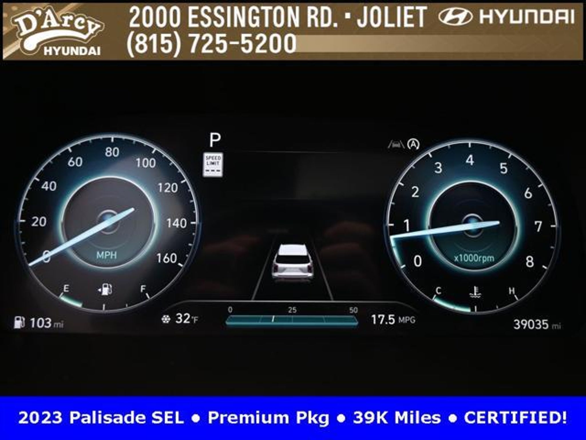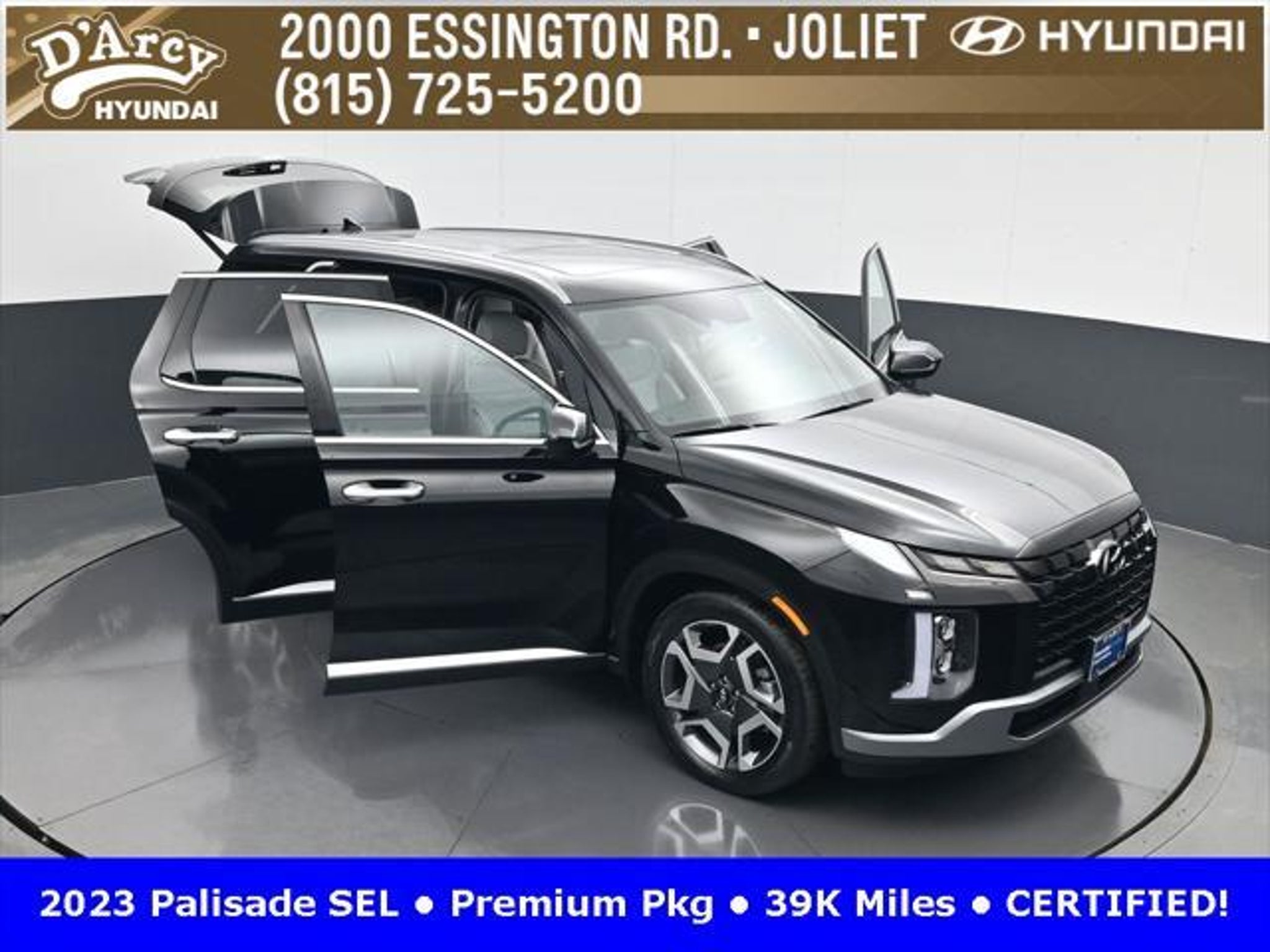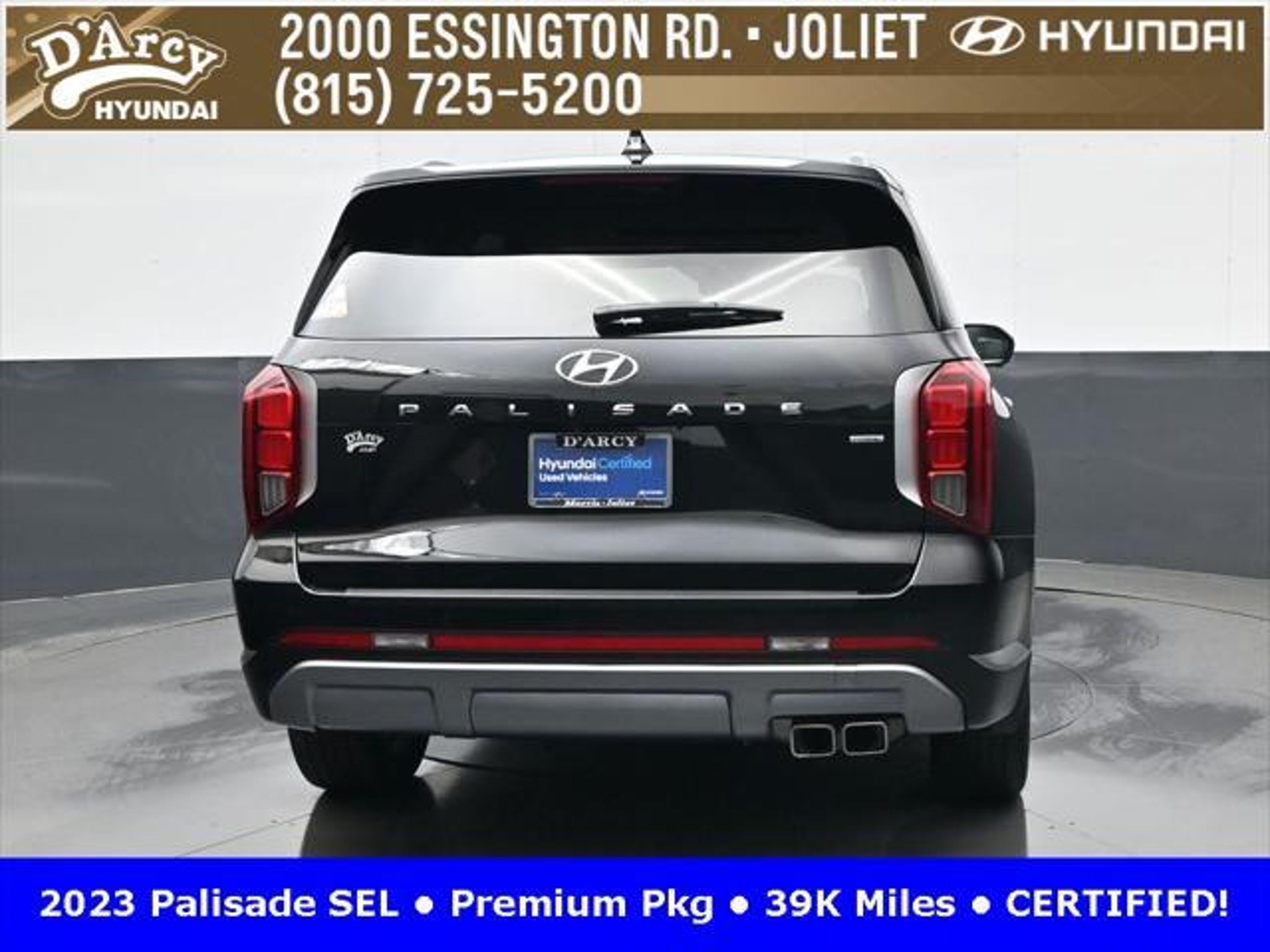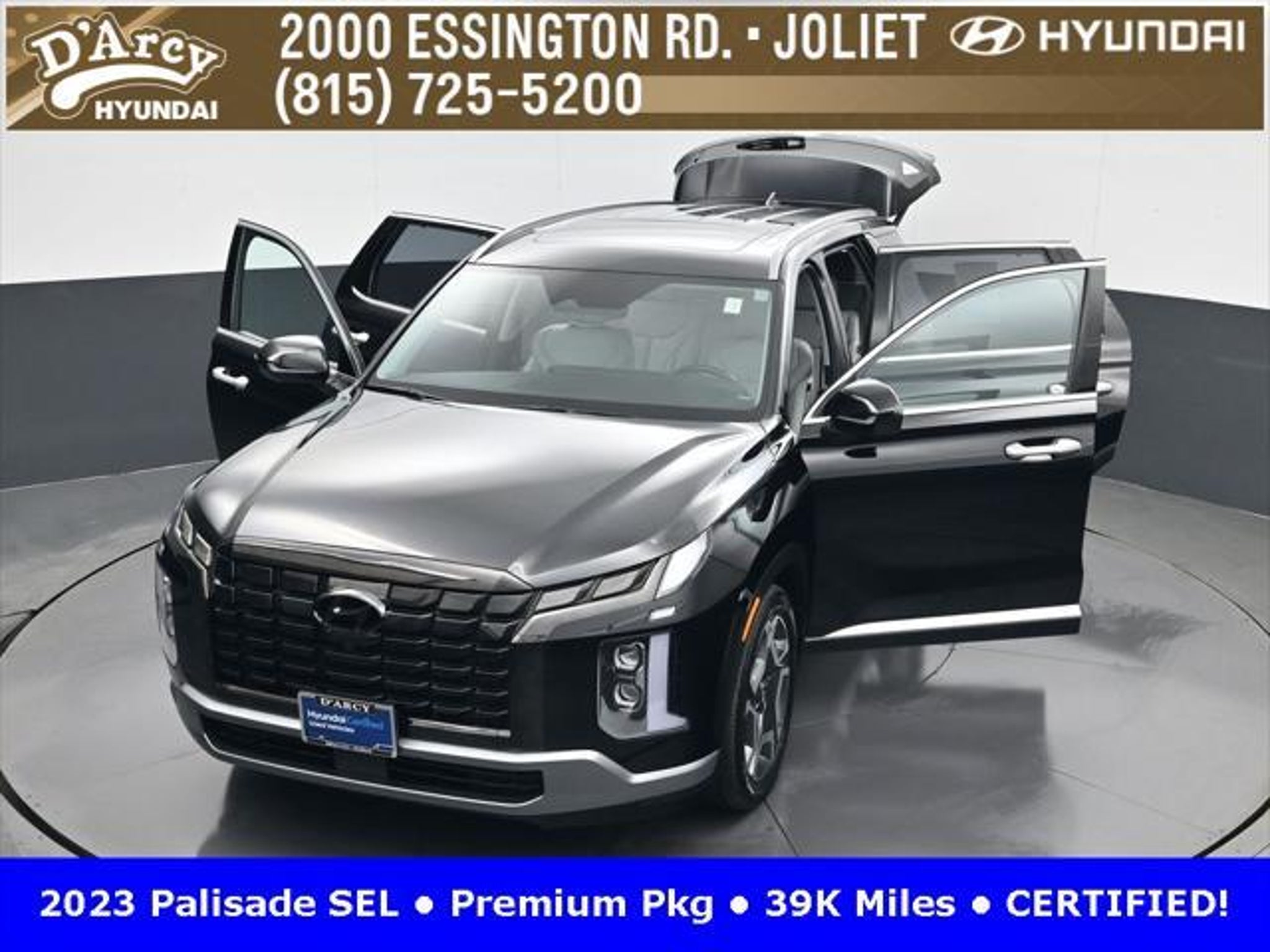 CARFAX One-Owner. ONE OWNER LOCAL TRADE!, LOW MILES!, GREAT VEHICLE HISTORY!, REMAINING FULL FACTORY WARRANTY!, SUNROOF!, LEATHER!, BOUGHT HERE SERVICED HERE!, HYUNDAI CERTIFIED!, FULLY SERVICED AND READY TO GO!. Certified. Abyss Black Pearl 2023 Hyundai Palisade SEL AWD 8-Speed Automatic with SHIFTRONIC V6 Hyundai Certified Used Vehicles Details: * Powertrain Limited Warranty: 120 Month/100,000 Mile (whichever comes first) from original in-service date * Warranty Deductible: $50 * Includes 10-year/Unlimited Mileage Roadside Assistance with Rental Car and Trip Interruption Reimbursement; Please See Dealers for Specific Vehicle Eligibility Requirements. 10-Year/100,000 Mile Hybrid/EV Battery Warranty. 3-Months SiriusXM Trial Subscription. Complimentary 1 Year (Connected Care & Remote Pkgs). * 173 Point Inspection * Roadside Assistance * Limited Warranty: 60 Month/60,000 Mile (whichever comes first) from original in-service date * Vehicle History Discover the D'Arcy Difference! We care - we are here and we are ready to help! Stop by today to see up to date information, including showroom and service hours, and how to make an appointment or schedule delivery. D'Arcy Motors has been serving Joliet and its surrounding communities for over 25 years. Our business philosophy, which is to sell cars one car at a time and to make the guest the most important part of the process, has remained the same since 1991. Contact us today to experience the D'Arcy Difference! Pulse® Safer Braking Technology for $399 added to all New and CPO"“ The rear-end collision deterrent that rapidly pulses your third brake light four times before going solid when you press the brake pedal. This feature enhances safety by helping alert trailing drivers. Discover the D'Arcy Difference! We care - we are here and we are ready to help! Stop by today to see up to date information, including showroom and service hours, and how to make an appointment or schedule delivery. D'Arcy Motors has been serving Joliet and its surrounding communities for over 25 years. Our business philosophy, which is to sell cars one car at a time and to make the guest the most important part of the process, has remained the same since 1991. Contact us today to experience the D'Arcy Difference! This 2023 Hyundai Palisade comes equipped with: 8-Passenger Bench Seating (115-Volt AC Power Outlet, 12.3 Full-Digital Multi-Information Display, 3rd Row USB Outlets, 8-Passenger Seating, Acoustic Rear Side Glass, Auto Leveling Rear Suspension, Blind-Spot View Monitor, Driver 4-Way Power Lumbar Support, Driver Talk (In-Car Intercom), Forward Collision Avoidance Assist, Front Parking Sensors, harman/kardon® Audio System, Heated 2nd Row Seats, Heated Steering Wheel, Highway Driving Assist II (HDA), Hydro-Phobic Front Side Glass, Integrated Memory Driver Seat & Mirrors, Power Sunroof, Rear Side Window Sunshades, Surround View Monitor, Ventilated Front & 2nd-Row Seats, and Wheels: 20 x 7.5J Alloy), Cargo Package (Cargo Blocks, Cargo Net, and Cargo Tray), 3.648 Axle Ratio, 3rd row seats: split-bench, 4-Wheel Disc Brakes, 6 Speakers, ABS brakes, Air Conditioning, Alloy wheels, AM/FM radio: SiriusXM, Apple CarPlay & Android Auto, Auto High-beam Headlights, Auto-dimming door mirrors, Auto-dimming Rear-View mirror, Automatic temperature control, Brake assist, Bumpers: body-color, Carpeted Floor Mats, Delay-off headlights, Driver door bin, Driver vanity mirror, Dual front impact airbags, Dual front side impact airbags, Electronic Stability Control, Emergency communication system: Blue Link Connected Car Service (3-year complimentary subscription), Exterior Parking Camera Rear, First Aid Kit, Four wheel independent suspension, Front anti-roll bar, Front Bucket Seats, Front Center Armrest, Front dual zone A/C, Front reading lights, Fully automatic headlights, Garage door transmitter: HomeLink, H-Tex Leatherette Seat Trim, Heated door mirrors