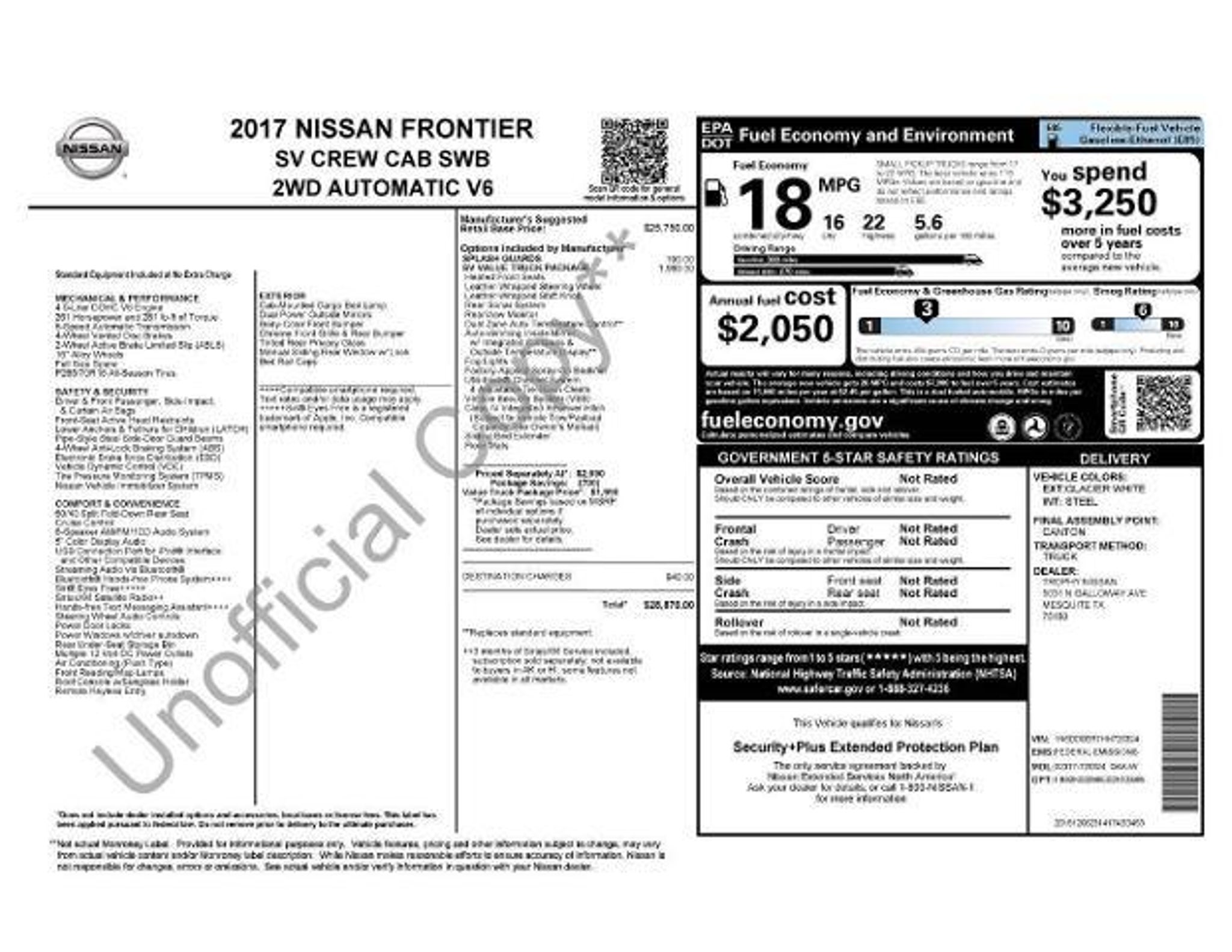 2017 Nissan Frontier 4X2 SV 4DR Crew Cab 5 FT. SB 5A