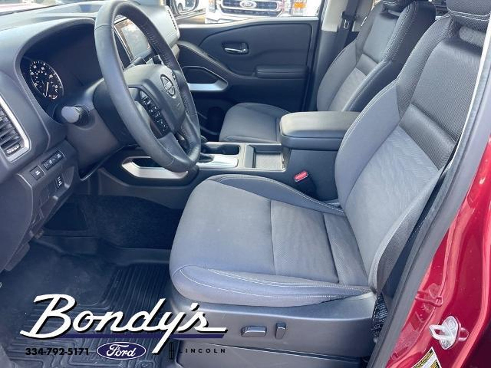 Priced below KBB Fair Purchase Price! Clean CARFAX. 2023 Nissan Frontier SV 120V Power Outlet in Bed, 120V Power Outlet in Rear Center Console, 17 Alloy Wheels, 3.692 Axle Ratio, 4-Wheel Disc Brakes, 6 Speakers, ABS brakes, Air Conditioning, Alloy wheels, AM/FM radio: SiriusXM, Anti-whiplash front head restraints, Apple CarPlay/Android Auto, Bed Access Package, Bed Under-Rail Lighting, Blind Spot Warning, Brake assist, Bumpers: body-color, Carpeted Floor Mats, Delay-off headlights, Driver door bin, Driver vanity mirror, Dual front impact airbags, Dual front side impact airbags, Electronic Stability Control, Electronic Tailgate Lock, Front anti-roll bar, Front Bucket Seats, Front Center Armrest, Front Halogen Fog Lights, Front reading lights, Front wheel independent suspension, Fully automatic headlights, Heated Front Seats, Heated Leather Steering Wheel, Heated Outside Mirrors, High Beam Assist (HBA), HVAC - Dual-Zone Front Auto A/C, I-Key w/Request Switches on O/S Handles, Illuminated entry, Illuminated Locking Glove Box, Intelligent Cruise Control, Knee airbag, Lane Departure Warning System, Leather Shift Lever, Low tire pressure warning, Occupant sensing airbag, Overhead airbag, Overhead Console Storage (Sunglass Holder), Panic alarm, Passenger door bin, Passenger vanity mirror, Power door mirrors, Power driver seat, Power steering, Power windows, Premium Cloth Seat Trim, Radio data system, Radio: SXM/AM/FM/AUX/USB Audio System w/6 Speakers, Rear anti-roll bar, Rear Automatic Braking (RAB), Rear Cross Traffic Alert (RCTA), Rear seat center armrest, Rear Sonar System, Rear step bumper, Remote Engine Starter, Remote keyless entry, Security system, Sliding Rear Window, Speed control, Speed-sensing steering, Splash Guards, Split folding rear seat, Spray-In Bedliner, Steering wheel mounted audio controls, SV Convenience Package, Tachometer, Technology Package, Tilt steering wheel, Tow Package: Hitch, Tow Harness, Tow/Haul Mode Switch, Traction control, Trailer Hitch w/Wiring Harness, Trip computer, Utili-Track System, Variably intermittent wipers, Voltmeter. Cardinal Red Metallic Tricoat RWD 3.8L DI DOHC 24V V6 9-Speed Automatic THIS VEHICLE IS LOCATED AT BONDY'S FORD LINCOLN AT 3615 ROSS CLARK CIRCLE DOTHAN, AL 36303. PLEASE CALL US AT 800-239-5171 TO ASK US ANY QUESTIONS! MON-FRI SALES IS HERE FROM 8:30 TO 7:00 AND SAT 8:30 TO 6:00. WE ARE CLOSED ON SUNDAYS. Call Toll Free 800-239-5171 or 334-792-5171.