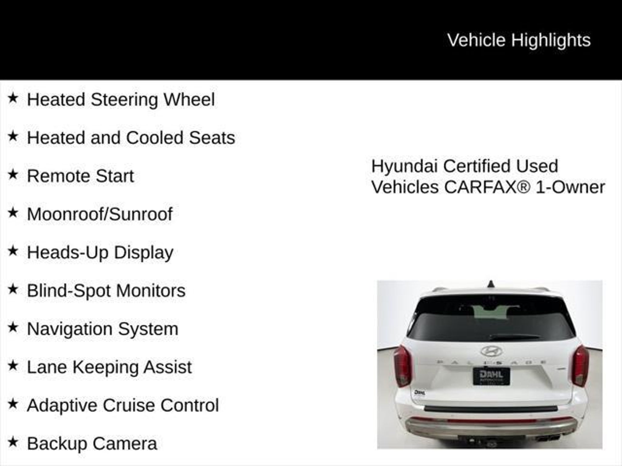 Certified. 2024 Hyper White Hyundai Palisade Calligraphy AWD 8-Speed Automatic with SHIFTRONIC V6 This Hyundai Palisade has many features and is well equipped including, Heated Steering Wheel, Heated and Cooled Seats, Remote Start, Moonroof/Sunroof, Heads-Up Display, Blind-Spot Monitors, Navigation System, Lane Keeping Assist, Adaptive Cruise Control, Backup Camera, Apple CarPlay, Android Auto, Keyless Access with Push Button Start, Bluetooth Hands-Free, Collision Avoidance System, Collision Warning System, Palisade Calligraphy, AWD, Automatic temperature control, harman/kardon Speakers, Heated rear seats, Power driver seat, Power Liftgate, Steering wheel mounted audio controls, Ventilated rear seats. Hyundai Certified Used Vehicles Details: * Roadside Assistance * Powertrain Limited Warranty: 120 Month/100,000 Mile (whichever comes first) from original in-service date * Includes 10-year/Unlimited Mileage Roadside Assistance with Rental Car and Trip Interruption Reimbursement; Please See Dealers for Specific Vehicle Eligibility Requirements. 10-Year/100,000 Mile Hybrid/EV Battery Warranty. 3-Months SiriusXM Trial Subscription. Complimentary 1 Year (Connected Care & Remote Pkgs). * Vehicle History * Limited Warranty: 60 Month/60,000 Mile (whichever comes first) from original in-service date * 173 Point Inspection * Warranty Deductible: $50 Choosing a DAHL USED CAR ADVANTAGE vehicle will give you the confidence your decision is a sound investment. A Dahl UCA vehicle provides you with a complete Superior Vehicle Detail, a 3-day money back guarantee or 30-day easy exchange option, plus a complimentary Autocheck vehicle history report. If only all life's decisions were this easy. To ensure that your recently purchased attractive-looking 2024 Hyundai Palisade remains in tip-top condition, we include the first scheduled maintenance appointment with every vehicle purchased.