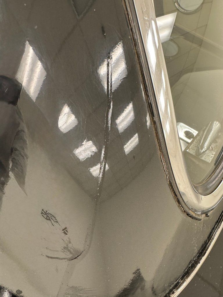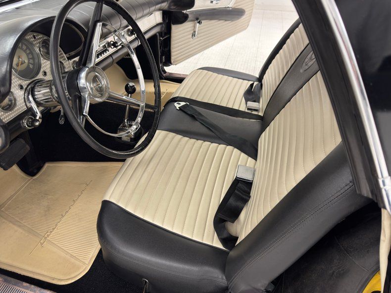 Black as night, this '57 features single stage Raven Black paint on both the body and the accessory hardtop. Looking for a bit of contrast? Utilize the white canvas top for a two tone profile, or put them all away and let the air flow! A razor straight shoulder line terminates with a pointed fin in back capping the round tail lights, solid red in our example. The rear bumper is noteworthy as it protrudes rearward with oval gaps that house the exhaust pipes, curving around to capture the license plate in the center. Obviously, the hardtop portholes are epic and legendary and fender skirts with gravel guard ornamentation add to the attractive profile with forward momentum portrayed in the front fender trim. The unmistakable face grins wide and is topped by the hood scoop that completes the sporty persona. Imperfections include some chips, a scratch and drip damage and paint runs on the hardtop, and some soiling and wear on the soft top. Overall however, this exterior is in very nice shape.