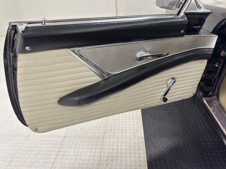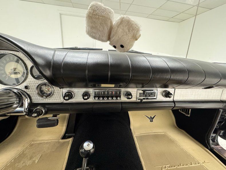 The black and white bench seat is in great shape, while the steering wheel, which was once glossy black, has a dull spot that tells a story and the metal horn ring is looking good. The dash, with its black pad on top and machined aluminum backing is in very good condition and the AM radio and vent control panel. Meanwhile, a ribbon of metal trim through the middle of the dash connects with the door trim and encircles the cabin in style. The short shifter rises from the transmission hump, covered in black loop carpet protected by white Thunderbird branded mats while the trunk is finished with a black mat and holds a spare.