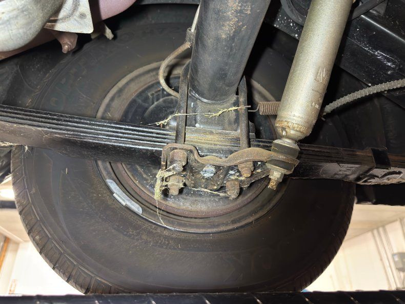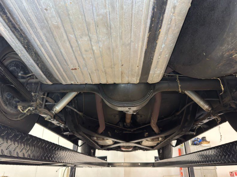 Overall clean underneath with surface rust reserved for the exhaust, the dual system that runs through clean stock style mufflers on their way to the rear bumper. The gas tank looks fairly fresh too and power drum brakes are found on all four wheels. Suspension consists of coil springs in front and leaf springs in back. We note some oil on the rear differential and a few drops on the front.