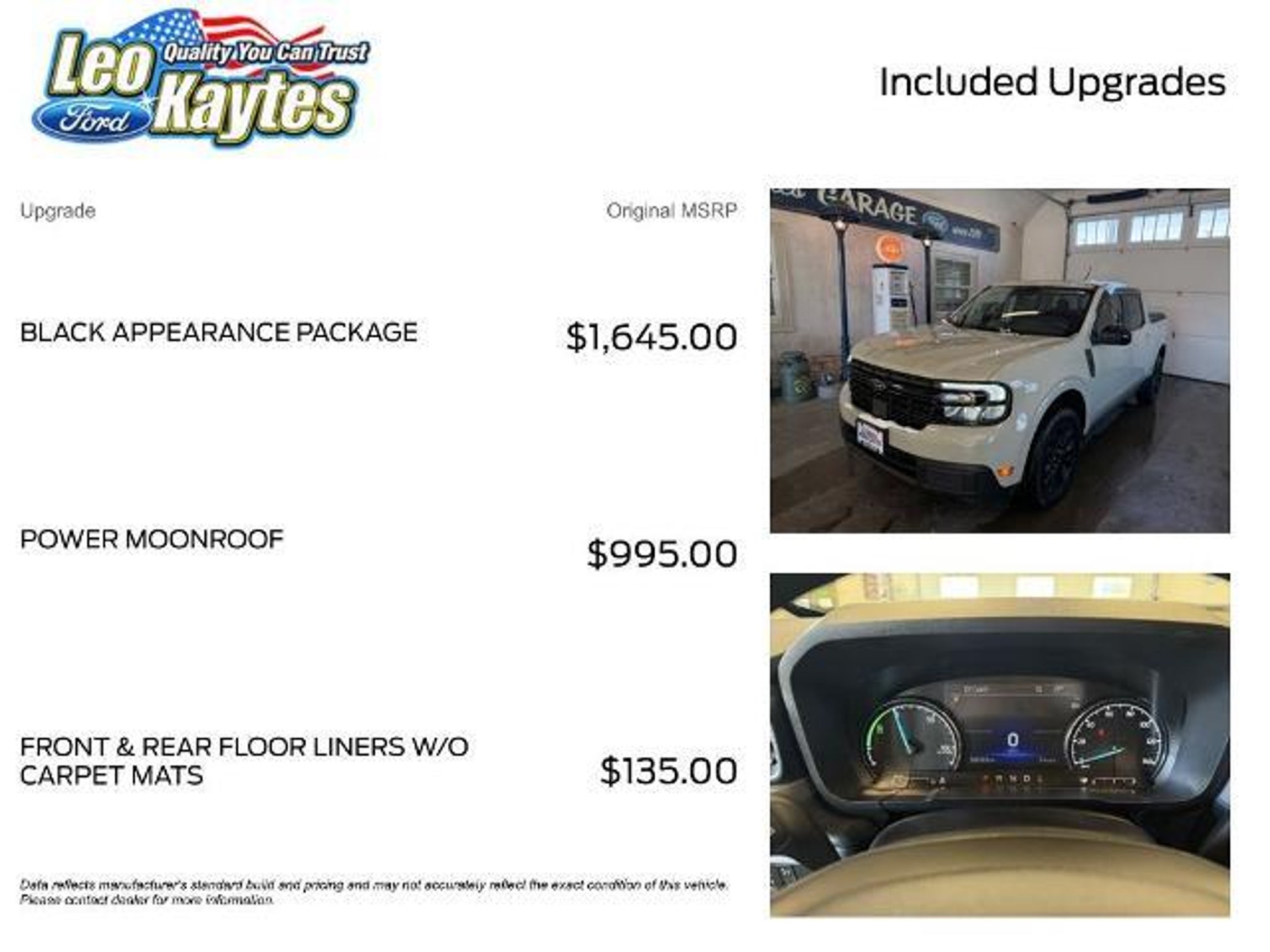 2024 Ford Maverick LARIAT HybridCARFAX One-Owner. Looking for efficiency, style, AND capability? This 2024 Ford Maverick Lariat Hybrid with only 15,139 miles is the perfect compact truck for commuting, hauling, and weekend adventures! Its striking Terrain exterior paired with Black Onyx interior makes it a true standout. â Key Specs 2.5L I-4 Hybrid Engine â incredible fuel economy CVT Transmission Front-Wheel Drive Stock#: P6855 Premium Tech & Entertainment B&O Sound System by Bang & Olufsen (8 speakers) SiriusXM Radio SYNC 3 Communications & Entertainment System Navigation System AM/FM radio Radio Data System ï Safety & Security 4-Wheel Disc Brakes Emergency 911 Assist Exterior Rear Parking Camera Multiple airbags: overhead, knee, occupant-sensing Security system Panic alarm Low tire pressure warning Rear anti-roll bar ï Interior Comfort & Convenience ActiveX Trimmed Front Bucket Seats Black interior accents Compass & Trip Computer Tilt & Telescoping Steering Wheel Steering Wheel Audio Controls Speed Control Remote Keyless Entry Front & Rear Floor Liners (no carpet mats) Black Appearance Package Features 18 Machined-Face Bright Aluminum Wheels and 18 Unique Machined-Face Ebony Aluminum Wheels (package-specific) Black Grille Black Headlamps Black Taillamps Front & Rear Black Edition Ford Logos Power Moonroof Rear Step Bumper Clean CARFAX. Odometer is 7590 miles below market average! 42/33 City/Highway MPG Includes 10year/100,000 Limited Powertrain Warranty - there are some exceptions.