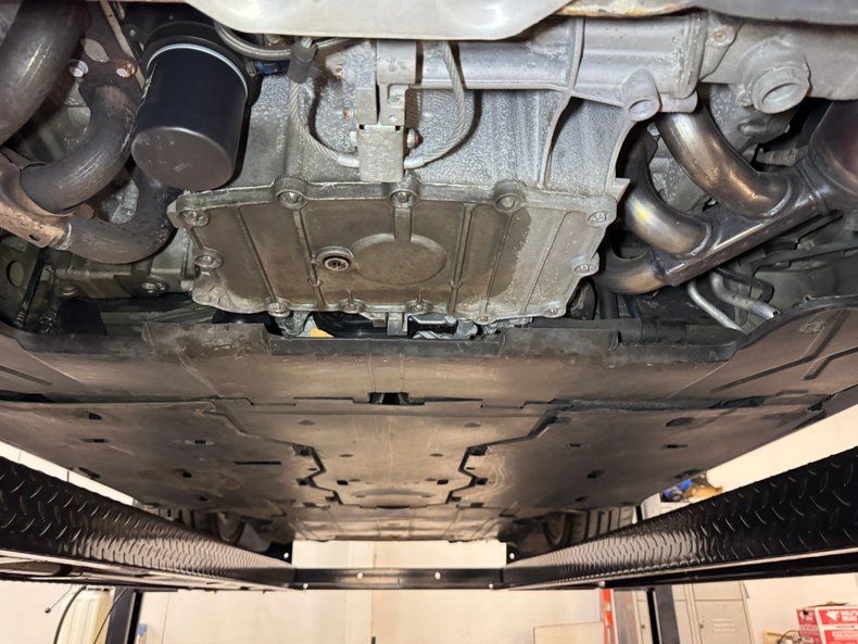Aerodynamic belly pans take up most of the underside where we find clean, driver quality condition, dry, (other than some residual oil on the pan), and showing not enough surface rust to mention. Dual exhaust flows through its original equipment system towards its exit via fused dual tips. Four wheel power disc brakes are on board and coil springs are front and rear augmented now by Bilstein PSS9 coil overs and Tarett Engineering lower control arms.