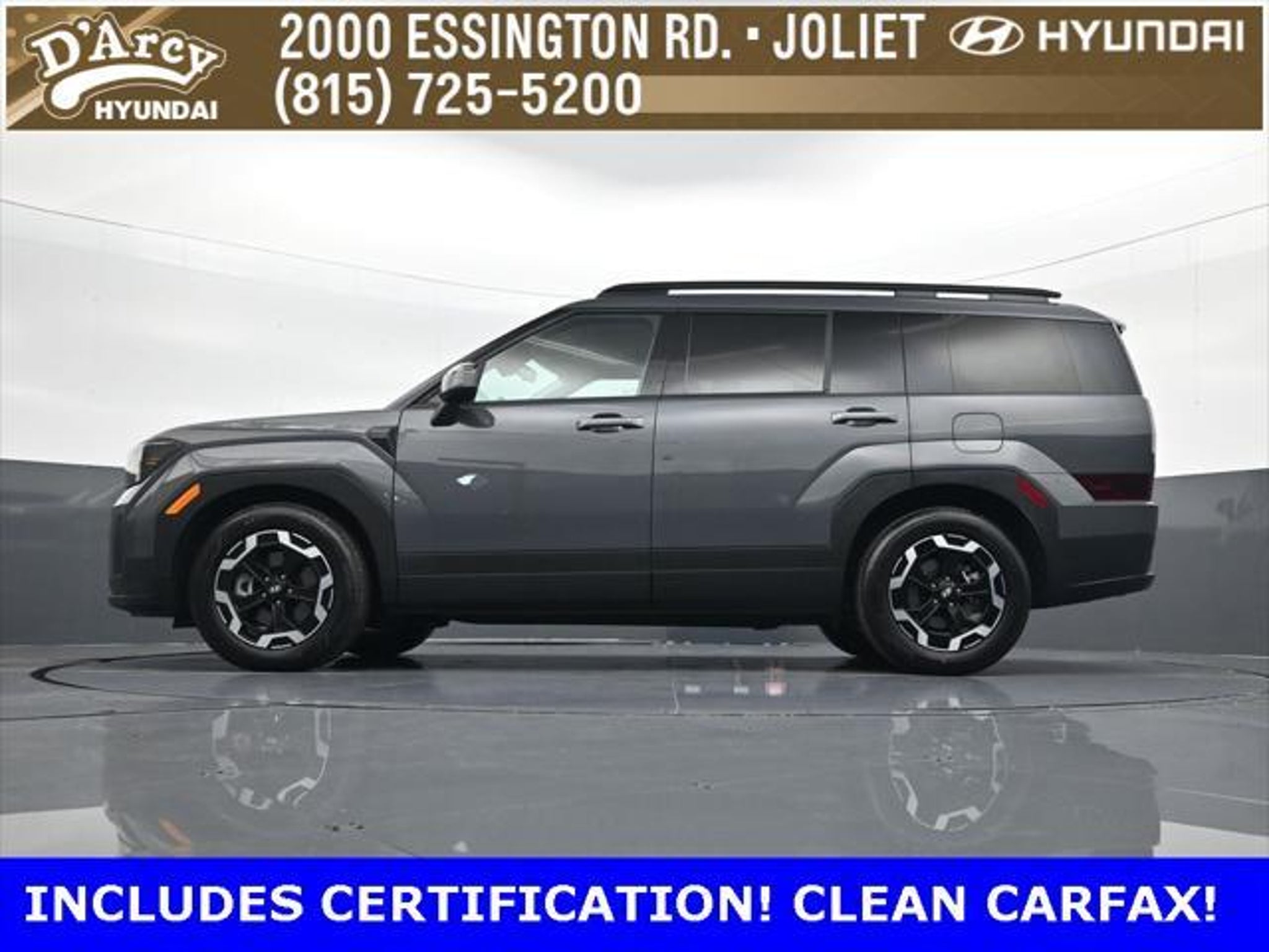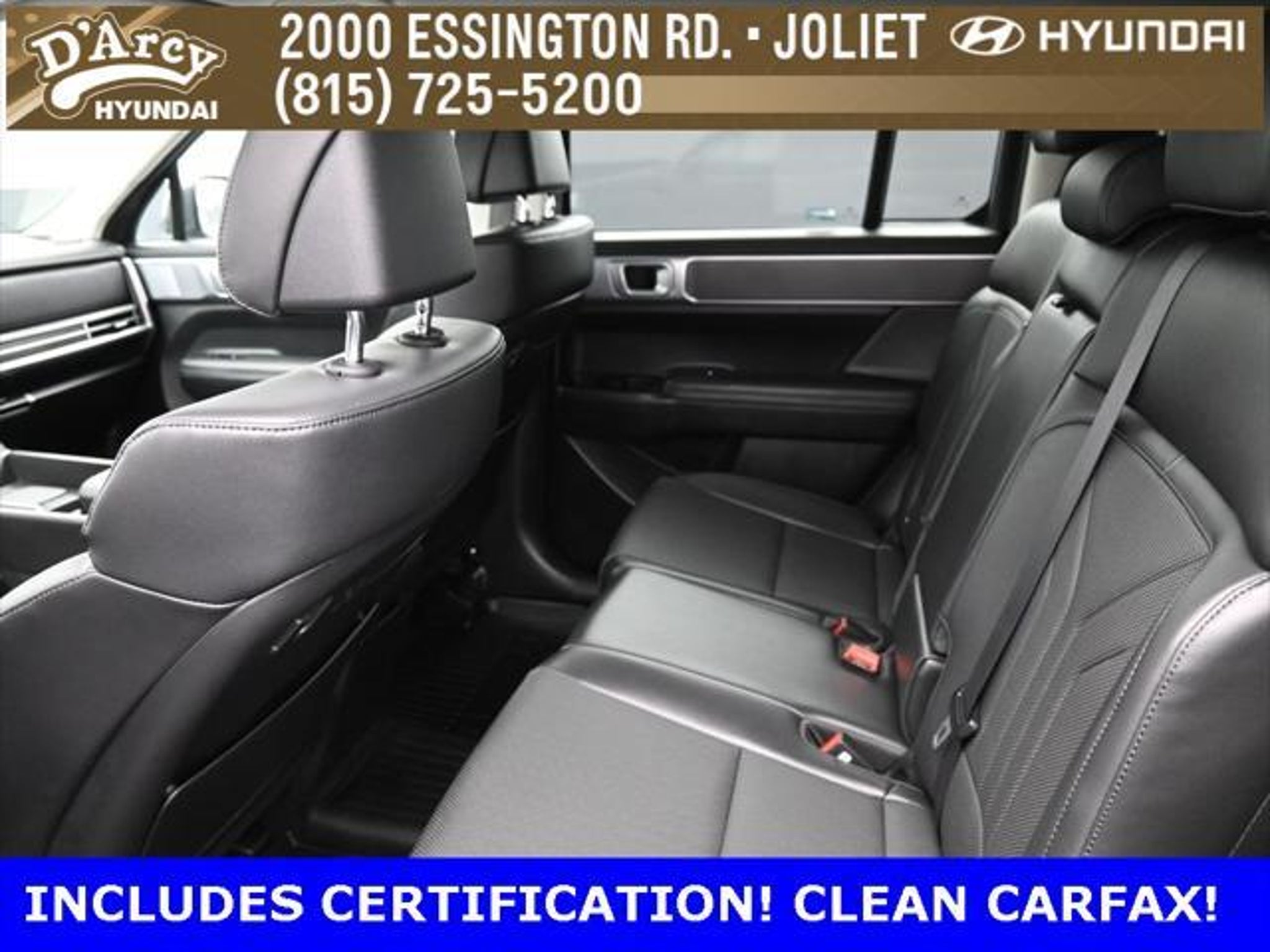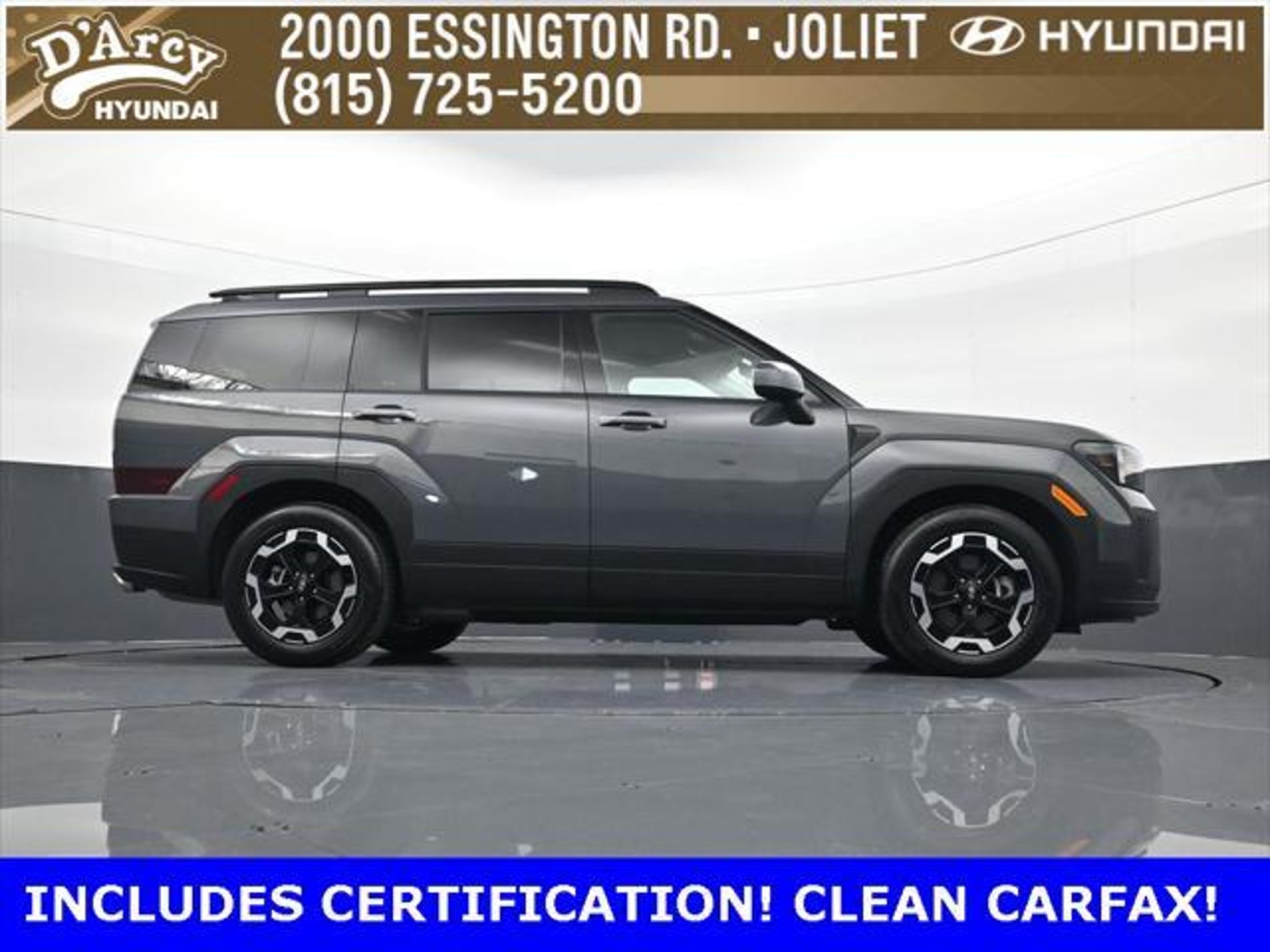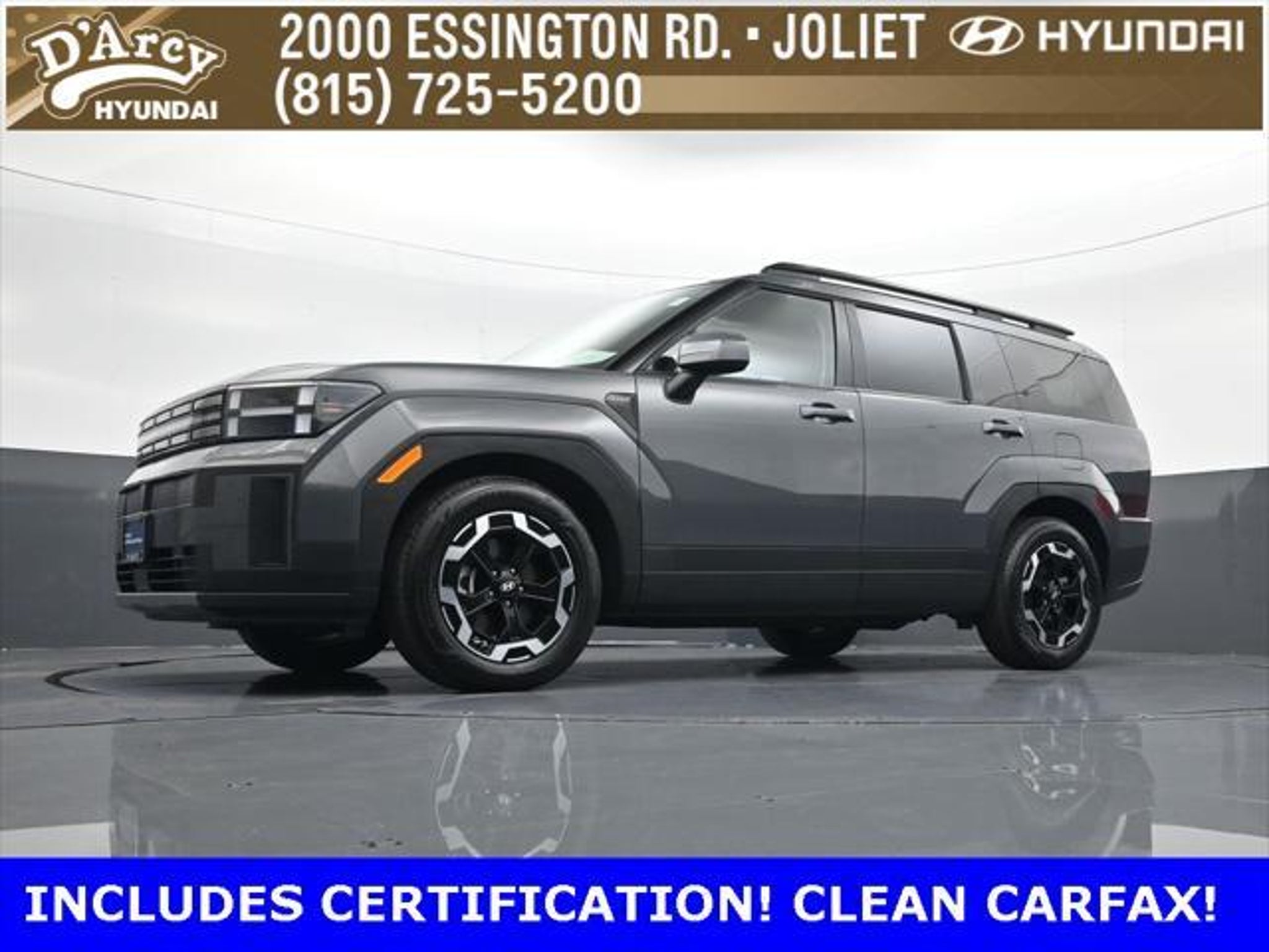 ONE OWNER LOCAL TRADE!, LOW MILES!, GREAT VEHICLE HISTORY!, REMAINING FULL FACTORY WARRANTY!, LEATHER!, BOUGHT HERE SERVICED HERE!, HYUNDAI CERTIFIED!, FULLY SERVICED AND READY TO GO!. Certified. Ecotronic Gray 2025 Hyundai Santa Fe SEL AWD Shiftronic 2.5L I4 Hyundai Certified Used Vehicles Details: * 173 Point Inspection * Powertrain Limited Warranty: 120 Month/100,000 Mile (whichever comes first) from original in-service date * Vehicle History * Limited Warranty: 60 Month/60,000 Mile (whichever comes first) from original in-service date * Includes 10-year/Unlimited Mileage Roadside Assistance with Rental Car and Trip Interruption Reimbursement; Please See Dealers for Specific Vehicle Eligibility Requirements. 10-Year/100,000 Mile Hybrid/EV Battery Warranty. 3-Months SiriusXM Trial Subscription. Complimentary 1 Year (Connected Care & Remote Pkgs). * Roadside Assistance * Warranty Deductible: $50 Discover the D'Arcy Difference! We care - we are here and we are ready to help! Stop by today to see up to date information, including showroom and service hours, and how to make an appointment or schedule delivery. D'Arcy Motors has been serving Joliet and its surrounding communities for over 25 years. Our business philosophy, which is to sell cars one car at a time and to make the guest the most important part of the process, has remained the same since 1991. Contact us today to experience the D'Arcy Difference! Pulse® Safer Braking Technology for $399 added to all New and CPO"“ The rear-end collision deterrent that rapidly pulses your third brake light four times before going solid when you press the brake pedal. This feature enhances safety by helping alert trailing drivers. Discover the D'Arcy Difference! We care - we are here and we are ready to help! Stop by today to see up to date information, including showroom and service hours, and how to make an appointment or schedule delivery. D'Arcy Motors has been serving Joliet and its surrounding communities for over 25 years. Our business philosophy, which is to sell cars one car at a time and to make the guest the most important part of the process, has remained the same since 1991. Contact us today to experience the D'Arcy Difference! Odometer is 7310 miles below market average! 20/28 City/Highway MPG This 2025 Hyundai Santa Fe comes equipped with: Option Group 01, 18 x 7.5J Alloy Wheels, 3rd row seats: bench, 4-Wheel Disc Brakes, 6 Speakers, ABS brakes, Air Conditioning, All Season Fitted Liners, Alloy wheels, AM/FM radio: SiriusXM, Apple CarPlay & Android Auto, Auto High-beam Headlights, Automatic temperature control, Brake assist, Bumpers: body-color, Carpeted Floor Mats, Delay-off headlights, Driver door bin, Driver vanity mirror, Dual front impact airbags, Dual front side impact airbags, Electronic Stability Control, Emergency communication system, Exterior Parking Camera Rear, Four wheel independent suspension, Front anti-roll bar, Front Bucket Seats, Front Center Armrest, Front dual zone A/C, Front reading lights, Fully automatic headlights, H-Tex Leatherette Seat Trim, Heated door mirrors, Heated Front Bucket Seats, Heated front seats, Illuminated entry, Knee airbag, Leather steering wheel, Low tire pressure warning, Occupant sensing airbag, Outside temperature display, Overhead airbag, Overhead console, Panic alarm, Passenger door bin, Passenger vanity mirror, Power door mirrors, Power driver seat, Power Liftgate, Power steering, Power windows, Radio: AM/FM/HD Display Audio, Rear anti-roll bar, Rear seat center armrest, Rear side impact airbag, Rear window defroster, Rear window wiper, Remote keyless entry, Security system, Speed control, Speed-sensing steering, Split folding rear seat, Spoiler, Steering wheel mounted audio controls, Tachometer, Telescoping steering wheel, Tilt steering wheel, Traction control, Trip computer, Turn signal indicator mirrors, and Variably intermittent wipers.