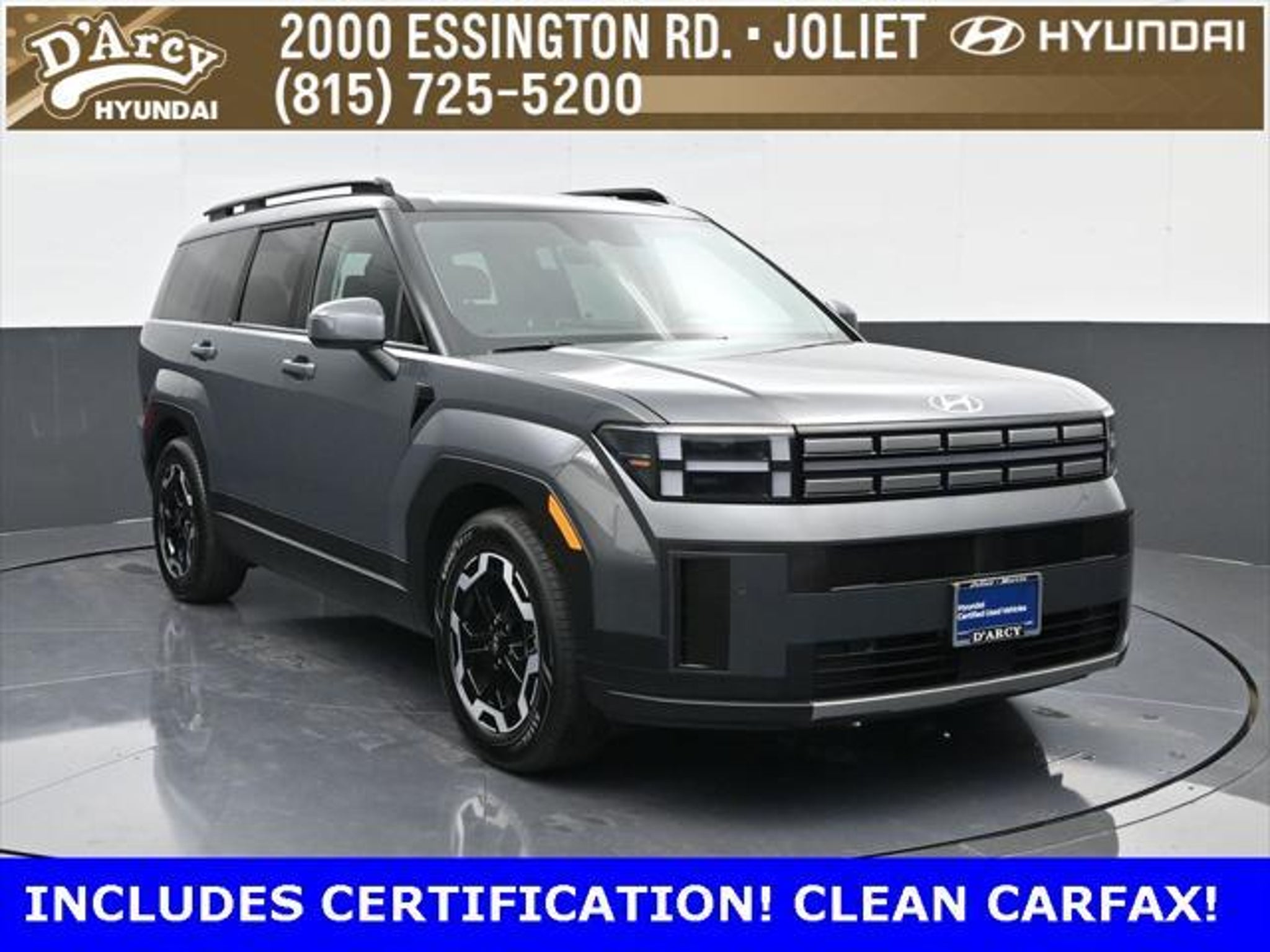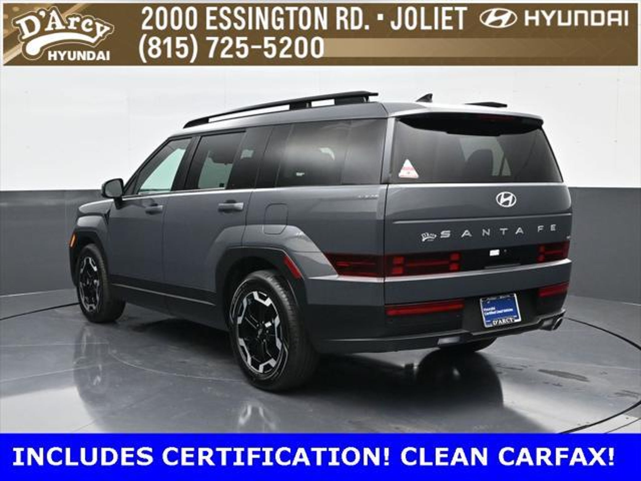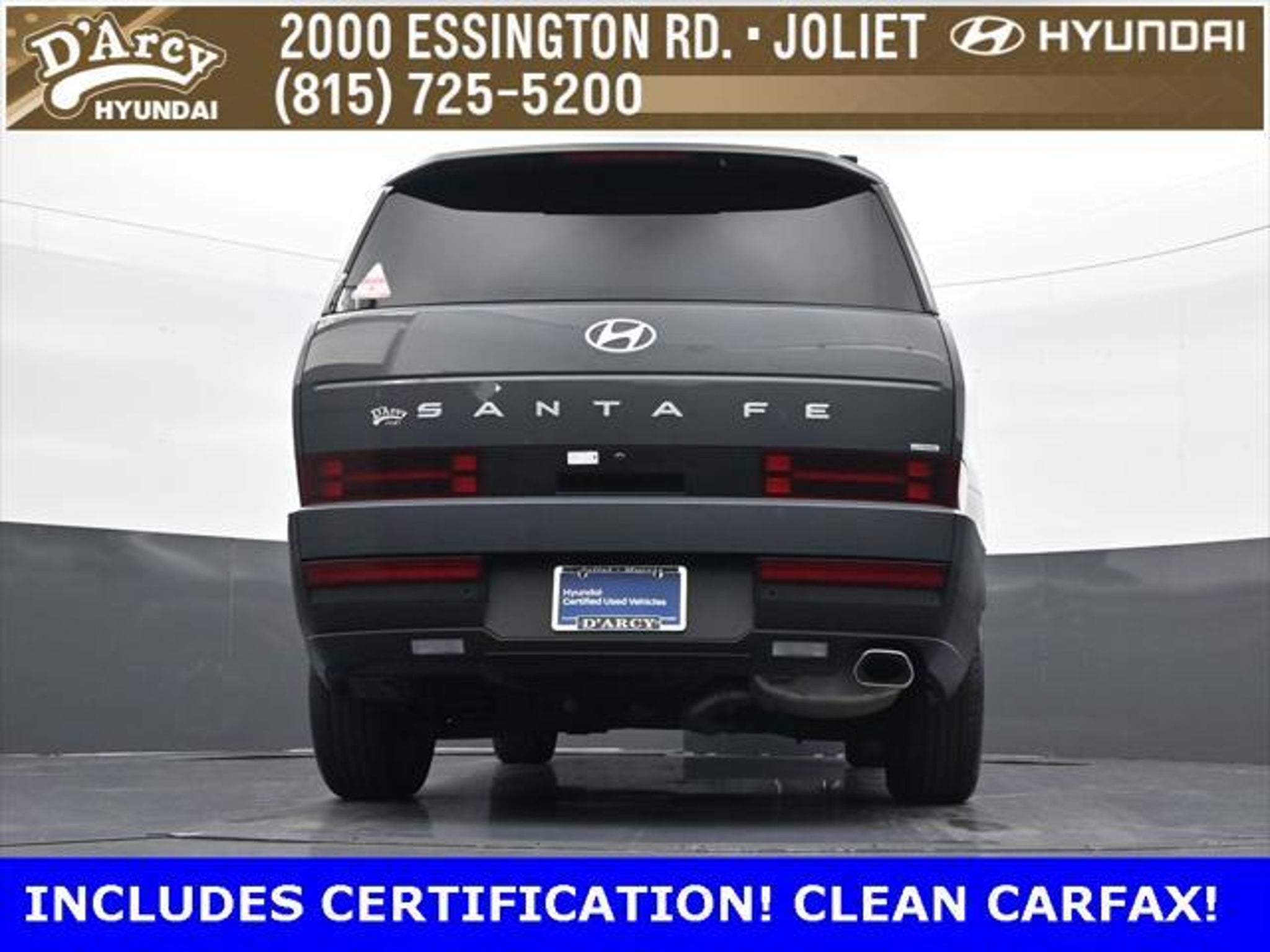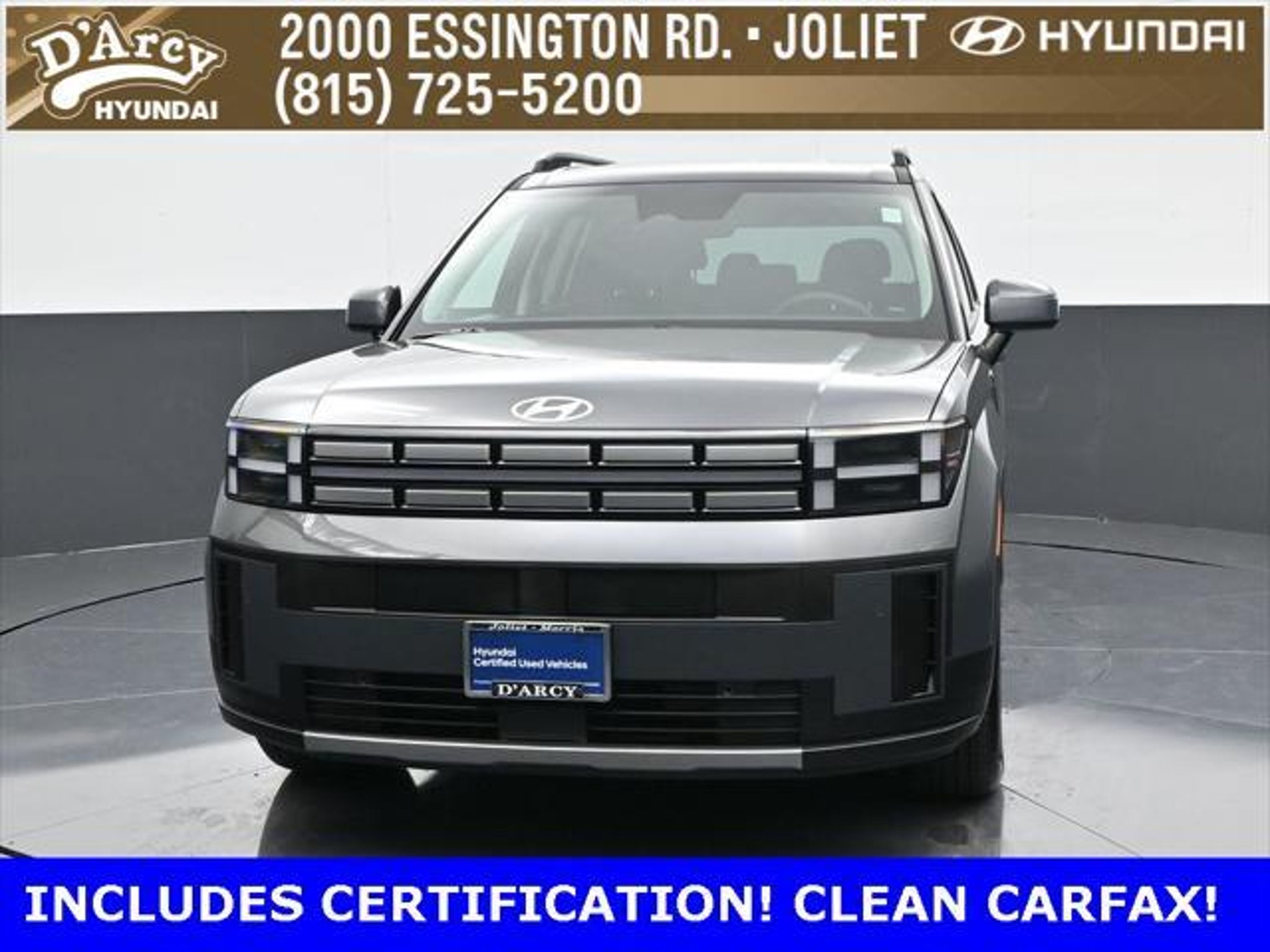 ONE OWNER LOCAL TRADE!, LOW MILES!, GREAT VEHICLE HISTORY!, REMAINING FULL FACTORY WARRANTY!, LEATHER!, BOUGHT HERE SERVICED HERE!, HYUNDAI CERTIFIED!, FULLY SERVICED AND READY TO GO!. Certified. Ecotronic Gray 2025 Hyundai Santa Fe SEL AWD Shiftronic 2.5L I4 Hyundai Certified Used Vehicles Details: * 173 Point Inspection * Powertrain Limited Warranty: 120 Month/100,000 Mile (whichever comes first) from original in-service date * Vehicle History * Limited Warranty: 60 Month/60,000 Mile (whichever comes first) from original in-service date * Includes 10-year/Unlimited Mileage Roadside Assistance with Rental Car and Trip Interruption Reimbursement; Please See Dealers for Specific Vehicle Eligibility Requirements. 10-Year/100,000 Mile Hybrid/EV Battery Warranty. 3-Months SiriusXM Trial Subscription. Complimentary 1 Year (Connected Care & Remote Pkgs). * Roadside Assistance * Warranty Deductible: $50 Discover the D'Arcy Difference! We care - we are here and we are ready to help! Stop by today to see up to date information, including showroom and service hours, and how to make an appointment or schedule delivery. D'Arcy Motors has been serving Joliet and its surrounding communities for over 25 years. Our business philosophy, which is to sell cars one car at a time and to make the guest the most important part of the process, has remained the same since 1991. Contact us today to experience the D'Arcy Difference! Pulse® Safer Braking Technology for $399 added to all New and CPO"“ The rear-end collision deterrent that rapidly pulses your third brake light four times before going solid when you press the brake pedal. This feature enhances safety by helping alert trailing drivers. Discover the D'Arcy Difference! We care - we are here and we are ready to help! Stop by today to see up to date information, including showroom and service hours, and how to make an appointment or schedule delivery. D'Arcy Motors has been serving Joliet and its surrounding communities for over 25 years. Our business philosophy, which is to sell cars one car at a time and to make the guest the most important part of the process, has remained the same since 1991. Contact us today to experience the D'Arcy Difference! Odometer is 7310 miles below market average! 20/28 City/Highway MPG This 2025 Hyundai Santa Fe comes equipped with: Option Group 01, 18 x 7.5J Alloy Wheels, 3rd row seats: bench, 4-Wheel Disc Brakes, 6 Speakers, ABS brakes, Air Conditioning, All Season Fitted Liners, Alloy wheels, AM/FM radio: SiriusXM, Apple CarPlay & Android Auto, Auto High-beam Headlights, Automatic temperature control, Brake assist, Bumpers: body-color, Carpeted Floor Mats, Delay-off headlights, Driver door bin, Driver vanity mirror, Dual front impact airbags, Dual front side impact airbags, Electronic Stability Control, Emergency communication system, Exterior Parking Camera Rear, Four wheel independent suspension, Front anti-roll bar, Front Bucket Seats, Front Center Armrest, Front dual zone A/C, Front reading lights, Fully automatic headlights, H-Tex Leatherette Seat Trim, Heated door mirrors, Heated Front Bucket Seats, Heated front seats, Illuminated entry, Knee airbag, Leather steering wheel, Low tire pressure warning, Occupant sensing airbag, Outside temperature display, Overhead airbag, Overhead console, Panic alarm, Passenger door bin, Passenger vanity mirror, Power door mirrors, Power driver seat, Power Liftgate, Power steering, Power windows, Radio: AM/FM/HD Display Audio, Rear anti-roll bar, Rear seat center armrest, Rear side impact airbag, Rear window defroster, Rear window wiper, Remote keyless entry, Security system, Speed control, Speed-sensing steering, Split folding rear seat, Spoiler, Steering wheel mounted audio controls, Tachometer, Telescoping steering wheel, Tilt steering wheel, Traction control, Trip computer, Turn signal indicator mirrors, and Variably intermittent wipers.