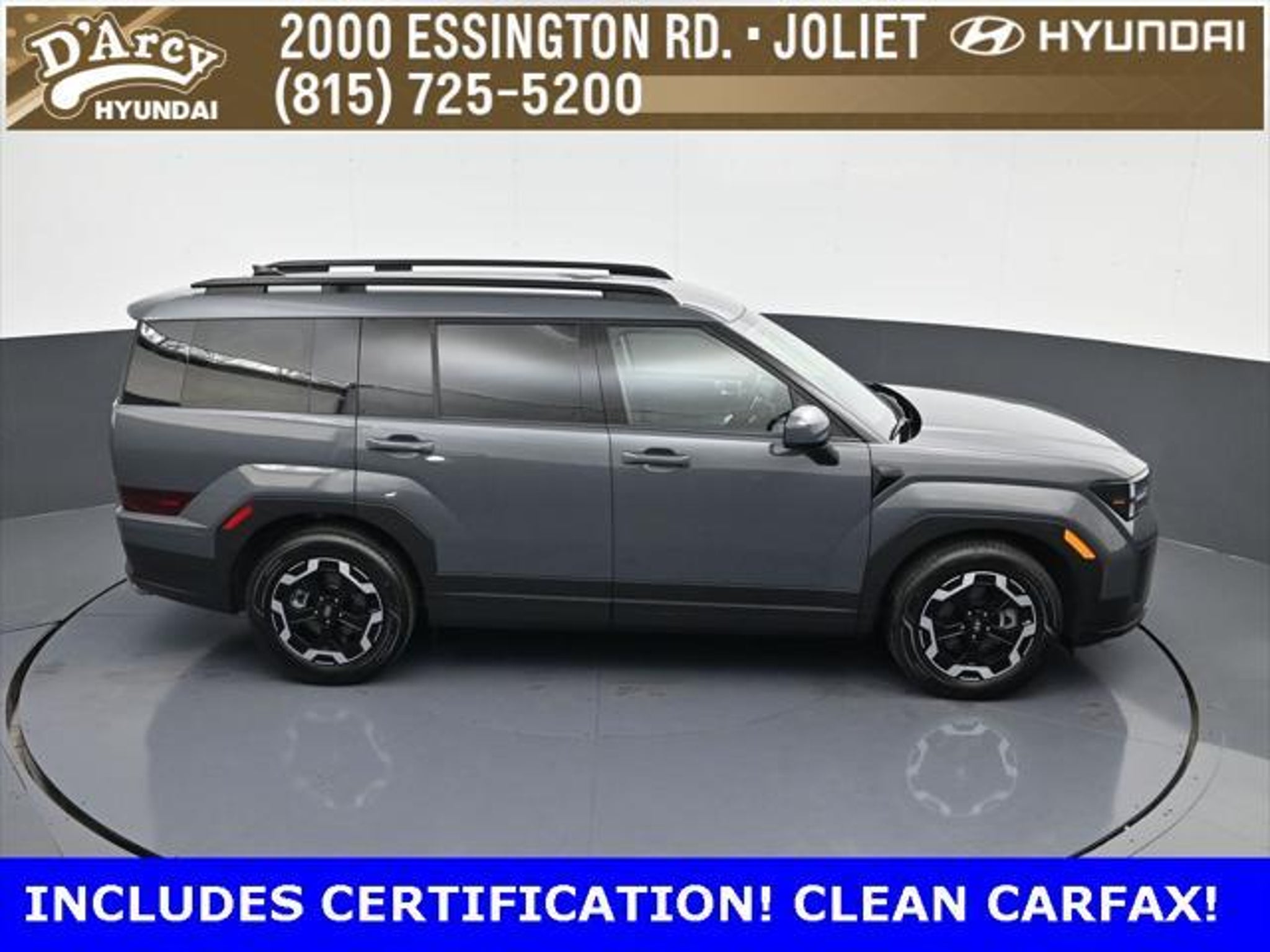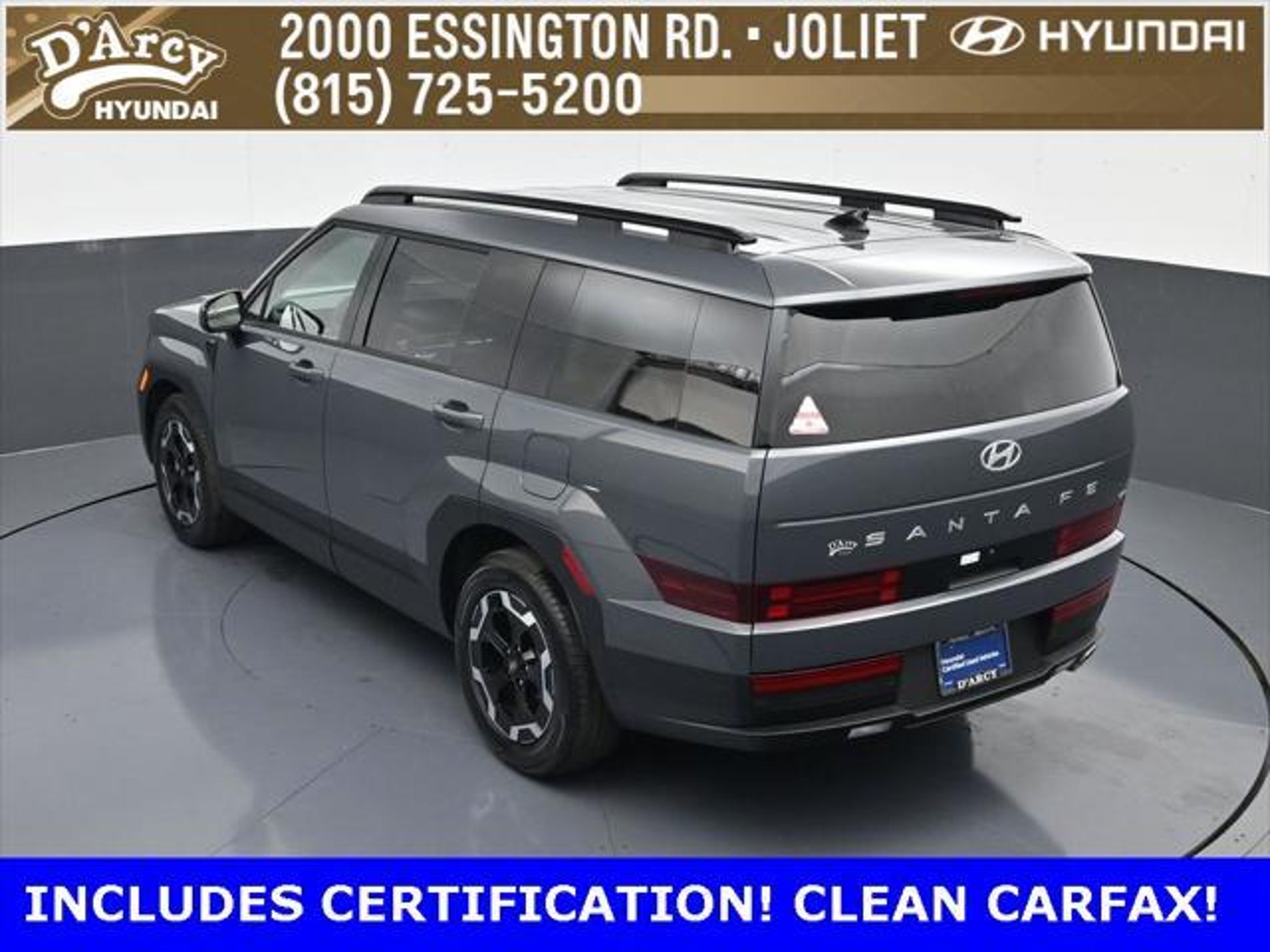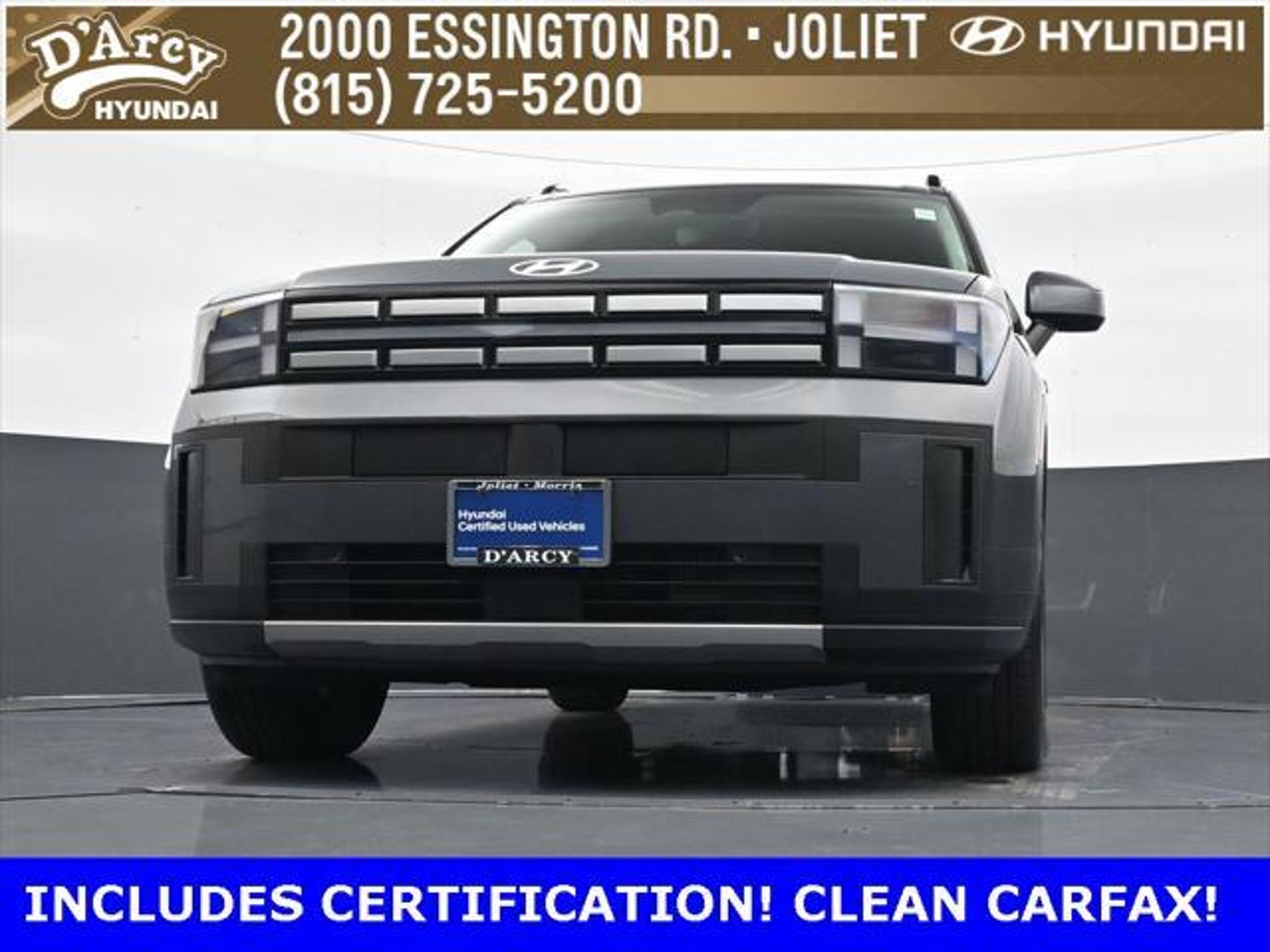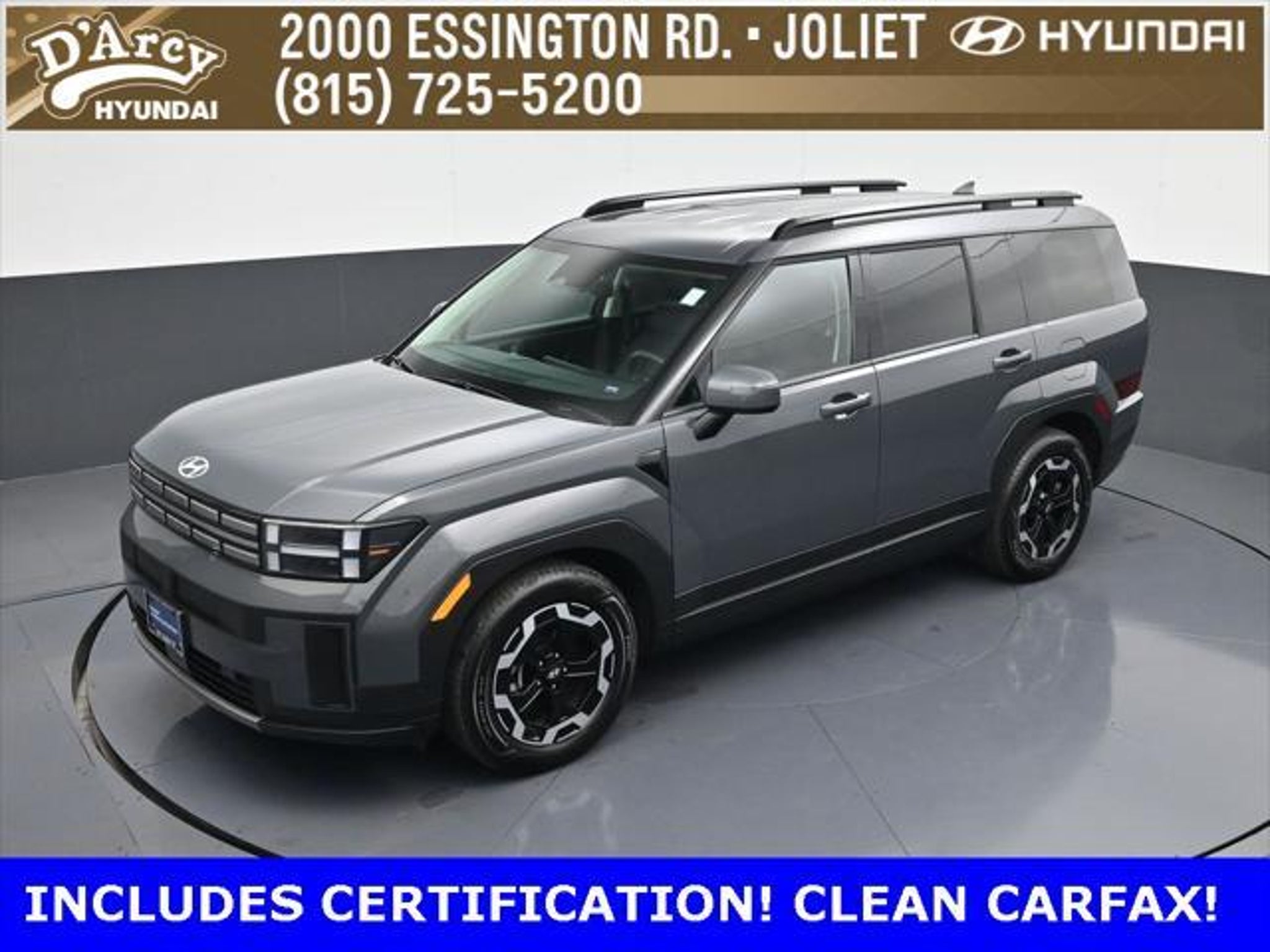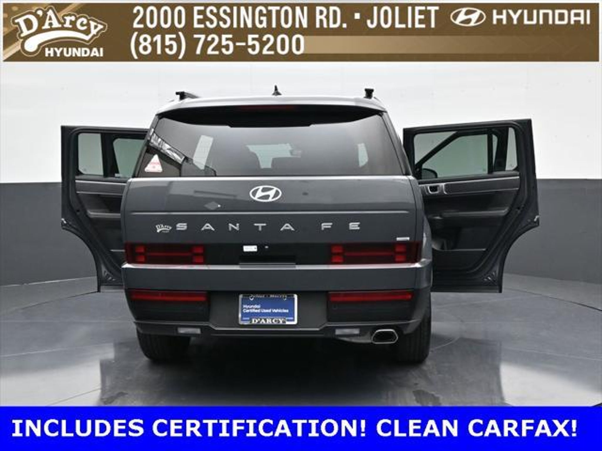 ONE OWNER LOCAL TRADE!, LOW MILES!, GREAT VEHICLE HISTORY!, REMAINING FULL FACTORY WARRANTY!, LEATHER!, BOUGHT HERE SERVICED HERE!, HYUNDAI CERTIFIED!, FULLY SERVICED AND READY TO GO!. Certified. Ecotronic Gray 2025 Hyundai Santa Fe SEL AWD Shiftronic 2.5L I4 Hyundai Certified Used Vehicles Details: * 173 Point Inspection * Powertrain Limited Warranty: 120 Month/100,000 Mile (whichever comes first) from original in-service date * Vehicle History * Limited Warranty: 60 Month/60,000 Mile (whichever comes first) from original in-service date * Includes 10-year/Unlimited Mileage Roadside Assistance with Rental Car and Trip Interruption Reimbursement; Please See Dealers for Specific Vehicle Eligibility Requirements. 10-Year/100,000 Mile Hybrid/EV Battery Warranty. 3-Months SiriusXM Trial Subscription. Complimentary 1 Year (Connected Care & Remote Pkgs). * Roadside Assistance * Warranty Deductible: $50 Discover the D'Arcy Difference! We care - we are here and we are ready to help! Stop by today to see up to date information, including showroom and service hours, and how to make an appointment or schedule delivery. D'Arcy Motors has been serving Joliet and its surrounding communities for over 25 years. Our business philosophy, which is to sell cars one car at a time and to make the guest the most important part of the process, has remained the same since 1991. Contact us today to experience the D'Arcy Difference! Pulse® Safer Braking Technology for $399 added to all New and CPO"“ The rear-end collision deterrent that rapidly pulses your third brake light four times before going solid when you press the brake pedal. This feature enhances safety by helping alert trailing drivers. Discover the D'Arcy Difference! We care - we are here and we are ready to help! Stop by today to see up to date information, including showroom and service hours, and how to make an appointment or schedule delivery. D'Arcy Motors has been serving Joliet and its surrounding communities for over 25 years. Our business philosophy, which is to sell cars one car at a time and to make the guest the most important part of the process, has remained the same since 1991. Contact us today to experience the D'Arcy Difference! Odometer is 7310 miles below market average! 20/28 City/Highway MPG This 2025 Hyundai Santa Fe comes equipped with: Option Group 01, 18 x 7.5J Alloy Wheels, 3rd row seats: bench, 4-Wheel Disc Brakes, 6 Speakers, ABS brakes, Air Conditioning, All Season Fitted Liners, Alloy wheels, AM/FM radio: SiriusXM, Apple CarPlay & Android Auto, Auto High-beam Headlights, Automatic temperature control, Brake assist, Bumpers: body-color, Carpeted Floor Mats, Delay-off headlights, Driver door bin, Driver vanity mirror, Dual front impact airbags, Dual front side impact airbags, Electronic Stability Control, Emergency communication system, Exterior Parking Camera Rear, Four wheel independent suspension, Front anti-roll bar, Front Bucket Seats, Front Center Armrest, Front dual zone A/C, Front reading lights, Fully automatic headlights, H-Tex Leatherette Seat Trim, Heated door mirrors, Heated Front Bucket Seats, Heated front seats, Illuminated entry, Knee airbag, Leather steering wheel, Low tire pressure warning, Occupant sensing airbag, Outside temperature display, Overhead airbag, Overhead console, Panic alarm, Passenger door bin, Passenger vanity mirror, Power door mirrors, Power driver seat, Power Liftgate, Power steering, Power windows, Radio: AM/FM/HD Display Audio, Rear anti-roll bar, Rear seat center armrest, Rear side impact airbag, Rear window defroster, Rear window wiper, Remote keyless entry, Security system, Speed control, Speed-sensing steering, Split folding rear seat, Spoiler, Steering wheel mounted audio controls, Tachometer, Telescoping steering wheel, Tilt steering wheel, Traction control, Trip computer, Turn signal indicator mirrors, and Variably intermittent wipers.