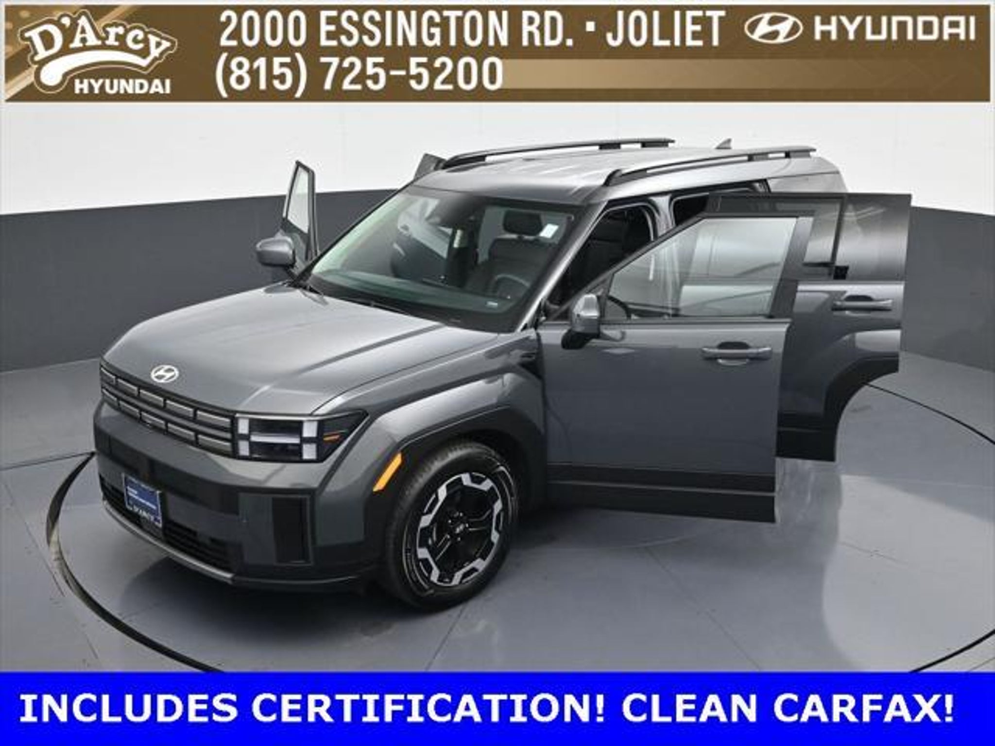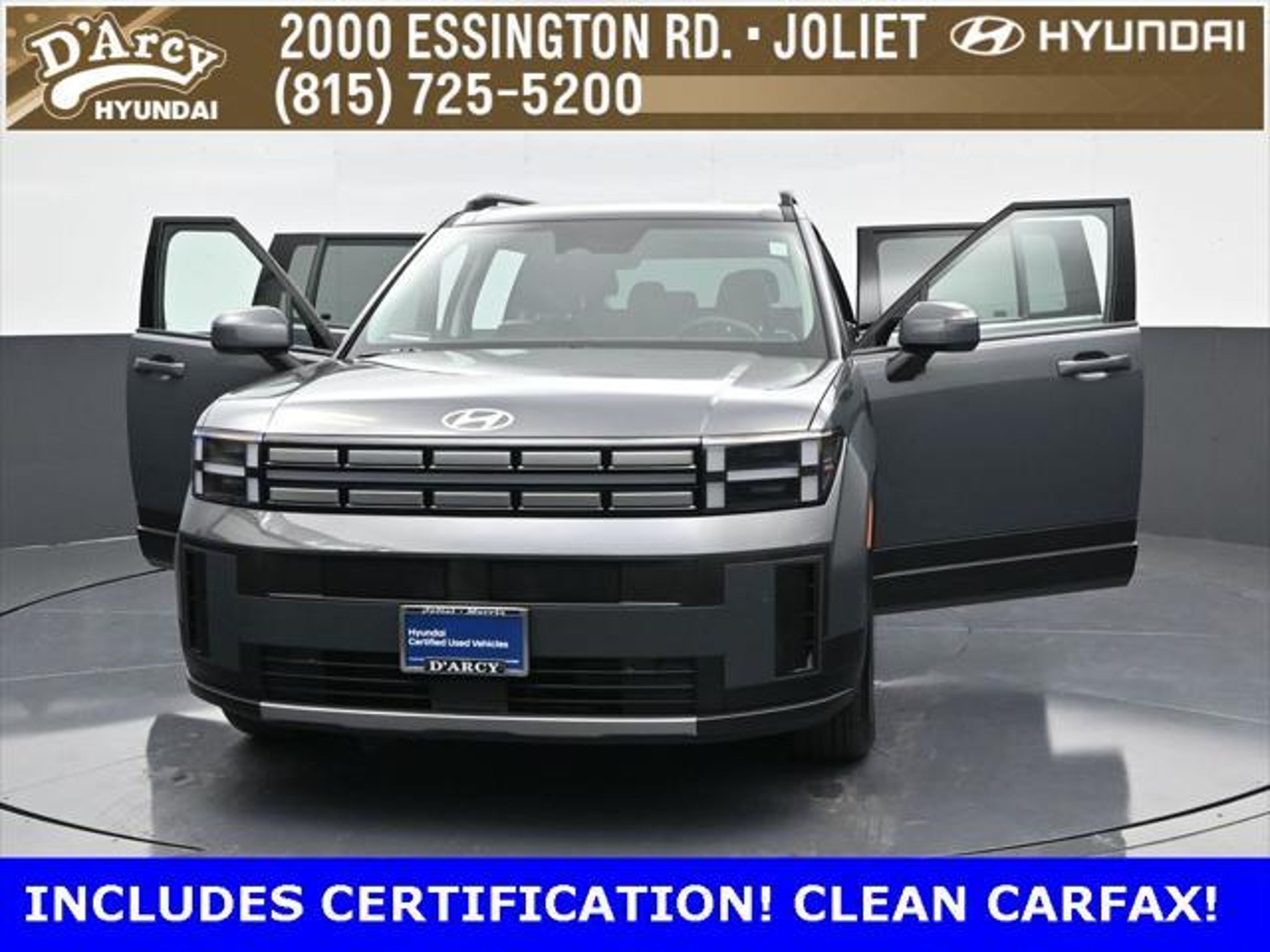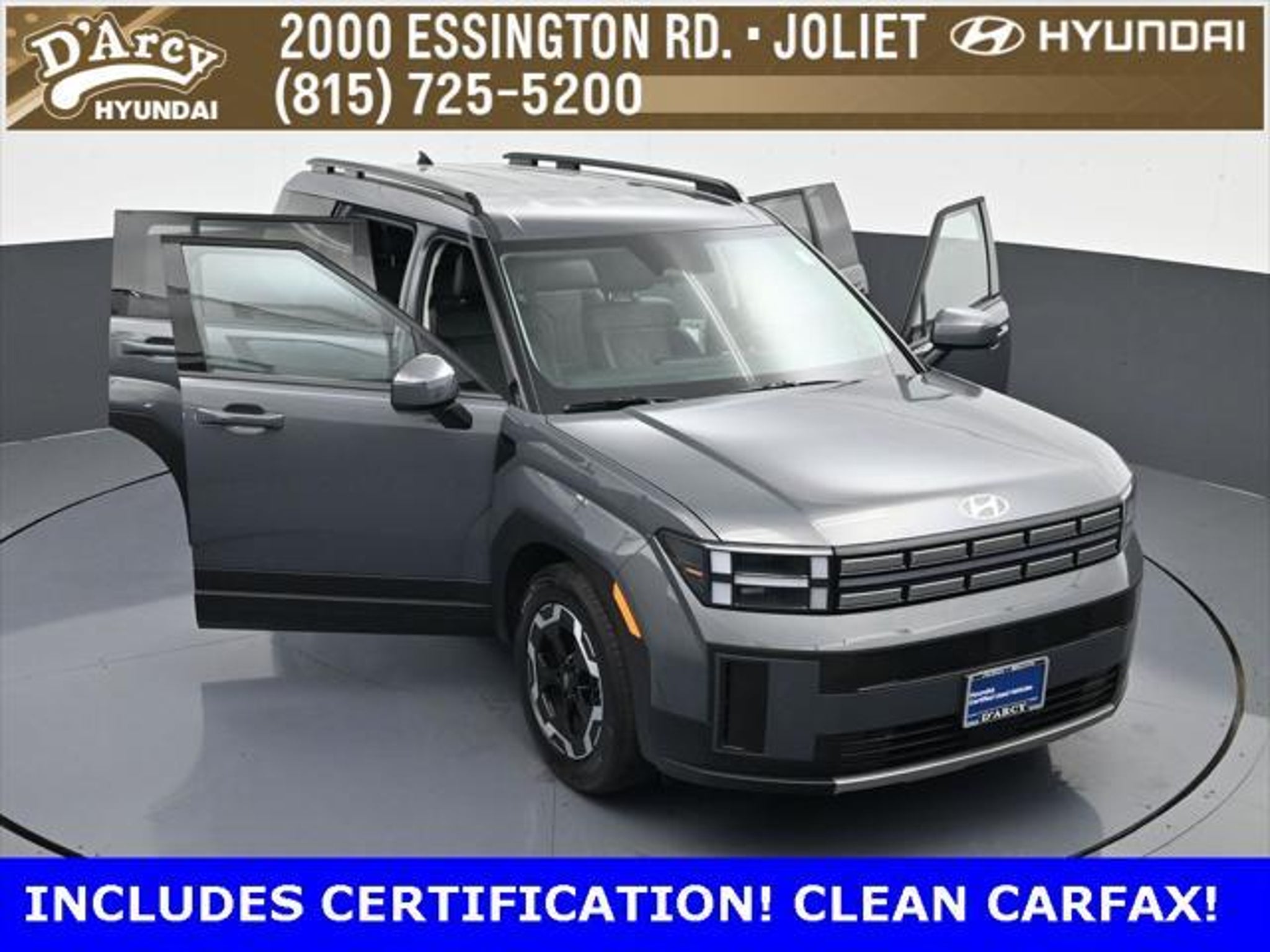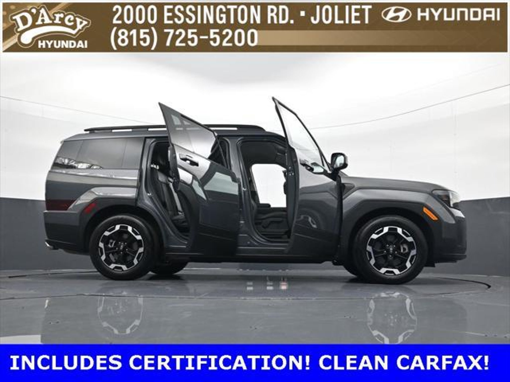 ONE OWNER LOCAL TRADE!, LOW MILES!, GREAT VEHICLE HISTORY!, REMAINING FULL FACTORY WARRANTY!, LEATHER!, BOUGHT HERE SERVICED HERE!, HYUNDAI CERTIFIED!, FULLY SERVICED AND READY TO GO!. Certified. Ecotronic Gray 2025 Hyundai Santa Fe SEL AWD Shiftronic 2.5L I4 Hyundai Certified Used Vehicles Details: * 173 Point Inspection * Powertrain Limited Warranty: 120 Month/100,000 Mile (whichever comes first) from original in-service date * Vehicle History * Limited Warranty: 60 Month/60,000 Mile (whichever comes first) from original in-service date * Includes 10-year/Unlimited Mileage Roadside Assistance with Rental Car and Trip Interruption Reimbursement; Please See Dealers for Specific Vehicle Eligibility Requirements. 10-Year/100,000 Mile Hybrid/EV Battery Warranty. 3-Months SiriusXM Trial Subscription. Complimentary 1 Year (Connected Care & Remote Pkgs). * Roadside Assistance * Warranty Deductible: $50 Discover the D'Arcy Difference! We care - we are here and we are ready to help! Stop by today to see up to date information, including showroom and service hours, and how to make an appointment or schedule delivery. D'Arcy Motors has been serving Joliet and its surrounding communities for over 25 years. Our business philosophy, which is to sell cars one car at a time and to make the guest the most important part of the process, has remained the same since 1991. Contact us today to experience the D'Arcy Difference! Pulse® Safer Braking Technology for $399 added to all New and CPO"“ The rear-end collision deterrent that rapidly pulses your third brake light four times before going solid when you press the brake pedal. This feature enhances safety by helping alert trailing drivers. Discover the D'Arcy Difference! We care - we are here and we are ready to help! Stop by today to see up to date information, including showroom and service hours, and how to make an appointment or schedule delivery. D'Arcy Motors has been serving Joliet and its surrounding communities for over 25 years. Our business philosophy, which is to sell cars one car at a time and to make the guest the most important part of the process, has remained the same since 1991. Contact us today to experience the D'Arcy Difference! Odometer is 7310 miles below market average! 20/28 City/Highway MPG This 2025 Hyundai Santa Fe comes equipped with: Option Group 01, 18 x 7.5J Alloy Wheels, 3rd row seats: bench, 4-Wheel Disc Brakes, 6 Speakers, ABS brakes, Air Conditioning, All Season Fitted Liners, Alloy wheels, AM/FM radio: SiriusXM, Apple CarPlay & Android Auto, Auto High-beam Headlights, Automatic temperature control, Brake assist, Bumpers: body-color, Carpeted Floor Mats, Delay-off headlights, Driver door bin, Driver vanity mirror, Dual front impact airbags, Dual front side impact airbags, Electronic Stability Control, Emergency communication system, Exterior Parking Camera Rear, Four wheel independent suspension, Front anti-roll bar, Front Bucket Seats, Front Center Armrest, Front dual zone A/C, Front reading lights, Fully automatic headlights, H-Tex Leatherette Seat Trim, Heated door mirrors, Heated Front Bucket Seats, Heated front seats, Illuminated entry, Knee airbag, Leather steering wheel, Low tire pressure warning, Occupant sensing airbag, Outside temperature display, Overhead airbag, Overhead console, Panic alarm, Passenger door bin, Passenger vanity mirror, Power door mirrors, Power driver seat, Power Liftgate, Power steering, Power windows, Radio: AM/FM/HD Display Audio, Rear anti-roll bar, Rear seat center armrest, Rear side impact airbag, Rear window defroster, Rear window wiper, Remote keyless entry, Security system, Speed control, Speed-sensing steering, Split folding rear seat, Spoiler, Steering wheel mounted audio controls, Tachometer, Telescoping steering wheel, Tilt steering wheel, Traction control, Trip computer, Turn signal indicator mirrors, and Variably intermittent wipers.