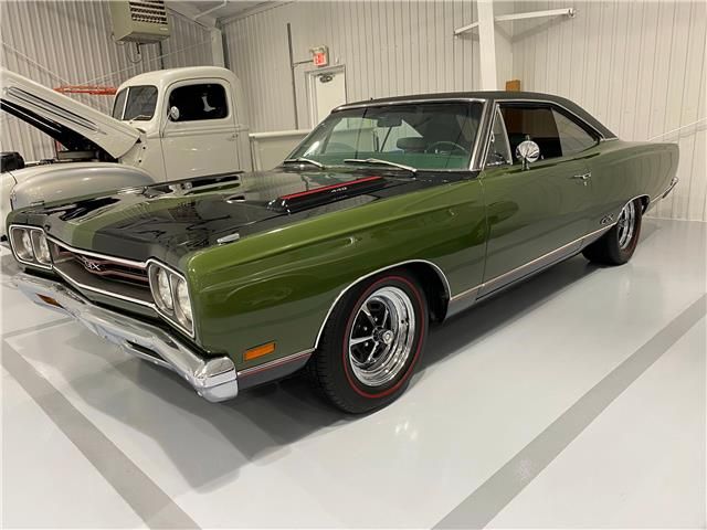 Featuring an exceptionally well detailed rotisserie restoration, this 1969 Plymouth GTX hardtop is a show-quality example from top to bottom, including the fully restored underbody, chassis and suspension. Finished in Ivy Green with painted Black stripes under clear coat, the GTX is complemented by a Black textured vinyl roof and outstanding chrome and bright trim. The Green-upholstered interior is impressive in keeping with the rest of the car and features bucket seats, OEM seat belts, a center console, floor shifter, and the Chrysler Solid State AM radio has been upgraded to a Bluetooth factory look-a-like for modern sound, with the original AM radio in the trunk. In addition to a dash-mounted factory tachometer, instruments include added Sunproof coolant-temperature and oil pressure gauges. Air conditioning, including a modern r134a compressor with a polished housing, delivers additional comfort. The tinted rear window and all side windows are OEM Chrysler “Safeguard" scripted glass items.