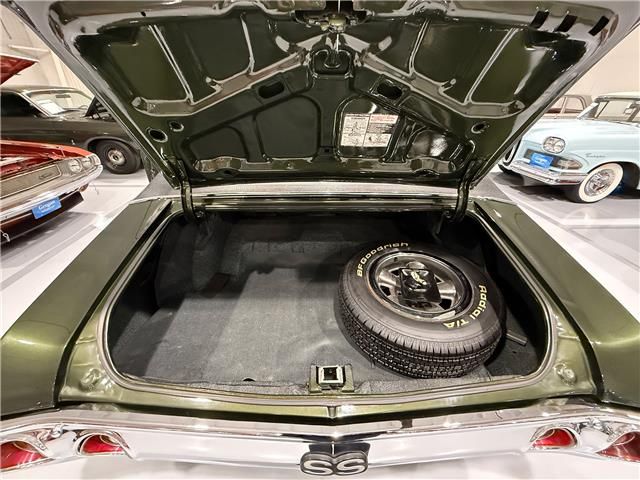 The exterior is finished in its original Antique Green Metallic, accented by black SS stripes, a cowl induction hood, and a black vinyl top. This combination looks absolutely stunning in person, giving the car a timeless muscle car stance. The body is solid, straight, and rust free, showing high-quality workmanship throughout.