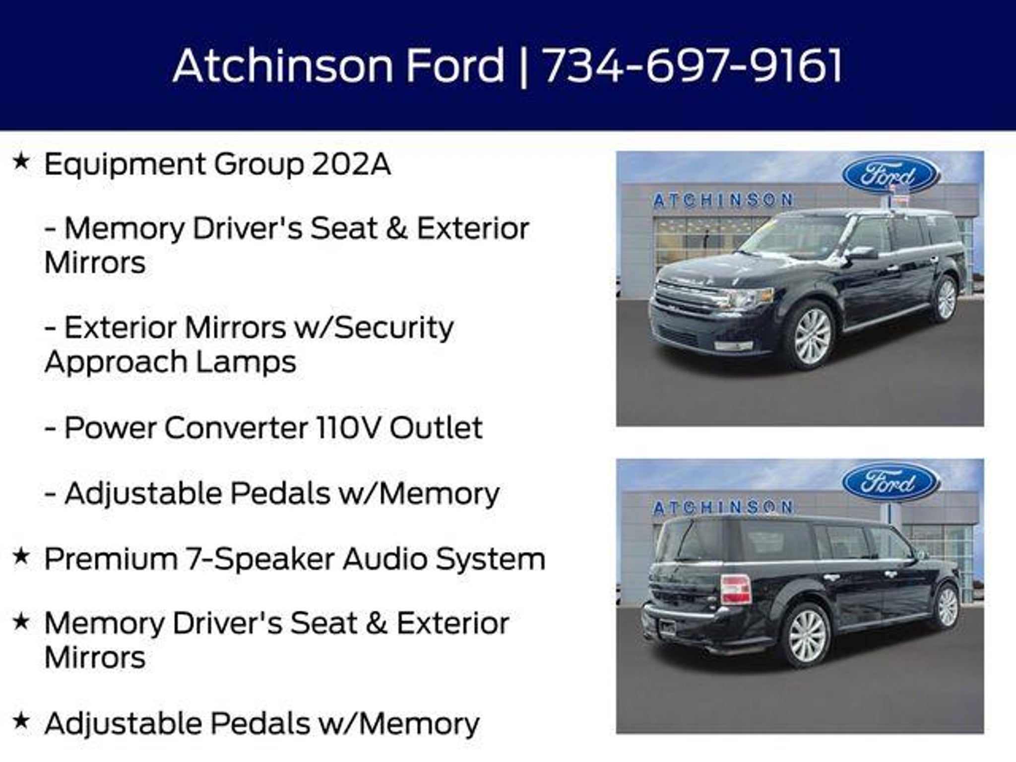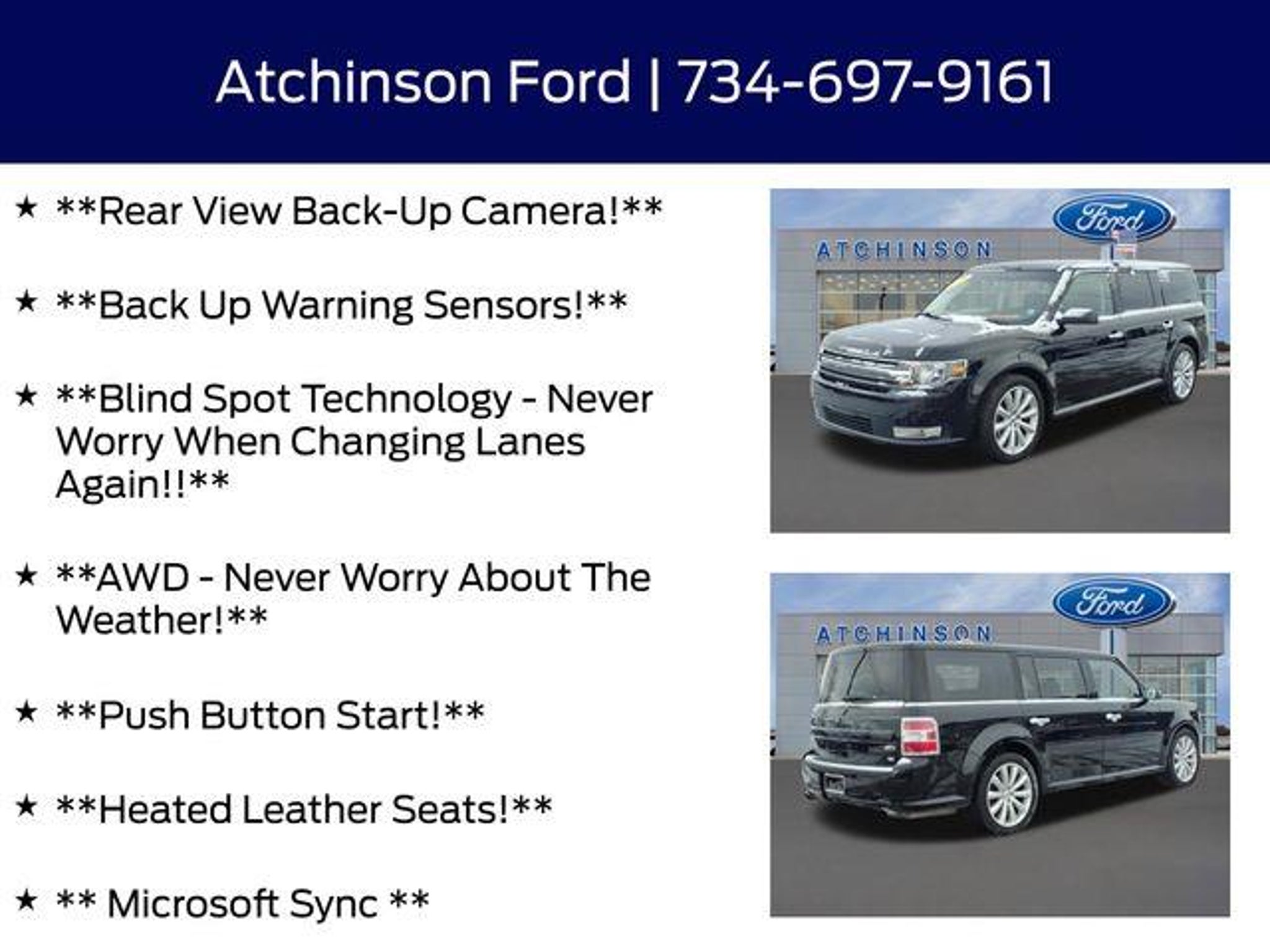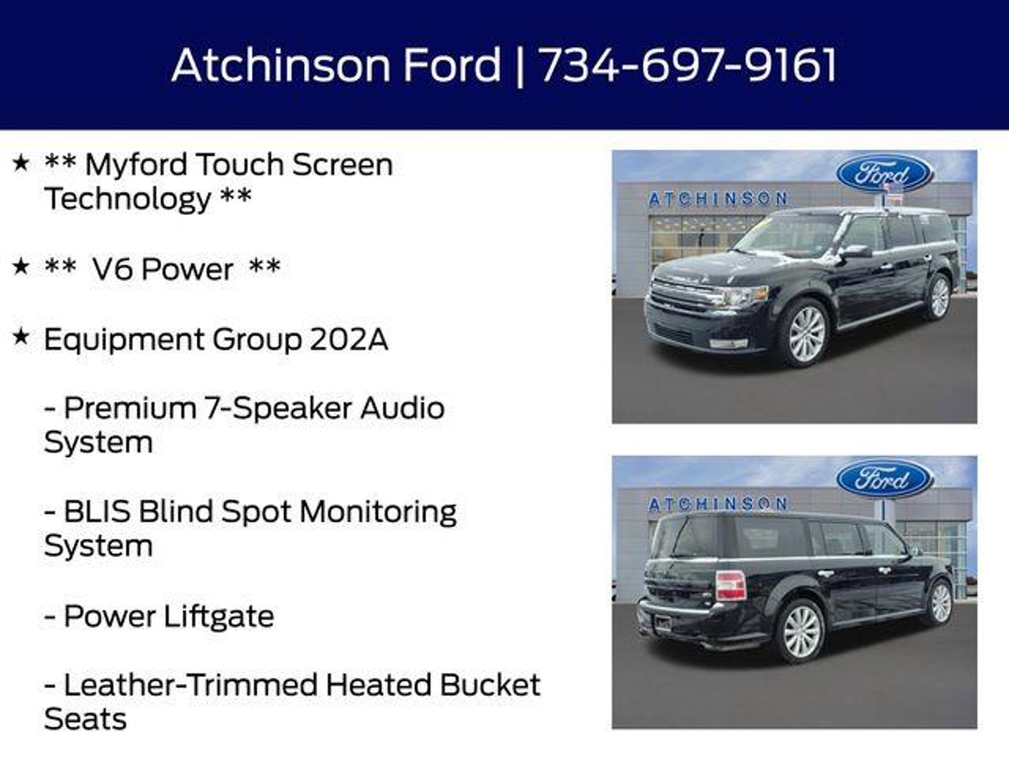 Discover the Exceptional 2016 Ford Flex SEL - Your Ultimate Family Adventure CompanionElevate your driving experience with the remarkable 2016 Ford Flex SEL a true masterpiece of engineering and style. This captivating SUV is the perfect blend of functionality comfort and cutting-edge technology making it the ultimate choice for discerning drivers seeking a vehicle that exceeds expectations. Rear View Back-Up Camera! Back Up Warning Sensors! Blind Spot Technology - Never Worry When Changing Lanes Again!! AWD - Never Worry About The Weather! Push Button Start! Heated Leather Seats! Microsoft Sync Myford Touch Screen Technology V6 PowerEquipped with the premium 202A package this Flex SEL offers an array of advanced features that elevate your driving experience to new heights. Enjoy the convenience of a Power Liftgate the added security of BLIS Blind Spot Monitoring and the exceptional audio quality of the Premium 7-Speaker Audio System. The Memory Drivers Seat and Exterior Mirrors along with the Adjustable Pedals with Memory ensure a personalized and comfortable driving position every time you get behind the wheel.The voice-activated touch-screen navigation system with SiriusXM Traffic and Travel Link keeps you connected and informed while the Power Converter 110V Outlet allows you to power your devices on the go. The Exterior Mirrors with Security Approach Lamps add a touch of elegance and convenience making this Flex SEL a true standout in its class.Beneath the sleek exterior lies the powerful 3.5L V6 Ti-VCT engine delivering a thrilling and responsive driving experience. Paired with the 6-Speed Automatic with Select-Shift and the confidence-inspiring All-Wheel Drive this Flex SEL is ready to take on any road any weather and any adventure.With an impressive EPA-estimated 16 city/22 highway MPG the 2016 Ford Flex SEL combines exceptional performance with impressive fuel efficiency ensuring you can explore the world without constantly worrying about the fuel tank.Experience the ultimate in family-friendly versatility with the 2016 Ford Flex SEL. Its spacious interior split-folding rear seats and generous cargo capacity make it the perfect companion for your next road trip family outing or everyday errands. Discover the perfect balance of style technology and capability that will elevate your driving experience to new heights.Dont miss your opportunity to own this exceptional 2016 Ford Flex SEL. Schedule a test drive today and see for yourself why this remarkable SUV is the perfect choice for your next adventure.