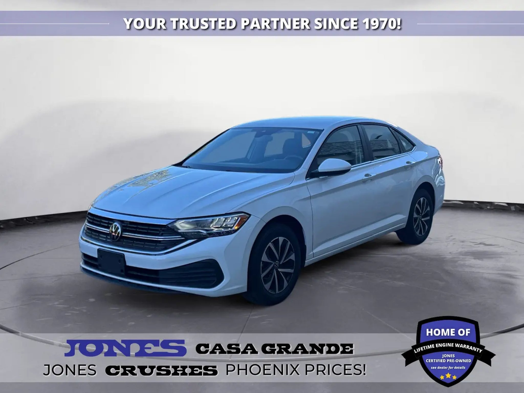 Jetta 1.5T S, 1.5L I-4 DI DOHC Turbocharged. 30/41 City/Highway MPG Jones Ford Buick GMC is Family Owned & Operated and has been doing Business the old fashion way one deal at a time since 1970! ALL our vehicles leave with a FULL TANK of fuel, car wash, PLUS most of our Pre-owned vehicles come with our LIFETIME ENGINE PROTECTION at NO ADDITIONAL COST! ! Save Thousands on any of our New Ford, Buick, or GMC's and give us a try today! Jones Ford Buick GMC 2425 E Florence Blvd Casa Grande AZ 85194 520-836-3100.