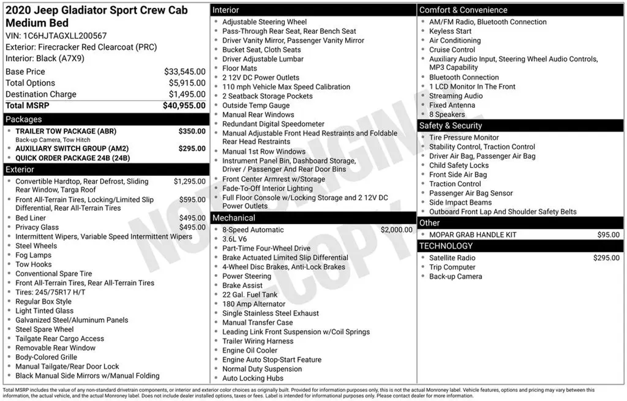 Explore the bold, capable, and versatile 2020 Jeep Gladiator Sport. This remarkable truck is designed to conquer any terrain, offering unparalleled off-road performance and a commanding presence on the road. Featuring an impressive array of premium features, this Gladiator Sport is equipped to handle your toughest adventures. Key highlights include: "¢ Auxiliary Switch Group "¢ Trailer Tow Package "¢ 1-Year SiriusXM Radio Service "¢ 8-Speed Automatic Transmission with Tip Start, Skid Plate, and Selec-Speed Control "¢ Black 3-Piece Hard Top with Freedom Panel Storage Bag "¢ Anti-Spin Differential Rear Axle "¢ Spray-In Bedliner "¢ Deep Tint Sunscreen Windows "¢ Rear Sliding Window The Gladiator Sport's powerful 3.6L V6 24V VVT engine, paired with a smooth-shifting 8-speed automatic transmission, delivers exceptional performance and efficiency, with an EPA-estimated 17 city/22 highway MPG. Conquer any terrain with the Gladiator's legendary 4-wheel-drive system, offering unparalleled off-road capability. Slip behind the wheel and experience the Gladiator's commanding presence. The spacious and versatile cabin provides ample room for passengers and cargo, while the intuitive Uconnect infotainment system keeps you connected and entertained on the go. With advanced safety features like ParkView Rear Back-Up Camera and Electronic Stability Control, you can drive with confidence, no matter the conditions. Whether you're tackling the great outdoors or navigating the city streets, the 2020 Jeep Gladiator Sport is the ultimate companion. Its rugged design, impressive capabilities, and premium amenities make it the perfect choice for those who demand the very best in a mid-size truck. We invite you to visit our showroom and experience the Gladiator Sport for yourself. Let our knowledgeable team demonstrate the vehicle's features and capabilities, and help you envision the endless possibilities that await. Take the first step towards owning this exceptional Jeep and schedule a test drive today.