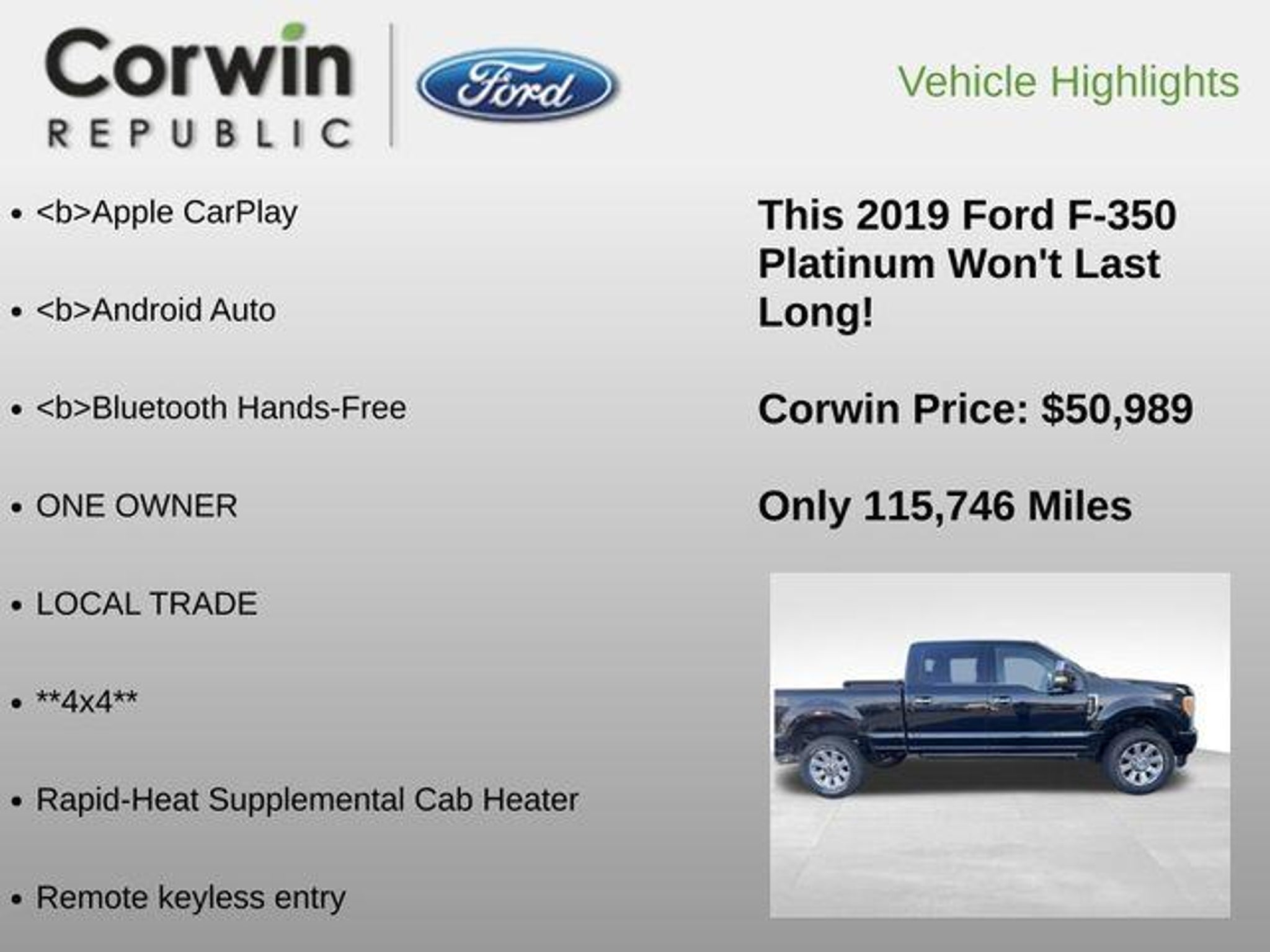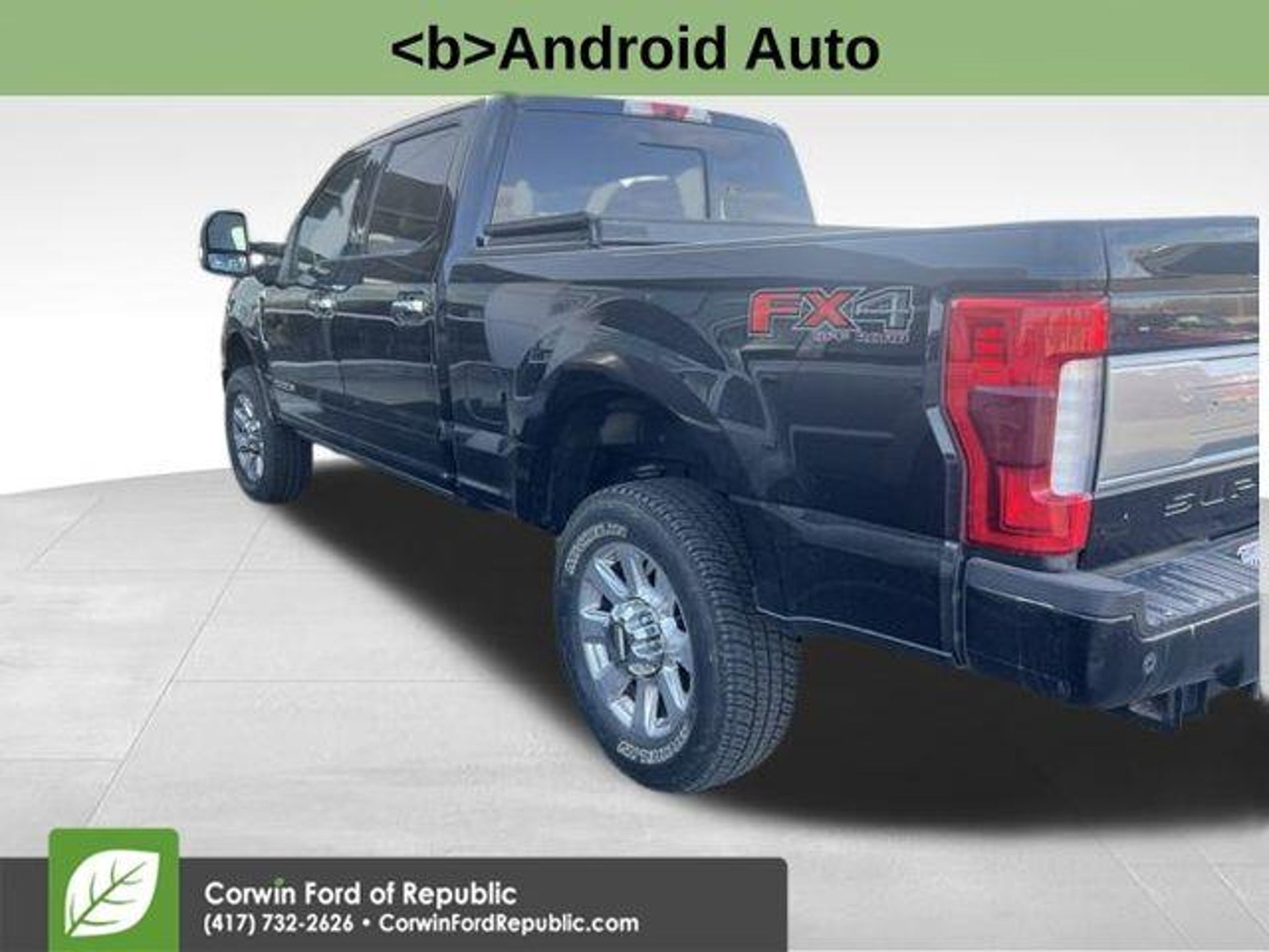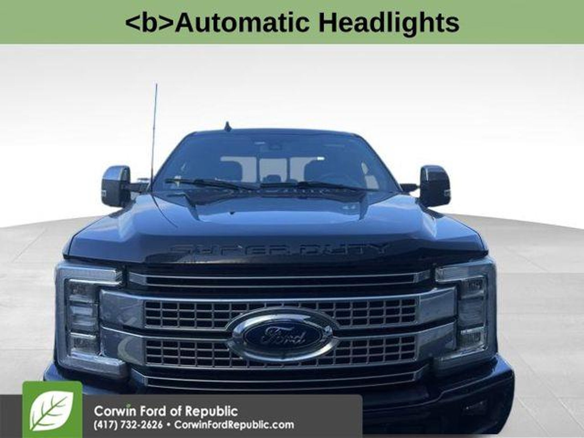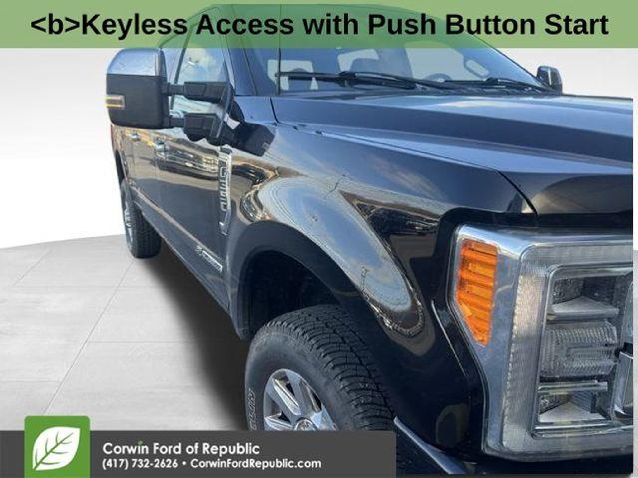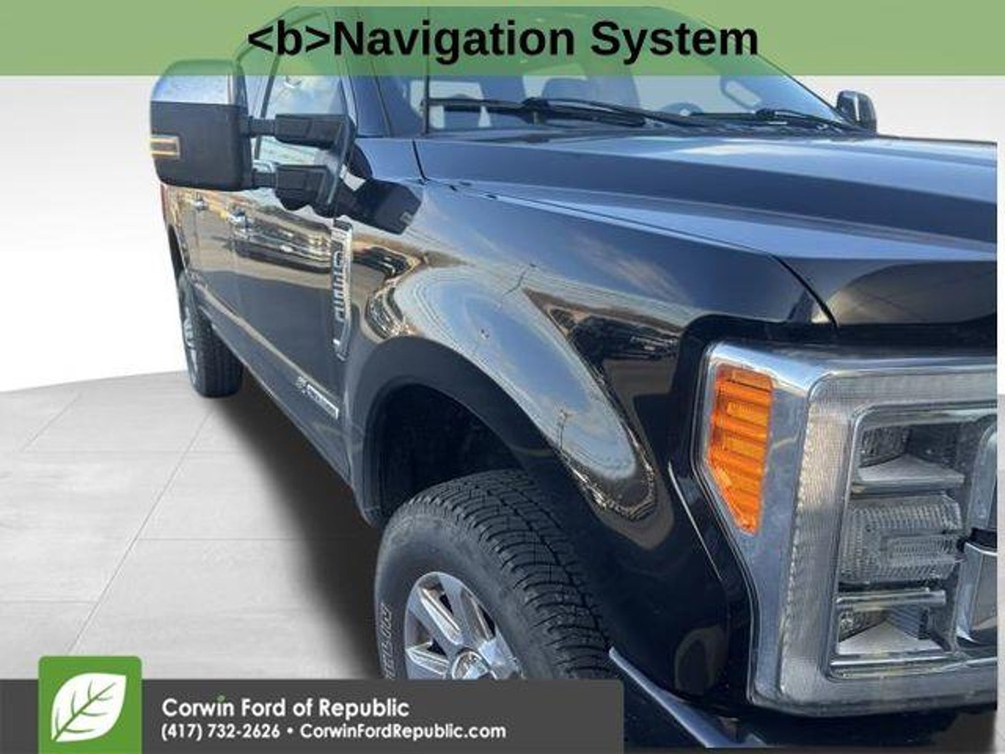 Recent Arrival! This Ford F-350SD is well equipped and includes these key features and benefits, *Adaptive Cruise Control, Heated and Cooled Seats, Blind-Spot Monitors, Lane Keeping Assist, Navigation System, Backup Camera, Keyless Access with Push Button Start, Automatic Headlights, Apple CarPlay, Android Auto, Bluetooth Hands-Free, ONE OWNER, LOCAL TRADE, **4x4**, 4WD, Dual Extra Heavy-Duty Alternators (Total 377-Amps), Rapid-Heat Supplemental Cab Heater, Remote keyless entry, Twin Panel Power Moonroof. CARFAX One-Owner. 2019 Ford F-350SD Platinum 4WD TorqShift 6-Speed Automatic Power Stroke 6.7L V8 DI 32V OHV Turbodiesel Agate Black Metallic The BIG QUESTION is why buy from Corwin Ford Lincoln Republic. Corwin is a family owned and operated business. We have been in business for over 100 years. Our select Certified inventory takes the risk out of buying a car at the same live market price. All our preowned vehicles get 172 point inspection by certified technicians. You get a Vehicle History Report. Now that's a deal! What is Live Market Pricing? We utilize a 3rd party company, Kelly Blue Book, to help us price preowned vehicles. To not be just the best price, but the best value price. Which in turn takes the haggle out of buying a car. Saving you TIME and MONEY. Remember if it does not say Corwin on the back of the car, you've probably paid to much. We proudly serve Republic, Ozark, Nixa, Fair Grove, Pleasant Hope, Billings, Clever, Springfield, Aurora, Branson, Marshfield, and the greater Springfield Missouri area. Corwin Price does not include Admin fee of $604.00 or optional Data Dots $299.*