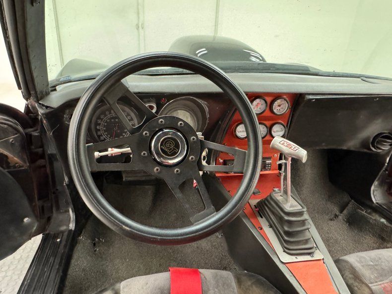 Standard black vinyl door panels lead to black, gray, and red cloth racing seats with red racing harnesses on each, and the seats show some age but are fully intact ahead of a gutted rear section that houses the battery. A GT steering wheel fronts a dash with standard speedometer, an added tachometer, and cut in lights with plenty of patina to go round. A custom burnt orange center stack has a series of white face Sunpro gauges and an AM/FM/CD player ahead of the B&M shifter and hand labeled toggle switches. There's some gray floor coverings and no headliner on the T-tops above.