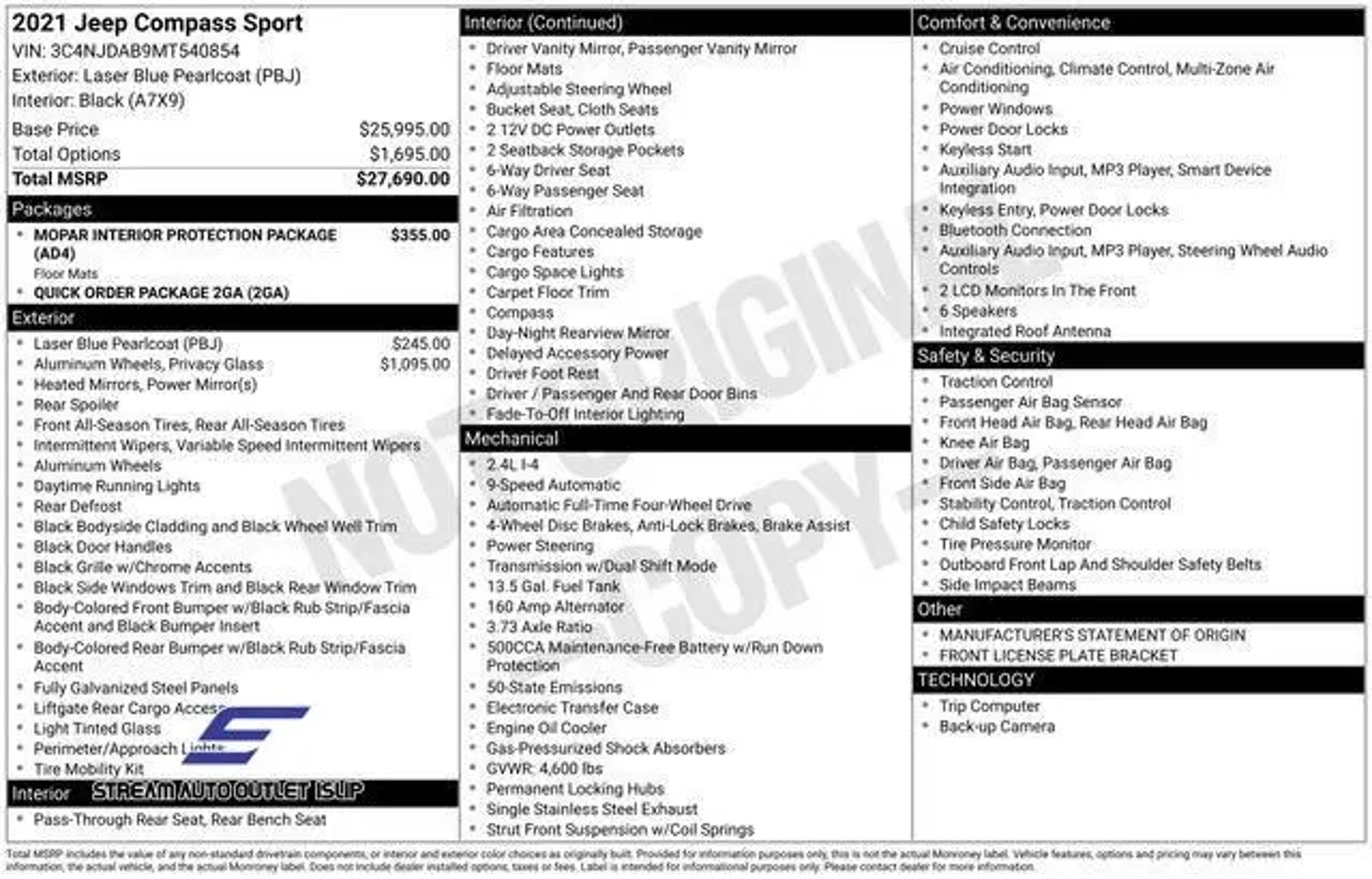 CARFAX One-Owner. Clean CARFAX. 2021 Jeep Compass Laser Blue Pearlcoat 4WD, Apple CarPlay/Android Auto, Heated door mirrors, Illuminated entry, ParkView Rear Back-Up Camera. 22/30 City/Highway MPG Welcome to Stream Auto Outlet Islip"”where everyone drives. With 400 vehicles available and financing options for all credit types, we make approvals simple for customers with ITINs, new credit, bad credit, or no SSN. Our team is known for getting deals done and helping drivers across Long Island get into reliable, high-quality vehicles every day. No stress. No judgment. Just straightforward car buying.