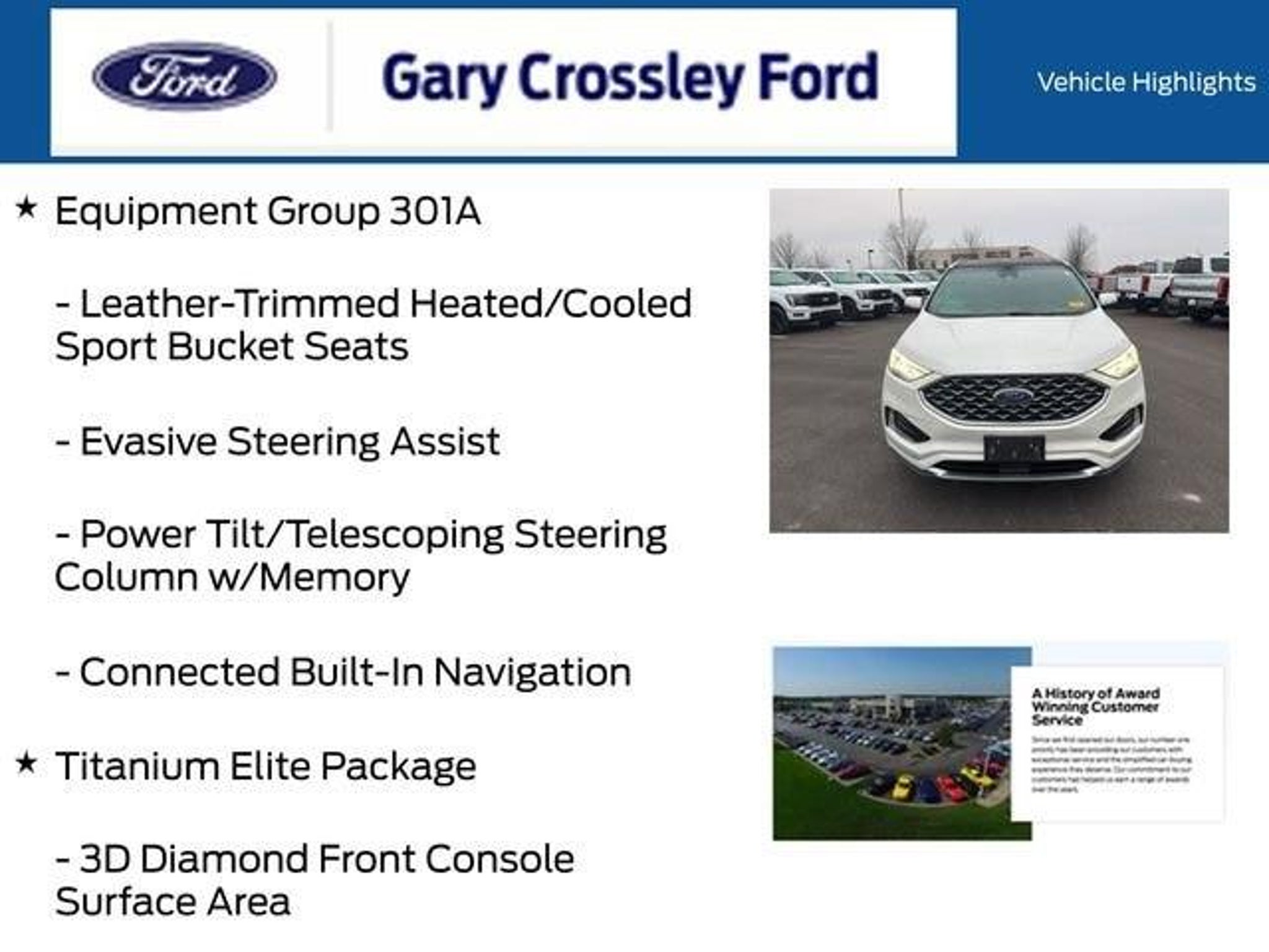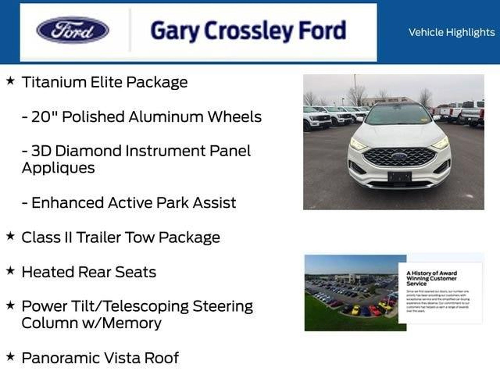 ** One Owner **, ** Clean CarFax **, ** Local Trade In **, ** Apple CarPlay & Android Auto **, ** Push Button Start **, ** Rear Back Up Camera **, ** Navigation **, ** Panoramic Roof **, ** Leather Seats **, ** Remote Start **, ** Adaptive Cruise **, ** Co Pilot 360 **, ** Heated Seats **, ** Trailer Tow Package **, 20 Polished Aluminum Wheels, 3D Diamond Front Console Surface Area, 3D Diamond Instrument Panel Appliques, Adaptive Cruise Control w/Stop & Go, Adaptive LED Headlamps, Auto-Dimming Driver's Sideview Mirror, Bright Chrome Accents & Surround Upper Grille, Class II Trailer Tow Package, Connected Built-In Navigation, Enhanced Active Park Assist, Equipment Group 301A, Evasive Steering Assist, Front 180-Degree Camera w/Split View, Heated Rear Seats, Lane Centering, Leather-Trimmed Heated/Cooled Sport Bucket Seats, Navigation System, Panoramic Vista Roof, Power Liftgate, Power Tilt/Telescoping Steering Column w/Memory, Titanium Elite Package. CARFAX One-Owner. Star White Metallic Tri-Coat 2022 Ford Edge Titanium EcoBoost 2.0L I4 GTDi DOHC Turbocharged VCT 4D Sport Utility AWD 8-Speed AutomaticRecent Arrival! Odometer is 543 miles below market average! 21/28 City/Highway MPG