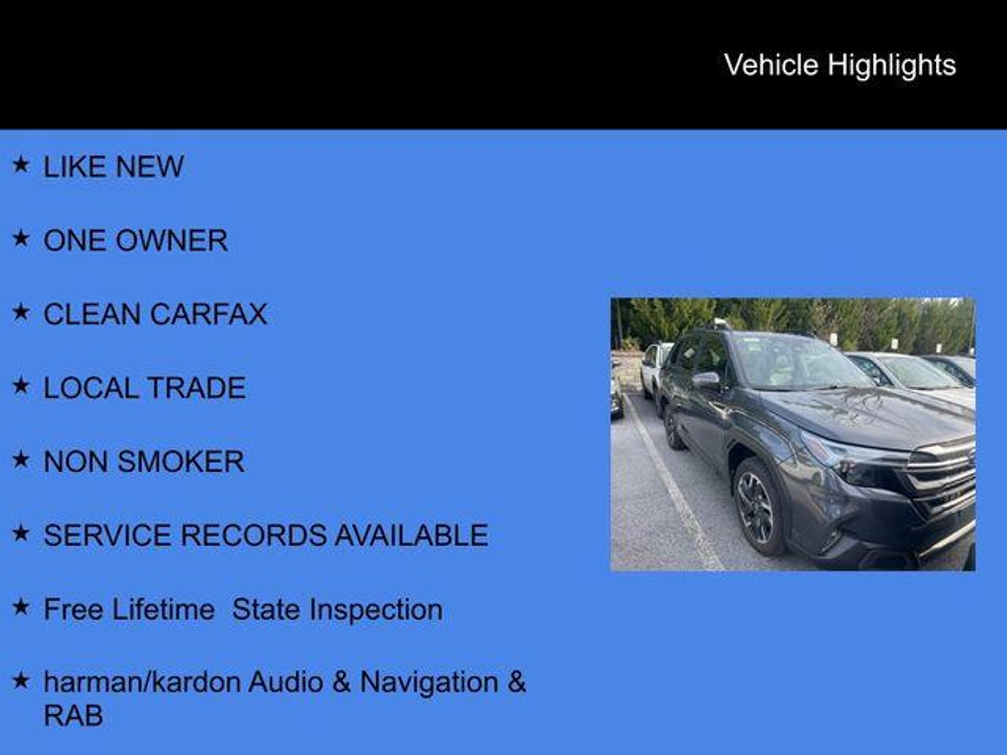 2025 Subaru Forester Limited CARFAX One-Owner. Clean CARFAX. LIKE NEW, ONE OWNER, CLEAN CARFAX, LOCAL TRADE, NON SMOKER, SERVICE RECORDS AVAILABLE, Free Lifetime State Inspection, harman/kardon Audio & Navigation & RAB, Radio: Subaru 11.6 Multimedia Navigation System, Reverse Automatic Braking (RAB) System. Odometer is 6451 miles below market average! 26/33 City/Highway MPG Subaru Certified Pre-Owned Details: * Powertrain Limited Warranty: 84 Month/100,000 Mile (whichever comes first) from original in-service date * 152 Point Inspection * Roadside Assistance * Warranty Deductible: $0 * Transferable Warranty * SiriusXM 3-Month trial subscription, $500 Owner Loyalty coupon & 1 year trial subscription to STARLINK * Vehicle History Rafferty Subaru Family Owned and Operated Since 1977. We offer Customer Friendly Service Department, Nationally Recognized Stellar Care Award, Subaru Certified Sales Staff, Service Staff, and Delivery Specialist Personal and Complimentary Services which include: "¢80 vehicle loaner fleet "¢Take a FREE loaner vehicle when you service your vehicle "¢Fresh fruit, snacks, coffee, water every day "¢Local courtesy shuttle service "¢FREE Lifetime State Inspection ITS ALL ABOUT YOU AT RAFFERTY SUBARU!
