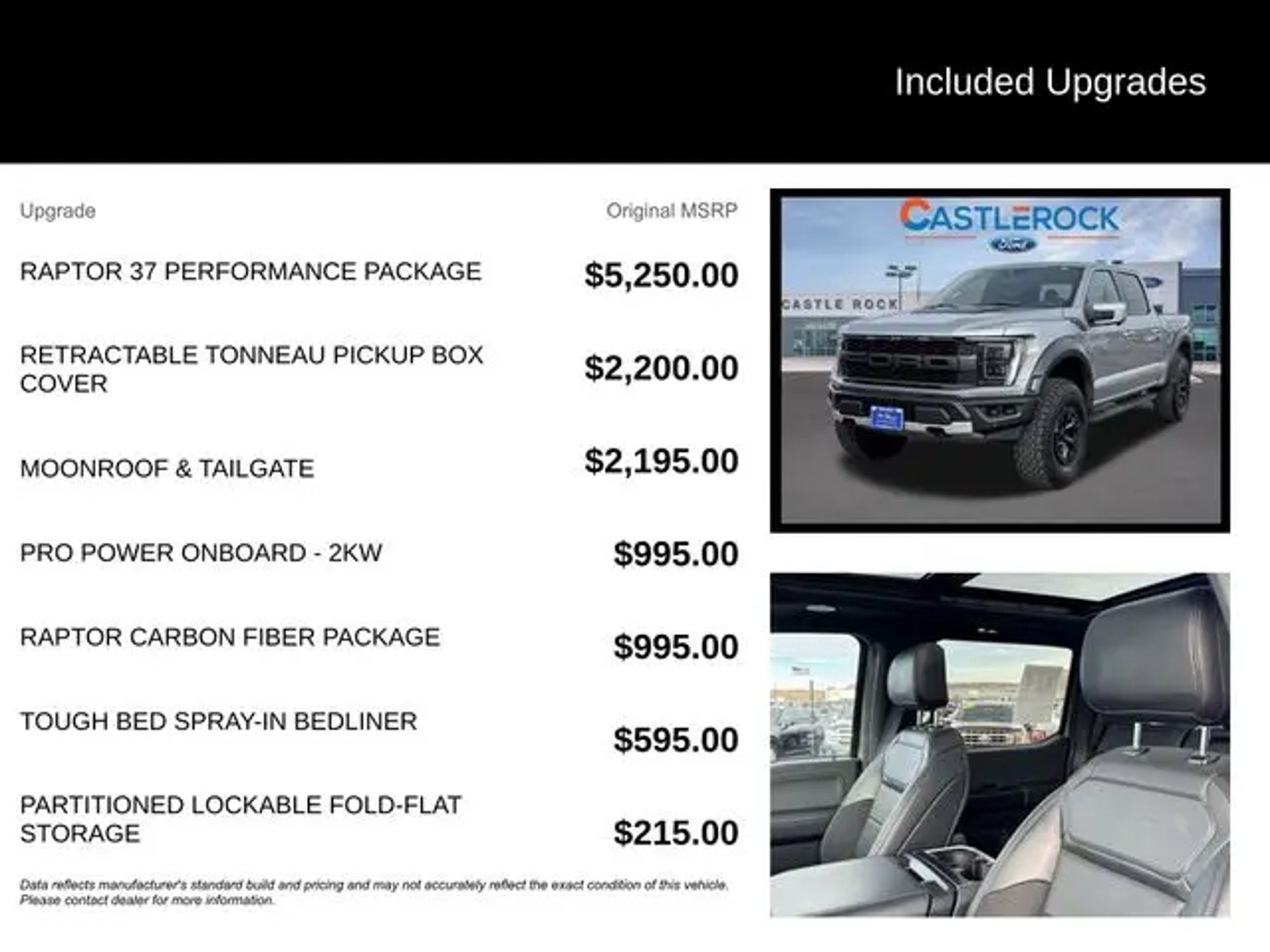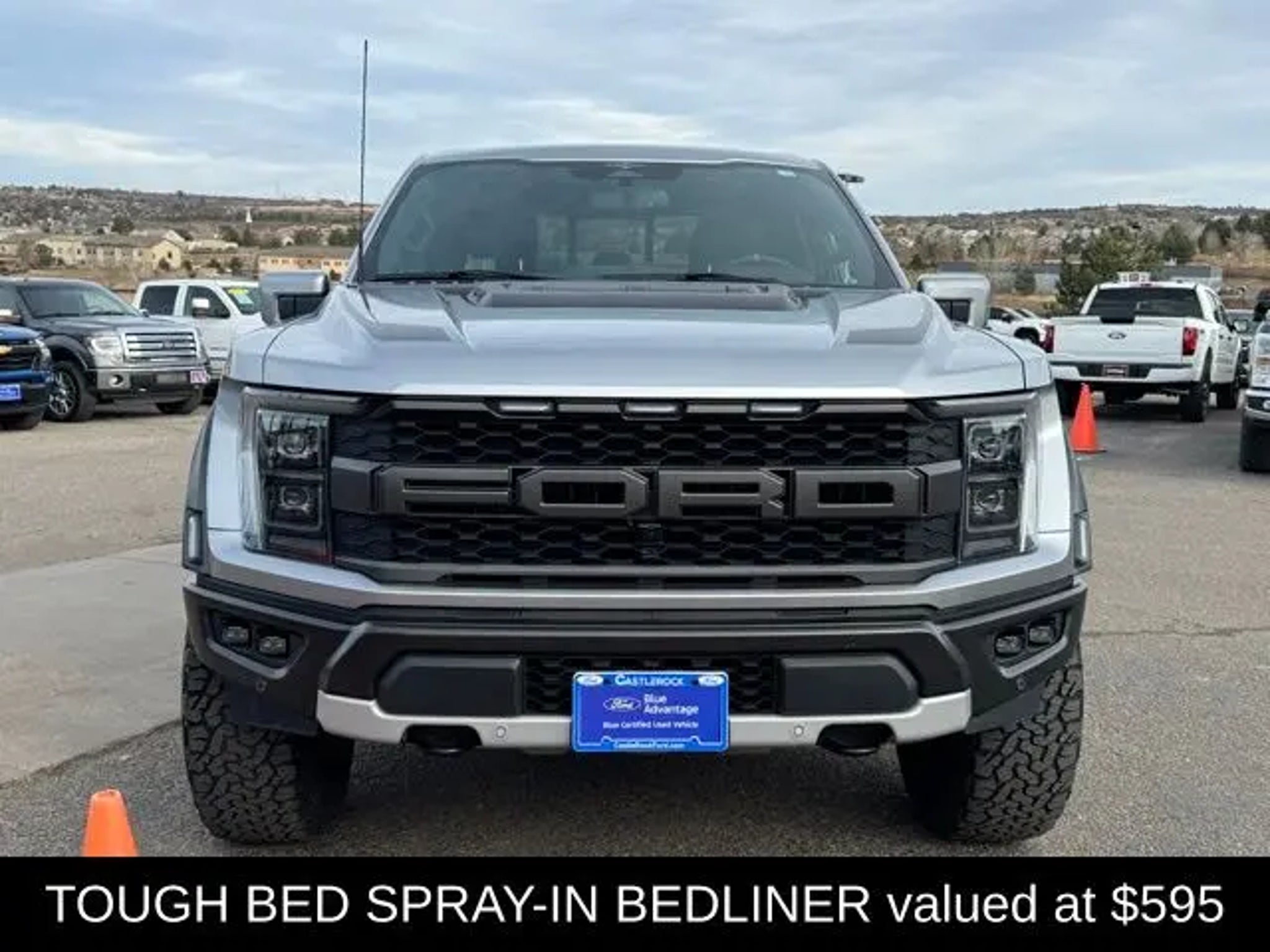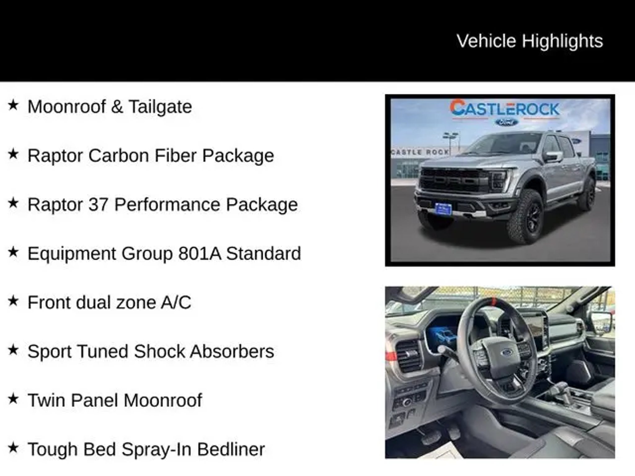 Discover the ultimate off-road experience with the 2023 Ford F-150 Raptor. This exceptional vehicle is engineered to conquer any terrain, blending unparalleled capability with refined comfort and cutting-edge technology. "¢ Raptor 37 Performance Package "¢ Raptor Carbon Fiber Package "¢ Retractable Tonneau Pickup Box Cover "¢ Moonroof & Tailgate "¢ Pro Power Onboard - 2KW "¢ Tough Bed Spray-In Bedliner Powered by a robust 3.5L V6 EcoBoost engine and equipped with a 10-speed automatic transmission, the Raptor delivers exceptional performance and control, with the added confidence of 4-wheel drive. Boasting a striking silver exterior, this vehicle is a true head-turner, complemented by its distinctive Raptor styling cues. Climb inside and experience the unparalleled comfort and convenience of the Raptor's cabin. Enjoy the comfort of heated and ventilated front seats, as well as a heated steering wheel, ensuring a relaxing ride no matter the weather. The twin-panel moonroof and power tailgate add an extra touch of luxury, while the Pro Power Onboard system provides the flexibility to power your tools or equipment on the go. Navigating the great outdoors has never been easier, thanks to the Raptor's advanced safety and technology features. Stay connected with the SYNC 4 infotainment system, which offers enhanced voice recognition and seamless integration with your smartphone. The lane departure warning system and rear-view camera provide added peace of mind, while the adaptive suspension ensures a smooth and responsive ride, even on the most challenging terrain. Whether you're tackling the toughest off-road trails or simply seeking a capable and stylish daily driver, the 2023 Ford F-150 Raptor is the ultimate choice. Experience the thrill of the open road and the freedom to explore with this exceptional vehicle. Visit CASTLE ROCK FORD or call for your V.I.P. appointment . Price does not include Tax, Title and Fees.