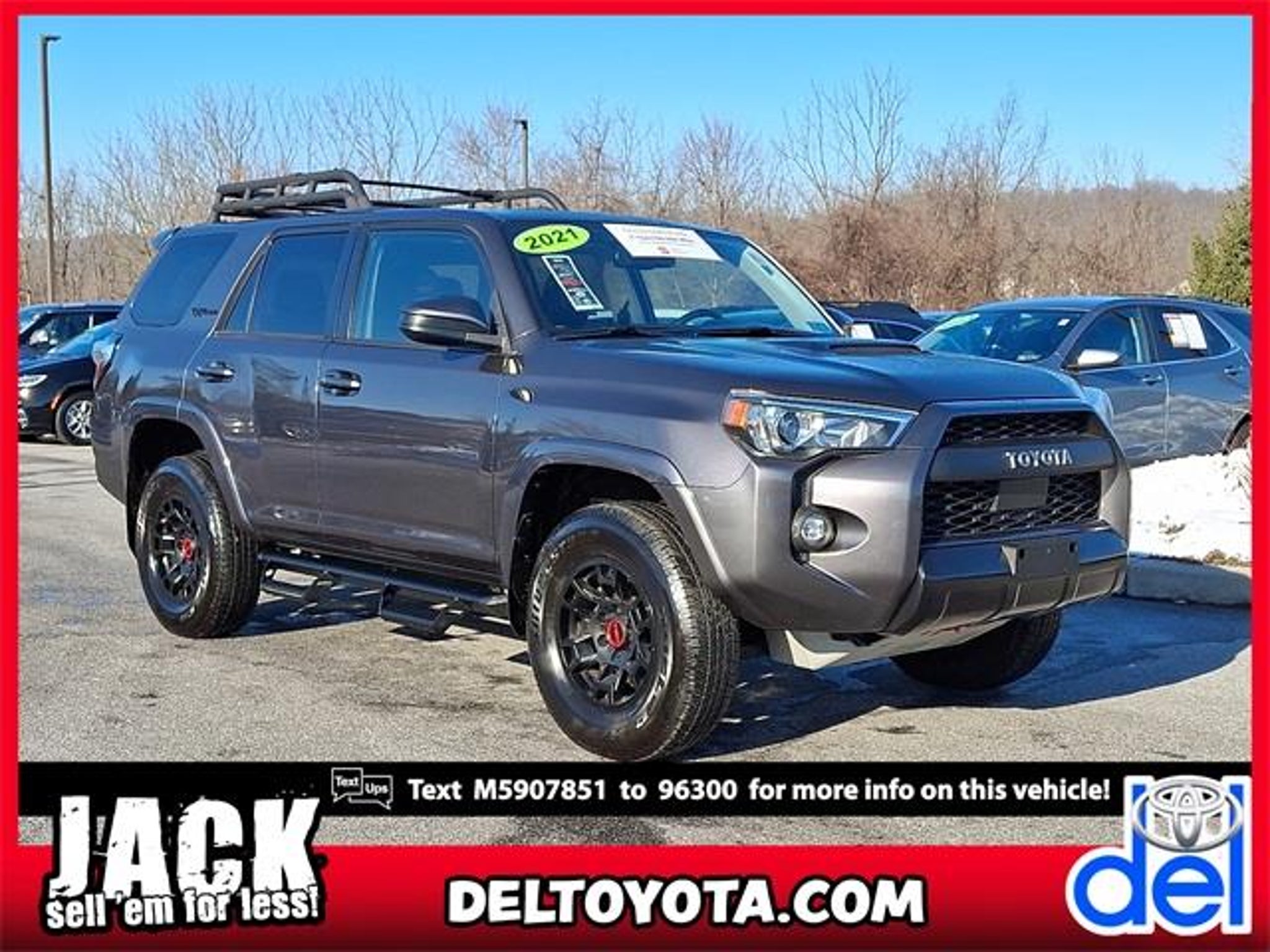 2021 Toyota 4Runner in enticing Magnetic Gray Metallic!! Includes . Just 51932 miles on this ultimate Intermediate Sport Utility. Haven't you been hunting for a 4Runner that will make your neighbors drool with envy? When you run an errand, the fantastic 5-Speed Automatic with Overdrive in this SUV keeps you rollin' smoothly and efficiently down the road. On top of it all, this vehicle is priced-to-sell and is easy on your wallet due to massive savings that are available now!! TSRP is not the sales price and does not include taxes, tags, title, adjusted market value, dealer installed equipment (if applicable), and $477 dealer documentary fee. Includes Del Protection Package: $995.00 includes interior,exterior and touchscreen protection. Ask a sales associate for details. Toyota Gold Certified Details: * Vehicle History * Limited Warranty: 12 Month/12,000 Mile Limited Comprehensive Warranty: 12 Month/12,000 Mile (whichever comes first) from certified purchase date * Transferable Warranty * Powertrain Limited Warranty: 84 Month/100,000 Mile (whichever comes first) from TCUV purchase date * Warranty Deductible: $0 * Roadside Assistance * 160 Point Inspection * Roadside Assistance for 7 Year / 100,000 Mile. Standard New-Car Financing Rates Available. Warranty honored at over 1,400 Toyota dealers in the continental U.S. & Canada. Trade-ins accepted. Trouble-free handling of your transaction, including DMV paperwork Visit Us Today. Stop by Del Toyota Inc. Located at 2945 E. Lincoln Hwy., Thorndale, PA 19372 for a quick visit and a great vehicle! Questions . Here is a list of the vehicles features TRD Pro Package (Fog Lights, Garage Door Opener, Power Tilt & Slide Moonroof w/Sunshade, Right & Left Individual Air Conditioner, Roof Rail Delete, TRD Badging, TRD Pro All Weather Floor Liner, TRD Pro Exhaust, TRD Pro Shift Knob, TRD Roof Rack, TRD Suspension Kit, and Wireless Smart Entry Door Lock), 4Runner TRD Pro, Toyota Gold Certified Certified, 4D Sport Utility, 4.0L V6 SMPI DOHC, 5-Speed Automatic with Overdrive, 4WD, Magnetic Gray Metallic, Black/Graphite w/Leather Seat Trim, 15 Speakers, 3.727 Axle Ratio, 4-Wheel Disc Brakes, ABS brakes, Air Conditioning, Alloy wheels, AM/FM radio: SiriusXM, Anti-whiplash front head restraints, Apple CarPlay/Android Auto, Auto High-beam Headlights, Auto-dimming Rear-View mirror, Brake assist, Bumpers: body-color, Compass, Driver door bin, Driver vanity mirror, Dual front impact airbags, Dual front side impact airbags, Electronic Stability Control, Emergency communication system: Safety Connect with 1-year trial, Exterior Parking Camera Rear, Front anti-roll bar, Front Bucket Seats, Front Center Armrest, Front fog lights, Front reading lights, Front wheel independent suspension, Garage door transmitter: HomeLink, Heated door mirrors, Heated Front Bucket Seats, Heated front seats, Illuminated entry, Knee airbag, Leather Shift Knob, Low tire pressure warning, Navigation System, Occupant sensing airbag, Outside temperature display, Overhead airbag, Overhead console, Panic alarm, Passenger door bin, Passenger vanity mirror, Power door mirrors, Power driver seat, Power moonroof, Power passenger seat, Power steering, Power windows, Radio: Premium JBL Audio, Rear anti-roll bar, Rear seat center armrest, Rear window defroster, Rear window wiper, Remote keyless entry, Roof rack, Security system, Softex Synthetic Leather Seat Trim, Speed control, Speed-sensing steering, Split folding rear seat, Spoiler, Steering wheel mounted audio controls, Tachometer, Telescoping steering wheel, Tilt steering wheel, Traction control, Trip computer, Turn signal indicator mirrors, Variably intermittent wipers, and Wheels: 17 Matte Black Flow-Formed TRD Alloy TSRP is not the sales price and does not include taxes, tags, title, adjusted market value, dealer installed equipment (if applicable), and $477 dealer documentary fee.