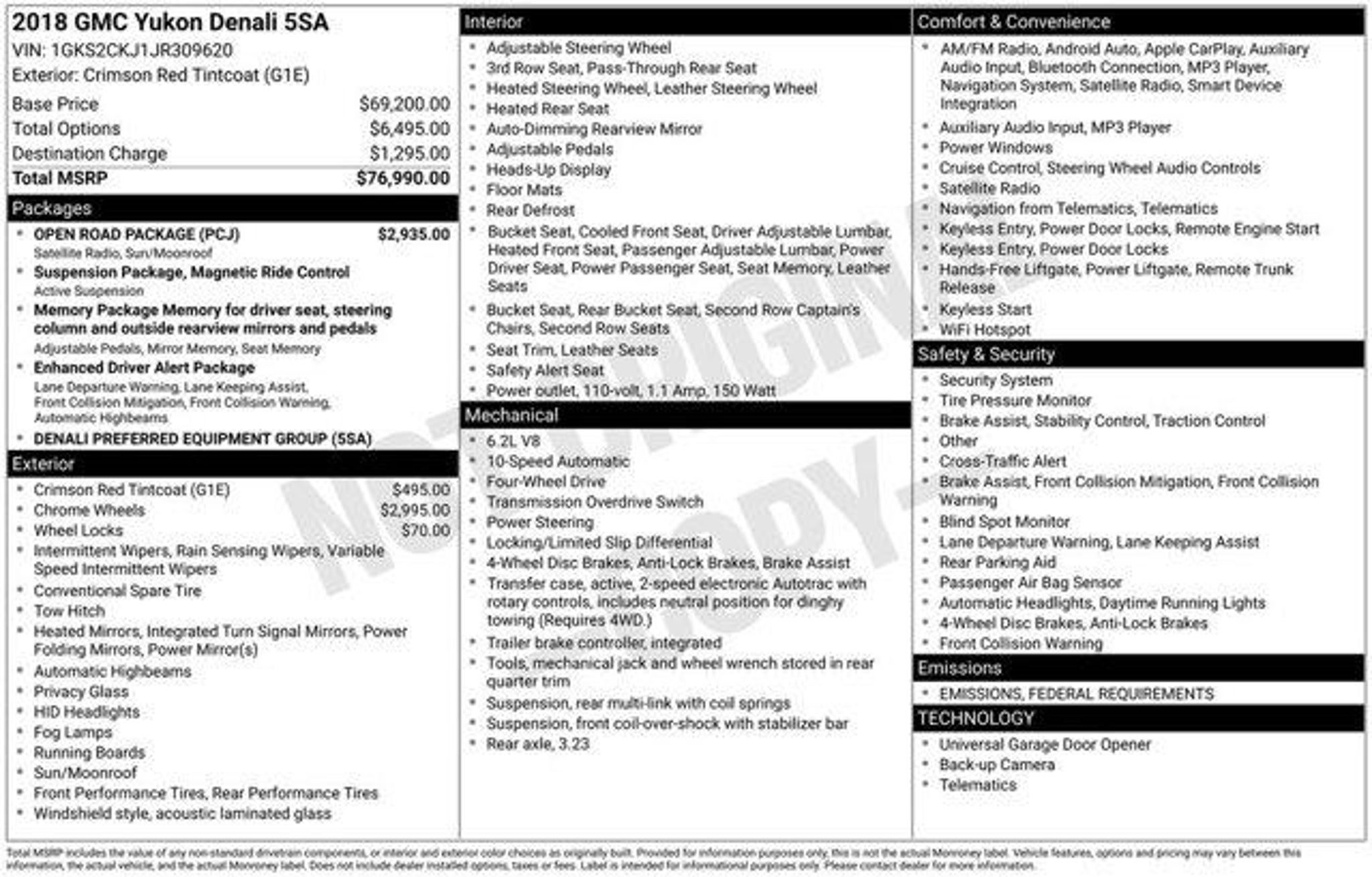 Odometer is 36234 miles below market average! Crimson Red Tintcoat 2018 GMC Yukon Denali 4WD EcoTec3 6.2L V8 4WD, Enhanced Driver Alert Package, Forward Collision Alert, IntelliBeam Automatic High Beam On/Off Headlamps, Lane Keep Assist w/Lane Departure Warning, Low Speed Forward Automatic Braking, Magnetic Ride Control Suspension Package. You can Fill out a Free Super Quick Pre-Approval Credit Application here! https://www.smartfordsouthboston.com/finance/apply-for-financing/ FINANCING FOR ALL TYPES OF CREDIT! SLOW PAYMENTS, BANKRUPTCY, REPOSESSION, COLLECTIONS, JUDGEMENTS, DIVORCE NO PROBLEM! MONTHLY PAYMENTS TO FIT ANY INCOME! TRADE-INS WELCOME! WE BUY CARS Everyday, Even if you don't buy ours! Prices do not include additional fees and costs of closing, including government fees and taxes, any finance charges, any dealer administrative fees, any emissions testing fees or other fees. All prices, specifications and availability subject to change without notice. Contact dealer for most current information. Enhanced Driver Alert Package (Forward Collision Alert, IntelliBeam Automatic High Beam On/Off Headlamps, Lane Keep Assist w/Lane Departure Warning, and Low Speed Forward Automatic Braking), Magnetic Ride Control Suspension Package, Memory Package, Open Road Package (Power Tilt-Sliding Sunroof w/Express-Open/Close and Rear Seat Blu-Ray/DVD Entertainment System), Preferred Equipment Group 5SA (4-Wheel Antilock Disc Brakes, 5 Auxiliary 12-volt Power Outlets, Black Assist Steps w/Chrome Strip, Hands Free Power Liftgate, Heated Leather-Wrapped Steering Wheel, Inside Rear-View Auto-Dimming Mirror, Integrated Trailer Brake Controller, Lane Change Alert w/Side Blind Zone Alert, OnStar 4G LTE, OnStar Basic Plan For 5 Years, Passive Entry System, Power Release Second Row Bucket Seats, Power Tilt & Telescopic Steering Column, Power-Adjustable Pedals For Accelerator & Brake, Push Button Keyless Start, Rear Cross-Traffic Alert, Remote Keyless Entry, Universal Home Remote, and Wireless Charging), 4WD, 10 Speakers, 3.23 Rear Axle Ratio, 3rd row seats: split-bench, 4-Wheel Disc Brakes, ABS brakes, Adaptive suspension, Adjustable pedals, Air Conditioning, Alloy wheels, AM/FM radio: SiriusXM, Apple CarPlay/Android Auto, Auto High-beam Headlights, Auto-dimming door mirrors, Auto-dimming Rear-View mirror, Automatic temperature control, Bodyside moldings, Bose Centerpoint Premium 10-Speaker Surround Sound, Brake assist, Bumpers: body-color, CD Player, CD player, Compass, Delay-off headlights, Driver door bin, Driver vanity mirror, Dual front impact airbags, Dual front side impact airbags, Electronic Stability Control, Emergency communication system: OnStar Guidance, Exterior Parking Camera Rear, Front anti-roll bar, Front Bucket Seats, Front Center Armrest, Front dual zone A/C, Front fog lights, Front reading lights, Front wheel independent suspension, Full-Feature Reclining Bucket Seats, Fully automatic headlights, Garage door transmitter: HomeLink, Genuine wood console insert, Genuine wood dashboard insert, Genuine wood door panel insert, Heads-Up Display, Heated & Ventilated Driver & Front Passenger Seats, Heated door mirrors, Heated front seats, Heated rear seats, Heated steering wheel, High-Intensity Discharge Headlights, Illuminated entry, Leather Shift Knob, Low tire pressure warning, Memory seat, Navigation System, Occupant sensing airbag, Outside temperature display, Overhead airbag, Overhead console, Panic alarm, Passenger door bin, Passenger vanity mirror, Pedal memory, Perforated Leather-Appointed Seat Trim, Power door mirrors, Power driver seat, Power Liftgate, Power passenger seat, Power steering, Power windows, Premium audio system: IntelliLink, Radio: AM/FM/SiriusXM w/Navigation, Rain sensing wipers, Rear air conditioning, Rear anti-roll bar, Rear reading lights, Rear window defroster, Rear window wiper, Remote keyless entry, Roof rack: rails only, Security system, SiriusXM NavTraffic, Si