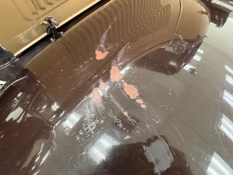 Tan and brown alternative is single stage coverage that's both regal and dramatic with the cabin's paint extending like melting ice cream to form stripes that follow the contours of the rear section and jut out to form spears on the hood. The undulating fenders take on the brown next and they are connected by a running board that's topped with rubber and steel step plate. The body color is shared by the 19-inch wire wheels perfectly wrapped in white wall tires with a covered spare mounted in back, just behind the wooden luggage rack that stows in a vertical position. From the front, you follow a symmetrical design of headlights, cowl lights, and in this case, dual side mirrors while a winged motometer rises from the chrome radiator shell. Imperfections include chipped paint at the base of a fender where it meets the finned engine cover, patches of missing paint from top of both front fenders, and various touched up chips.
