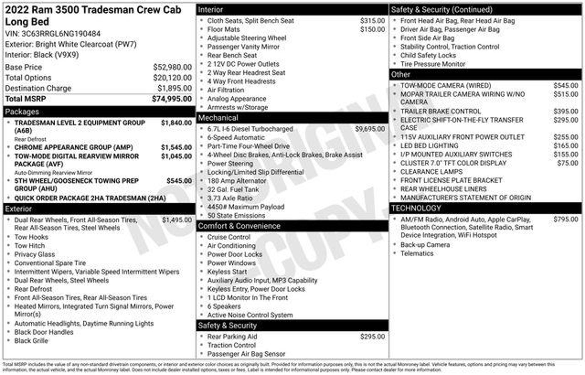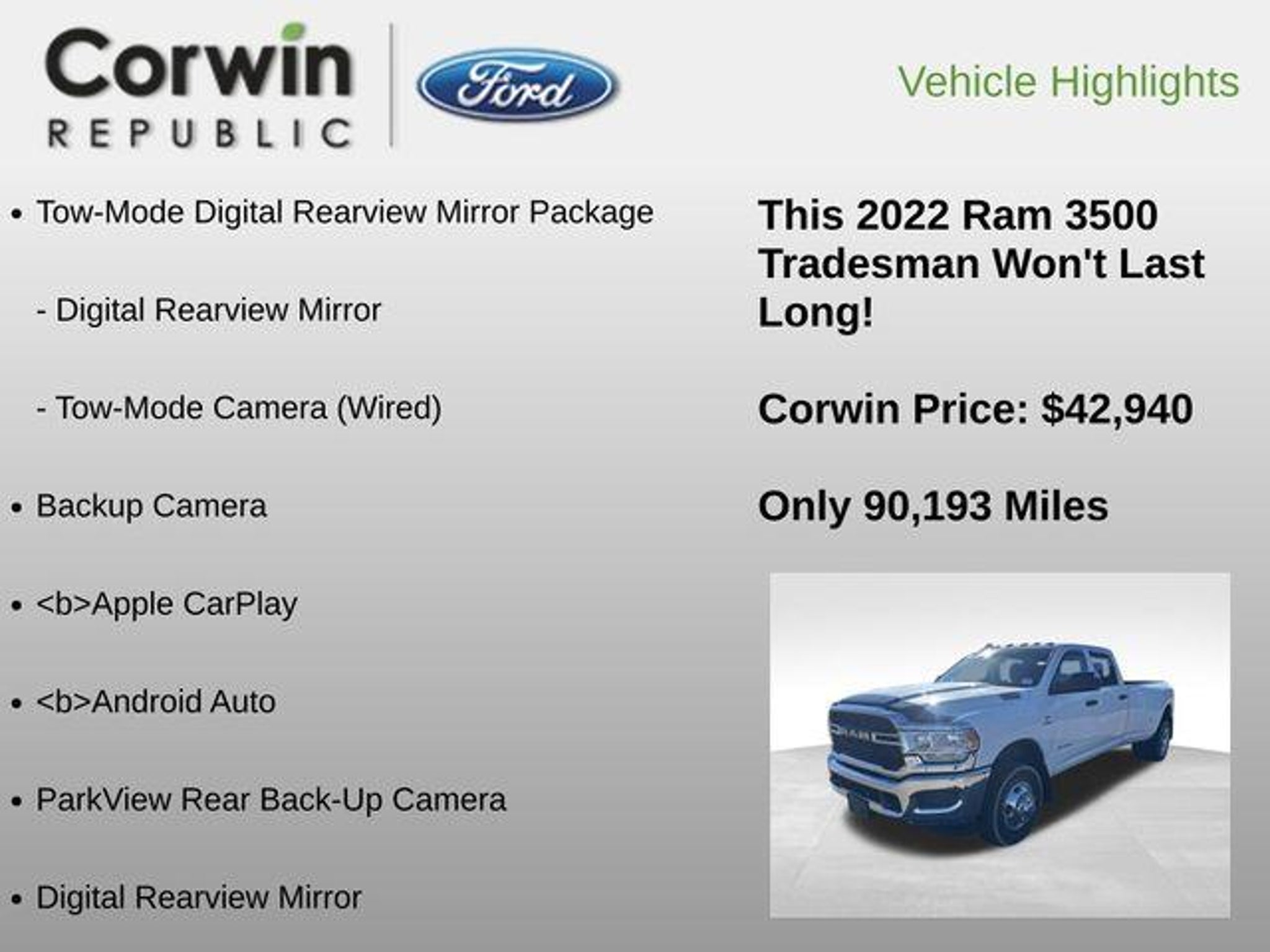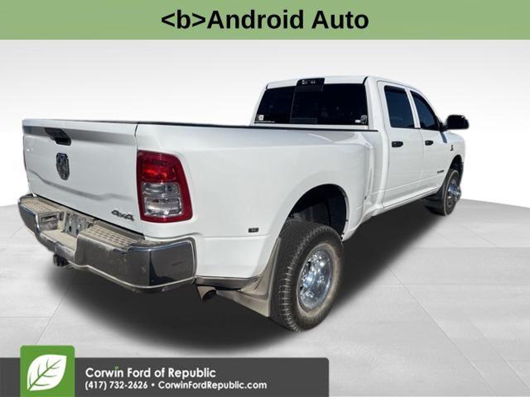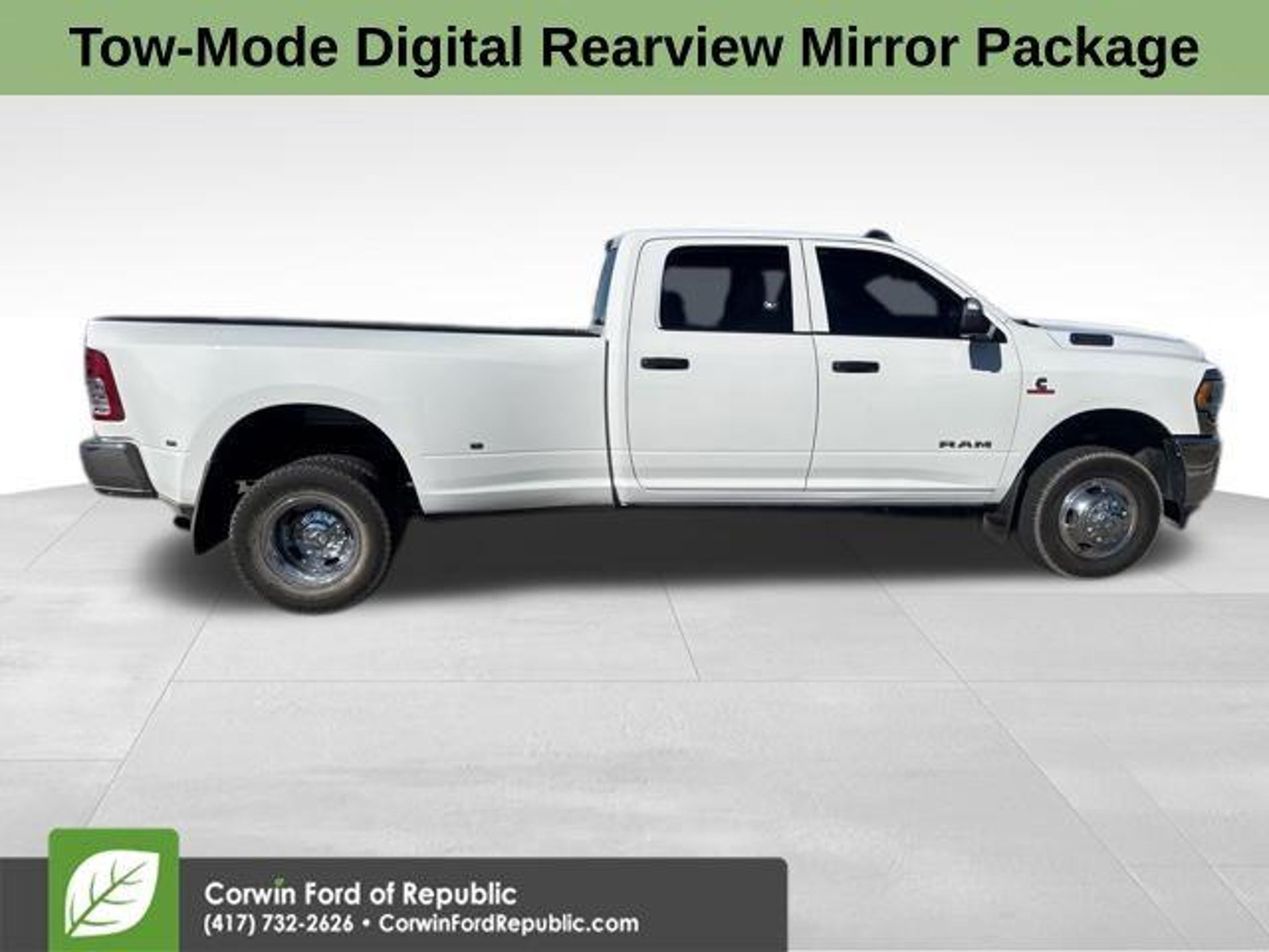 Recent Arrival! Backup Camera, *Apple CarPlay, Android Auto, 5th Wheel/Gooseneck Towing Prep Group, Digital Rearview Mirror, ParkView Rear Back-Up Camera, Tow-Mode Camera (Wired), Tow-Mode Digital Rearview Mirror Package. Clean CARFAX. 2022 Ram 3500 Tradesman 4WD 6-Speed Automatic Cummins 6.7L I6 Turbodiesel Bright White Clearcoat The BIG QUESTION is why buy from Corwin Ford Lincoln Republic. Corwin is a family owned and operated business. We have been in business for over 100 years. Our select Certified inventory takes the risk out of buying a car at the same live market price. All our preowned vehicles get 172 point inspection by certified technicians. You get a Vehicle History Report. Now that's a deal! What is Live Market Pricing? We utilize a 3rd party company, Kelly Blue Book, to help us price preowned vehicles. To not be just the best price, but the best value price. Which in turn takes the haggle out of buying a car. Saving you TIME and MONEY. Remember if it does not say Corwin on the back of the car, you've probably paid to much. We proudly serve Republic, Ozark, Nixa, Fair Grove, Pleasant Hope, Billings, Clever, Springfield, Aurora, Branson, Marshfield, and the greater Springfield Missouri area. Corwin Price does not include Admin fee of $604.00 or optional Data Dots $299.*
