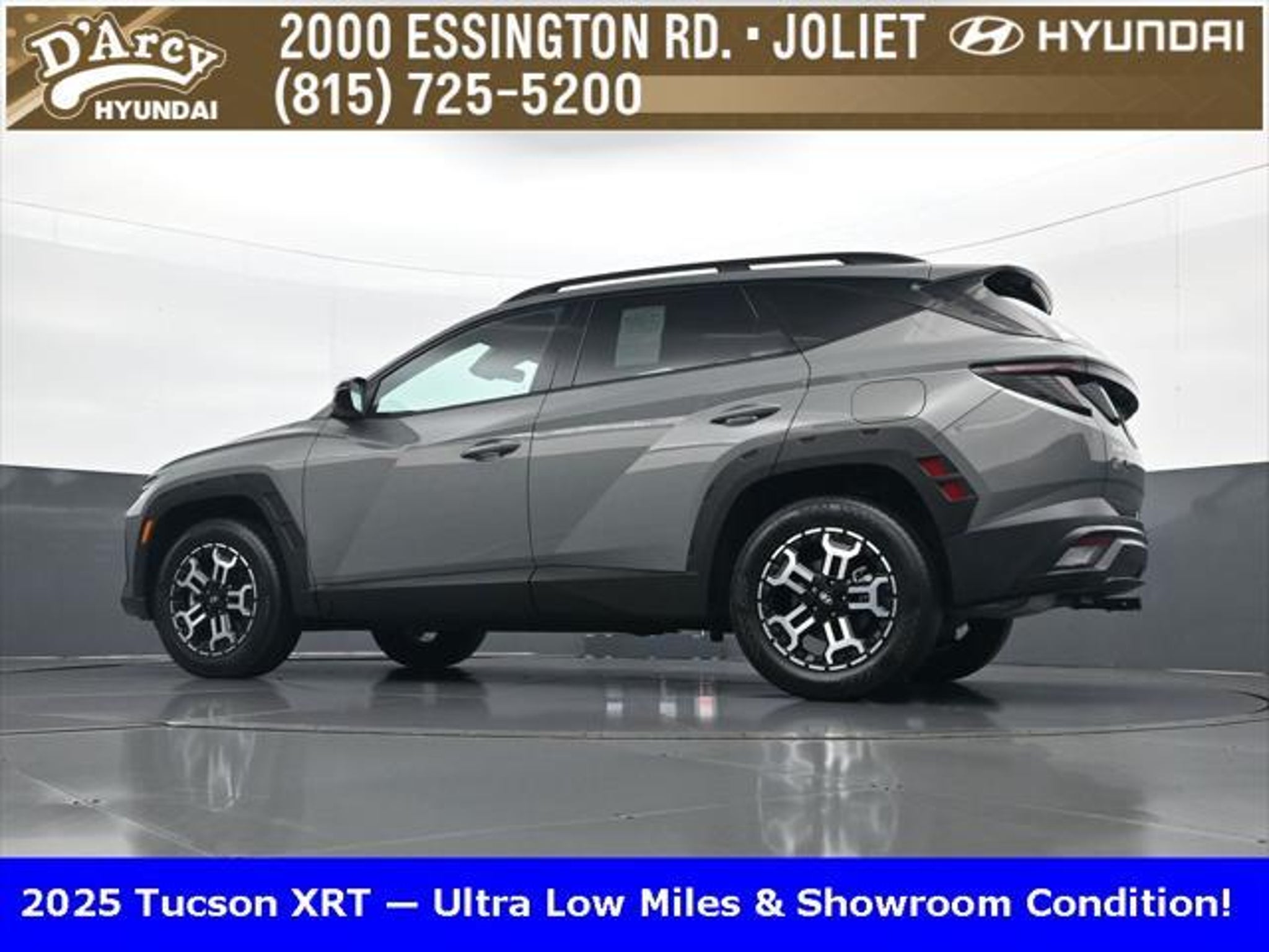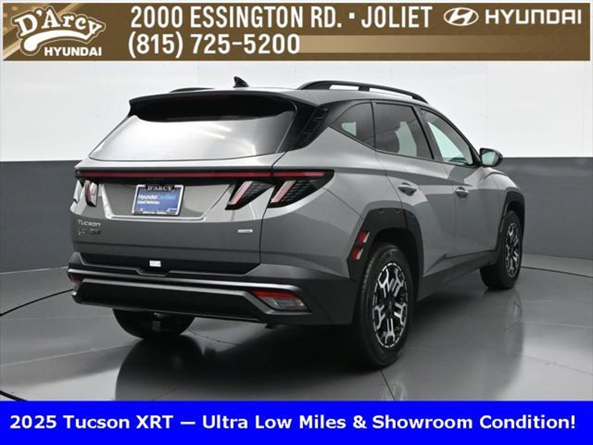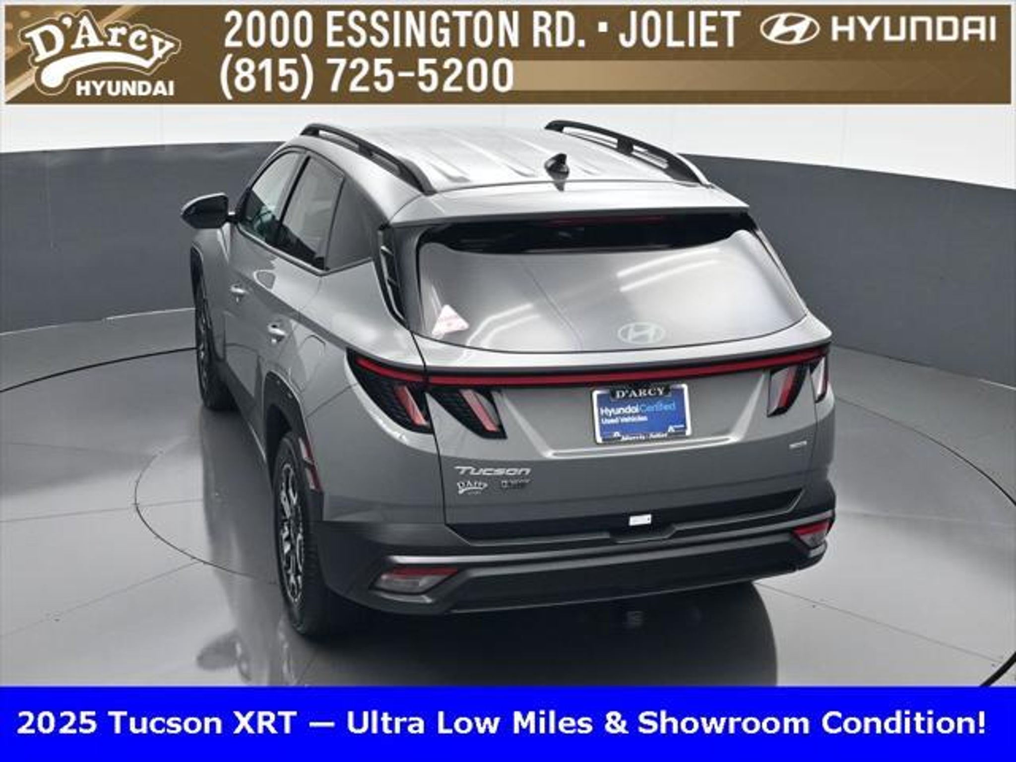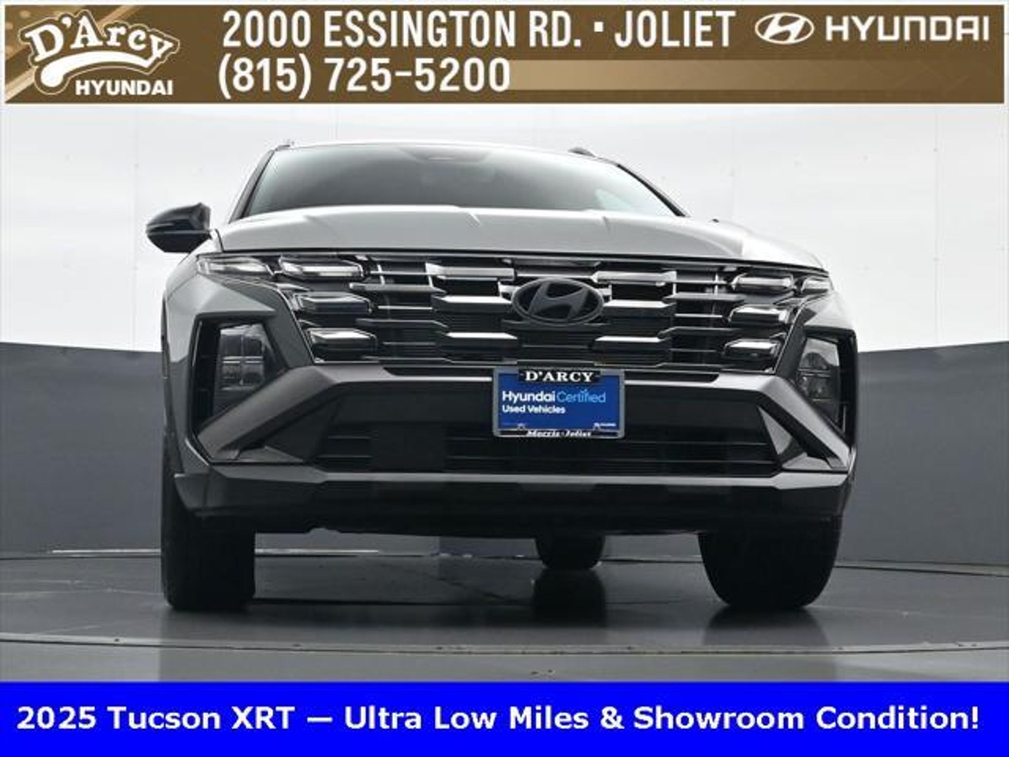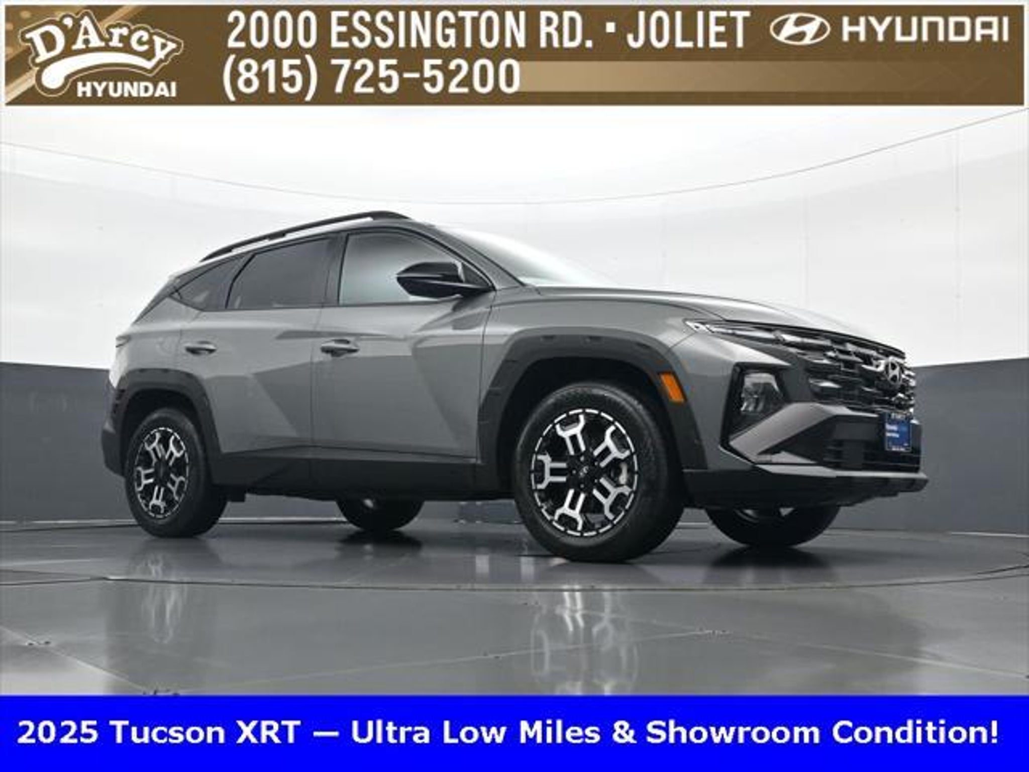 Clean CARFAX. ONE OWNER LOCAL TRADE!, LOW MILES!, GREAT VEHICLE HISTORY!, BOUGHT HERE SERVICED HERE!, HYUNDAI CERTIFIED!, FULLY SERVICED AND READY TO GO!. Certified. Hampton Gray 2025 Hyundai Tucson XRT AWD 8-Speed Automatic with SHIFTRONIC 2.5L I4 DGI DOHC 16V LEV3-SULEV30 187hp Hyundai Certified Used Vehicles Details: * Powertrain Limited Warranty: 120 Month/100,000 Mile (whichever comes first) from original in-service date * Limited Warranty: 60 Month/60,000 Mile (whichever comes first) from original in-service date * Vehicle History * Includes 10-year/Unlimited Mileage Roadside Assistance with Rental Car and Trip Interruption Reimbursement; Please See Dealers for Specific Vehicle Eligibility Requirements. 10-Year/100,000 Mile Hybrid/EV Battery Warranty. 3-Months SiriusXM Trial Subscription. Complimentary 1 Year (Connected Care & Remote Pkgs). * 173 Point Inspection * Roadside Assistance * Warranty Deductible: $50 Discover the D'Arcy Difference! We care - we are here and we are ready to help! Stop by today to see up to date information, including showroom and service hours, and how to make an appointment or schedule delivery. D'Arcy Motors has been serving Joliet and its surrounding communities for over 25 years. Our business philosophy, which is to sell cars one car at a time and to make the guest the most important part of the process, has remained the same since 1991. Contact us today to experience the D'Arcy Difference! Pulse® Safer Braking Technology for $399 added to all New and CPO"“ The rear-end collision deterrent that rapidly pulses your third brake light four times before going solid when you press the brake pedal. This feature enhances safety by helping alert trailing drivers. Discover the D'Arcy Difference! We care - we are here and we are ready to help! Stop by today to see up to date information, including showroom and service hours, and how to make an appointment or schedule delivery. D'Arcy Motors has been serving Joliet and its surrounding communities for over 25 years. Our business philosophy, which is to sell cars one car at a time and to make the guest the most important part of the process, has remained the same since 1991. Contact us today to experience the D'Arcy Difference! 24/30 City/Highway MPG This 2025 Hyundai Tucson comes equipped with: Option Group 01, 4-Wheel Disc Brakes, 6 Speakers, ABS brakes, Air Conditioning, Alloy wheels, AM/FM radio: SiriusXM, Apple CarPlay & Android Auto, Auto High-beam Headlights, Automatic temperature control, Brake assist, Bumpers: body-color, Cargo Blocks, Cargo Net, Cargo Tray, Carpeted Floor Mats, Delay-off headlights, Driver door bin, Driver vanity mirror, Dual front impact airbags, Dual front side impact airbags, Electronic Stability Control, Emergency communication system: Bluelink, First Aid Kit, Four wheel independent suspension, Front anti-roll bar, Front Bucket Seats, Front Center Armrest, Front dual zone A/C, Front reading lights, Fully automatic headlights, H-Tex Seat Trim, Heated door mirrors, Heated Front Bucket Seats, Heated front seats, Illuminated entry, Leather steering wheel, Low tire pressure warning, Occupant sensing airbag, Outside temperature display, Overhead airbag, Overhead console, Panic alarm, Passenger door bin, Passenger vanity mirror, Power door mirrors, Power driver seat, Power Liftgate, Power steering, Power windows, Radio data system, Radio: AM/FM/HD Audio System, Rear anti-roll bar, Rear reading lights, Rear seat center armrest, Rear side impact airbag, Rear window defroster, Rear window wiper, Remote keyless entry, Roadside Assistance Kit, Security system, Speed control, Split folding rear seat, Spoiler, Steering wheel mounted audio controls, Tachometer, Telescoping steering wheel, Tilt steering wheel, Traction control, Trip computer, Turn signal indicator mirrors, Variably intermittent wipers, Wheel Locks, and Wheels: 18 XRT-Exclusive Alloy.
