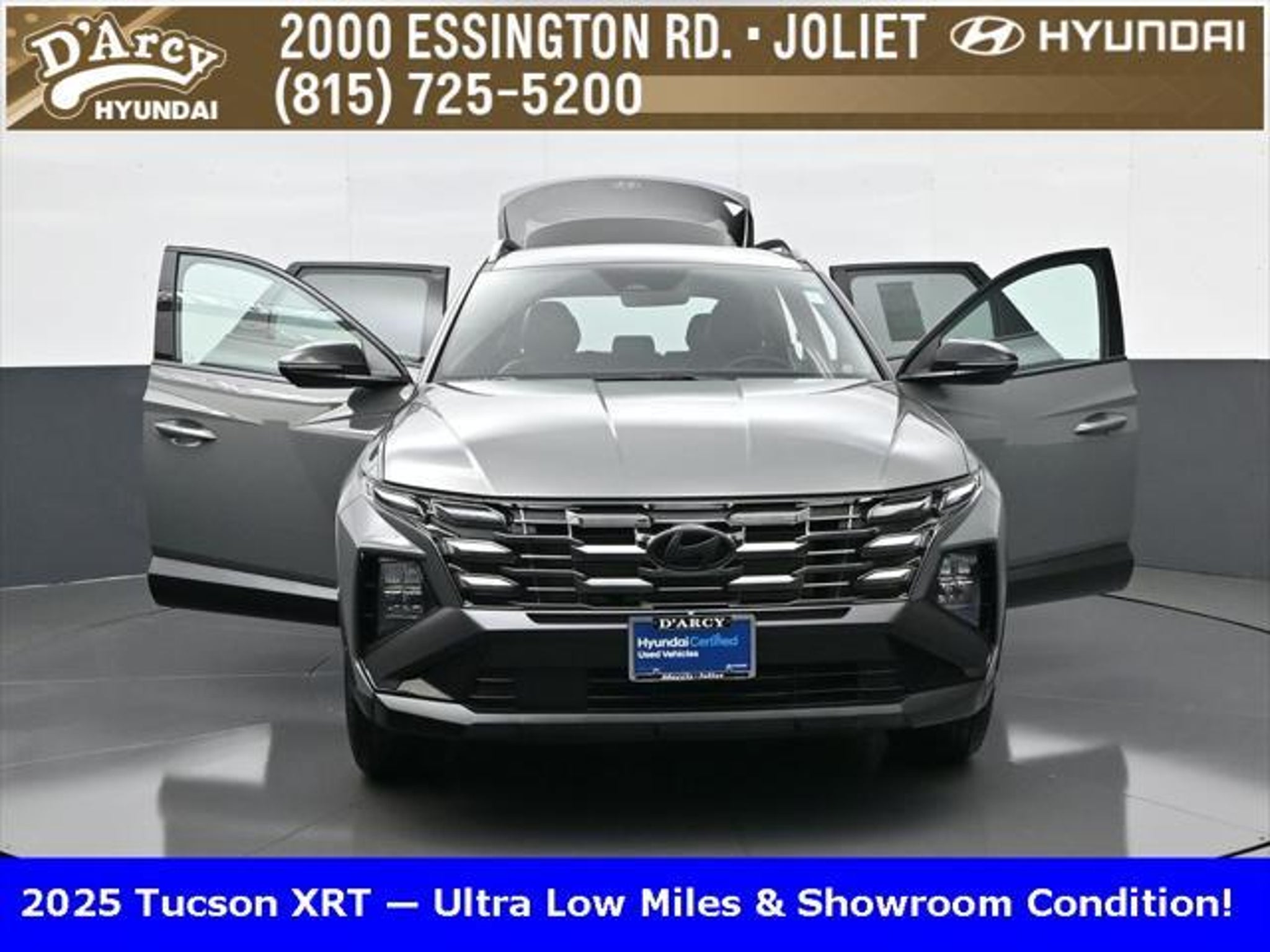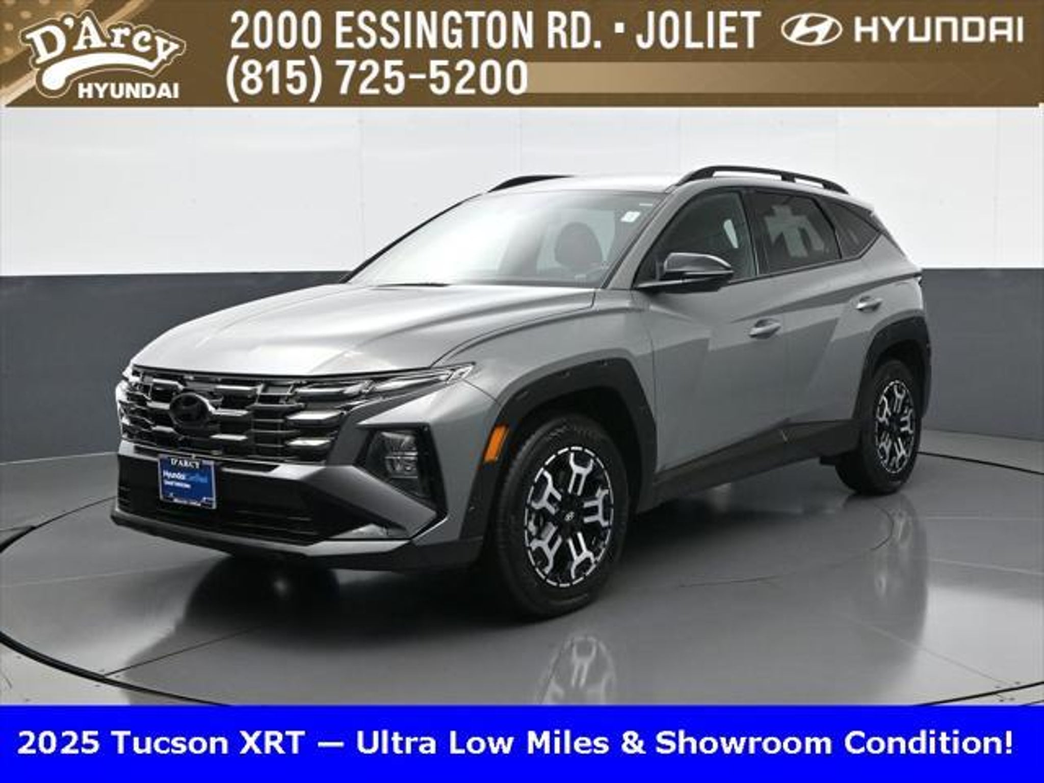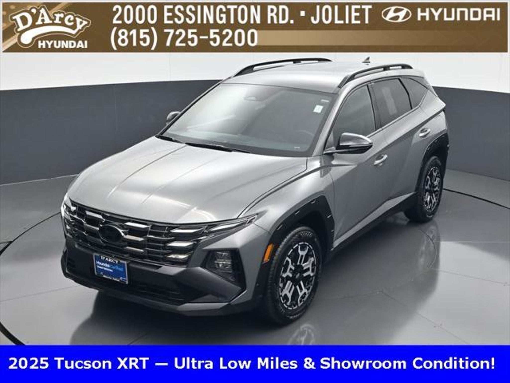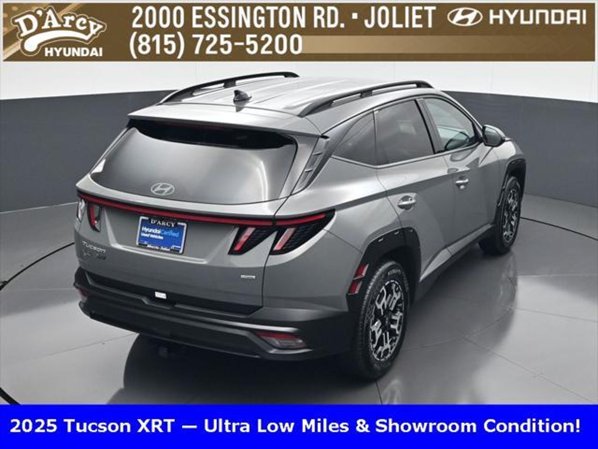 Clean CARFAX. ONE OWNER LOCAL TRADE!, LOW MILES!, GREAT VEHICLE HISTORY!, BOUGHT HERE SERVICED HERE!, HYUNDAI CERTIFIED!, FULLY SERVICED AND READY TO GO!. Certified. Hampton Gray 2025 Hyundai Tucson XRT AWD 8-Speed Automatic with SHIFTRONIC 2.5L I4 DGI DOHC 16V LEV3-SULEV30 187hp Hyundai Certified Used Vehicles Details: * Powertrain Limited Warranty: 120 Month/100,000 Mile (whichever comes first) from original in-service date * Limited Warranty: 60 Month/60,000 Mile (whichever comes first) from original in-service date * Vehicle History * Includes 10-year/Unlimited Mileage Roadside Assistance with Rental Car and Trip Interruption Reimbursement; Please See Dealers for Specific Vehicle Eligibility Requirements. 10-Year/100,000 Mile Hybrid/EV Battery Warranty. 3-Months SiriusXM Trial Subscription. Complimentary 1 Year (Connected Care & Remote Pkgs). * 173 Point Inspection * Roadside Assistance * Warranty Deductible: $50 Discover the D'Arcy Difference! We care - we are here and we are ready to help! Stop by today to see up to date information, including showroom and service hours, and how to make an appointment or schedule delivery. D'Arcy Motors has been serving Joliet and its surrounding communities for over 25 years. Our business philosophy, which is to sell cars one car at a time and to make the guest the most important part of the process, has remained the same since 1991. Contact us today to experience the D'Arcy Difference! Pulse® Safer Braking Technology for $399 added to all New and CPO"“ The rear-end collision deterrent that rapidly pulses your third brake light four times before going solid when you press the brake pedal. This feature enhances safety by helping alert trailing drivers. Discover the D'Arcy Difference! We care - we are here and we are ready to help! Stop by today to see up to date information, including showroom and service hours, and how to make an appointment or schedule delivery. D'Arcy Motors has been serving Joliet and its surrounding communities for over 25 years. Our business philosophy, which is to sell cars one car at a time and to make the guest the most important part of the process, has remained the same since 1991. Contact us today to experience the D'Arcy Difference! 24/30 City/Highway MPG This 2025 Hyundai Tucson comes equipped with: Option Group 01, 4-Wheel Disc Brakes, 6 Speakers, ABS brakes, Air Conditioning, Alloy wheels, AM/FM radio: SiriusXM, Apple CarPlay & Android Auto, Auto High-beam Headlights, Automatic temperature control, Brake assist, Bumpers: body-color, Cargo Blocks, Cargo Net, Cargo Tray, Carpeted Floor Mats, Delay-off headlights, Driver door bin, Driver vanity mirror, Dual front impact airbags, Dual front side impact airbags, Electronic Stability Control, Emergency communication system: Bluelink, First Aid Kit, Four wheel independent suspension, Front anti-roll bar, Front Bucket Seats, Front Center Armrest, Front dual zone A/C, Front reading lights, Fully automatic headlights, H-Tex Seat Trim, Heated door mirrors, Heated Front Bucket Seats, Heated front seats, Illuminated entry, Leather steering wheel, Low tire pressure warning, Occupant sensing airbag, Outside temperature display, Overhead airbag, Overhead console, Panic alarm, Passenger door bin, Passenger vanity mirror, Power door mirrors, Power driver seat, Power Liftgate, Power steering, Power windows, Radio data system, Radio: AM/FM/HD Audio System, Rear anti-roll bar, Rear reading lights, Rear seat center armrest, Rear side impact airbag, Rear window defroster, Rear window wiper, Remote keyless entry, Roadside Assistance Kit, Security system, Speed control, Split folding rear seat, Spoiler, Steering wheel mounted audio controls, Tachometer, Telescoping steering wheel, Tilt steering wheel, Traction control, Trip computer, Turn signal indicator mirrors, Variably intermittent wipers, Wheel Locks, and Wheels: 18 XRT-Exclusive Alloy.