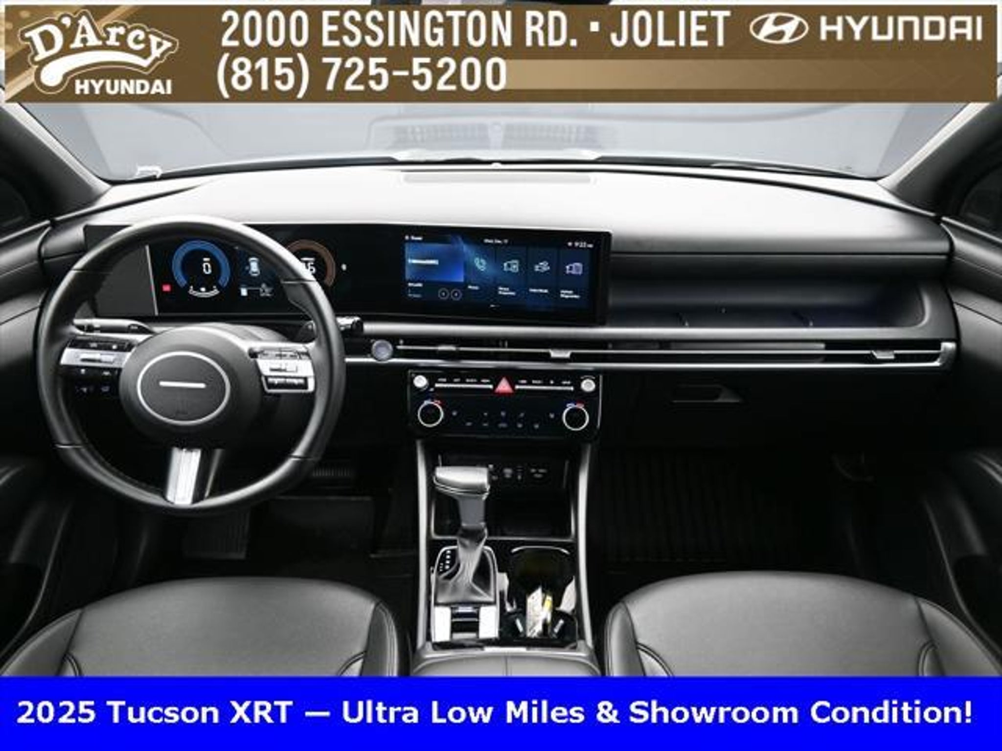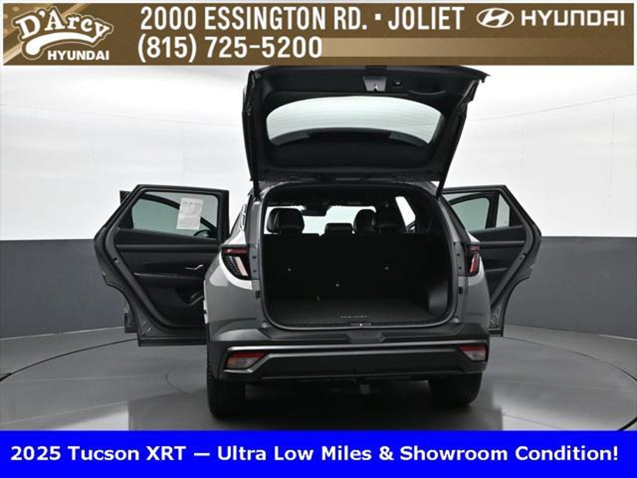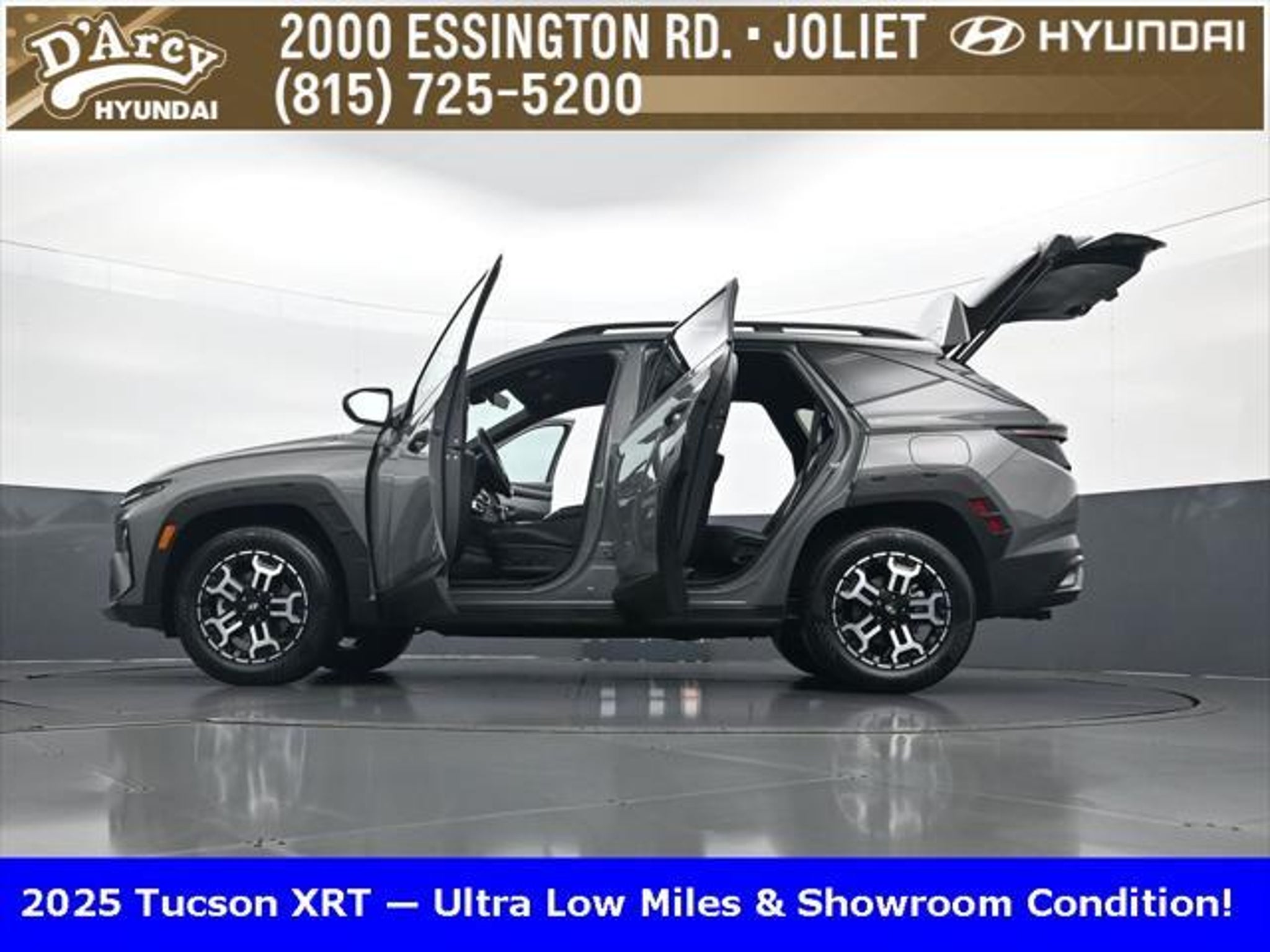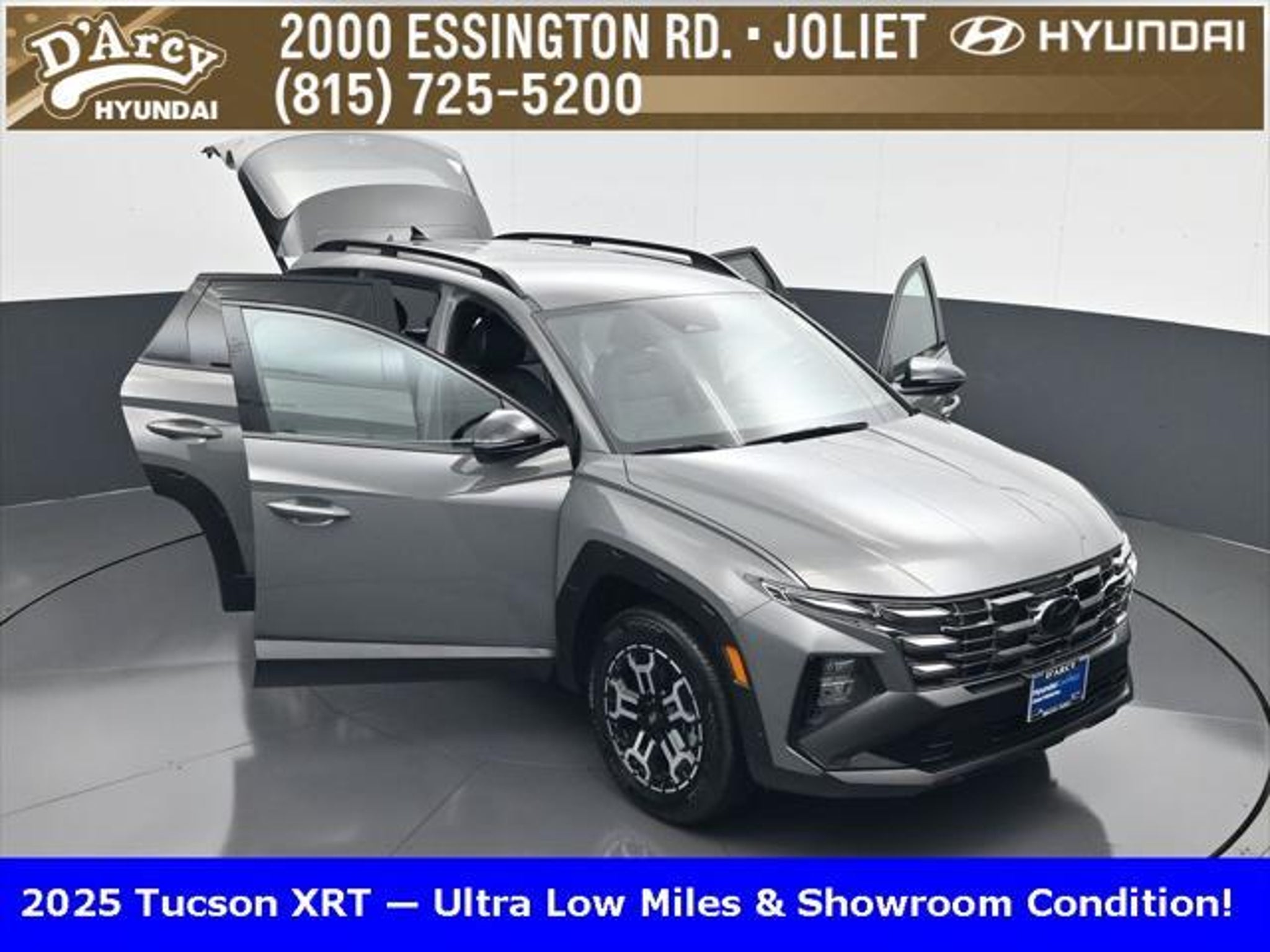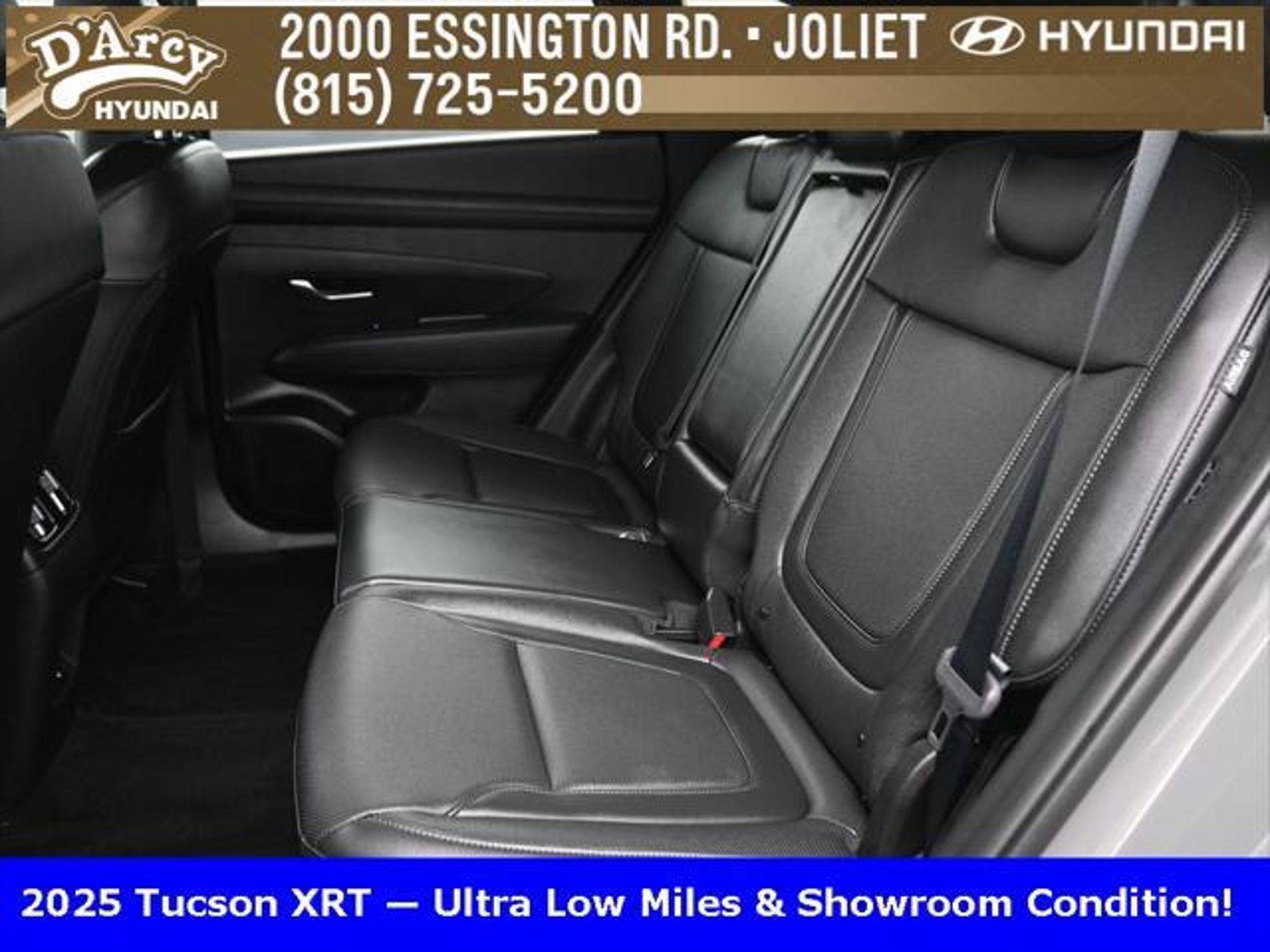Clean CARFAX. ONE OWNER LOCAL TRADE!, LOW MILES!, GREAT VEHICLE HISTORY!, BOUGHT HERE SERVICED HERE!, HYUNDAI CERTIFIED!, FULLY SERVICED AND READY TO GO!. Certified. Hampton Gray 2025 Hyundai Tucson XRT AWD 8-Speed Automatic with SHIFTRONIC 2.5L I4 DGI DOHC 16V LEV3-SULEV30 187hp Hyundai Certified Used Vehicles Details: * Powertrain Limited Warranty: 120 Month/100,000 Mile (whichever comes first) from original in-service date * Limited Warranty: 60 Month/60,000 Mile (whichever comes first) from original in-service date * Vehicle History * Includes 10-year/Unlimited Mileage Roadside Assistance with Rental Car and Trip Interruption Reimbursement; Please See Dealers for Specific Vehicle Eligibility Requirements. 10-Year/100,000 Mile Hybrid/EV Battery Warranty. 3-Months SiriusXM Trial Subscription. Complimentary 1 Year (Connected Care & Remote Pkgs). * 173 Point Inspection * Roadside Assistance * Warranty Deductible: $50 Discover the D'Arcy Difference! We care - we are here and we are ready to help! Stop by today to see up to date information, including showroom and service hours, and how to make an appointment or schedule delivery. D'Arcy Motors has been serving Joliet and its surrounding communities for over 25 years. Our business philosophy, which is to sell cars one car at a time and to make the guest the most important part of the process, has remained the same since 1991. Contact us today to experience the D'Arcy Difference! Pulse® Safer Braking Technology for $399 added to all New and CPO"“ The rear-end collision deterrent that rapidly pulses your third brake light four times before going solid when you press the brake pedal. This feature enhances safety by helping alert trailing drivers. Discover the D'Arcy Difference! We care - we are here and we are ready to help! Stop by today to see up to date information, including showroom and service hours, and how to make an appointment or schedule delivery. D'Arcy Motors has been serving Joliet and its surrounding communities for over 25 years. Our business philosophy, which is to sell cars one car at a time and to make the guest the most important part of the process, has remained the same since 1991. Contact us today to experience the D'Arcy Difference! 24/30 City/Highway MPG This 2025 Hyundai Tucson comes equipped with: Option Group 01, 4-Wheel Disc Brakes, 6 Speakers, ABS brakes, Air Conditioning, Alloy wheels, AM/FM radio: SiriusXM, Apple CarPlay & Android Auto, Auto High-beam Headlights, Automatic temperature control, Brake assist, Bumpers: body-color, Cargo Blocks, Cargo Net, Cargo Tray, Carpeted Floor Mats, Delay-off headlights, Driver door bin, Driver vanity mirror, Dual front impact airbags, Dual front side impact airbags, Electronic Stability Control, Emergency communication system: Bluelink, First Aid Kit, Four wheel independent suspension, Front anti-roll bar, Front Bucket Seats, Front Center Armrest, Front dual zone A/C, Front reading lights, Fully automatic headlights, H-Tex Seat Trim, Heated door mirrors, Heated Front Bucket Seats, Heated front seats, Illuminated entry, Leather steering wheel, Low tire pressure warning, Occupant sensing airbag, Outside temperature display, Overhead airbag, Overhead console, Panic alarm, Passenger door bin, Passenger vanity mirror, Power door mirrors, Power driver seat, Power Liftgate, Power steering, Power windows, Radio data system, Radio: AM/FM/HD Audio System, Rear anti-roll bar, Rear reading lights, Rear seat center armrest, Rear side impact airbag, Rear window defroster, Rear window wiper, Remote keyless entry, Roadside Assistance Kit, Security system, Speed control, Split folding rear seat, Spoiler, Steering wheel mounted audio controls, Tachometer, Telescoping steering wheel, Tilt steering wheel, Traction control, Trip computer, Turn signal indicator mirrors, Variably intermittent wipers, Wheel Locks, and Wheels: 18 XRT-Exclusive Alloy.