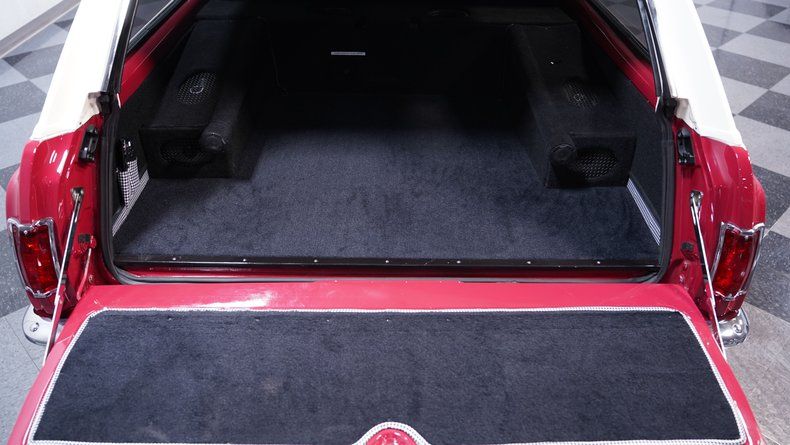Inside, the interior offers a refined and comfortable experience, with customized upholstery that remains free of any rips or tears. The dash features clear Dakota Digital gauges, providing a modern touch to the classic cabin. The rear seat center console adds convenience with cup holders and air vents, while the trunk area surprises with a power folding TV and speakers, powered by a battery boasting 4-5 hours of watch time. The overall interior quality is exceptional, showing very well with a well-maintained carpet and a center console that complements the vintage style.