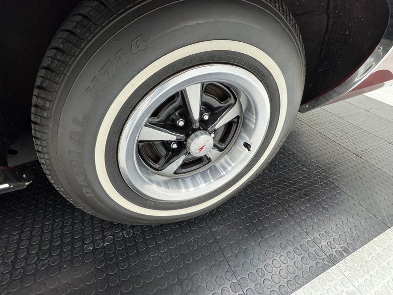 Honduras Maroon paint coats this car and a repaint was done in two stage application. To extenuate the raised portion of the pointed hood, a white pinstripe borders the proud section, then continues down the body of the car and around the raised section of the trunk. A white vinyl Landau style roof includes the fixed quarter windows and up front, the split grille surrounds the nose with the Pontiac emblem dead center, while single headlights make a final appearance on the Grand Prix in '75. The tail lights were redesigned for '75 and consist of five adjacent strips of light, flanking the fancy GP emblem over the keyhole and this is repeated on the hood ornament. 15-inch Pontiac Rally II wheels look just right and other than a small scratch by wheel opening trim, the paint and metal are in fantastic condition.