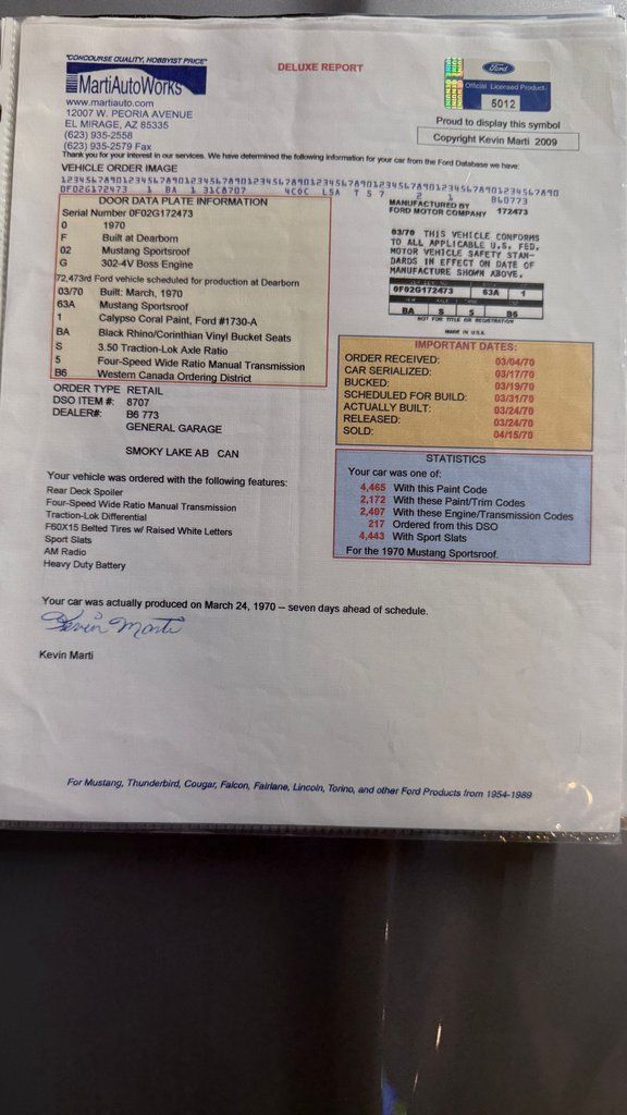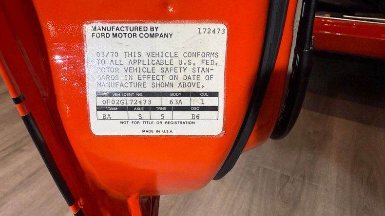 Serial Number: 0F025G172473 / 0 = 1970 / F = Built at Dearborn / 02 = Mustang Sportsroof / G = 302-4V Boss Engine / 72,473rd Ford Vehicle Scheduled for Reproduction at Dearborn / 03/70 = Built March, 1970 / 63A = Mustang Sportsroof / 1 = Calypso Coral / BA = Black Rhino/ Corinthian Vinyl Bucket Seats