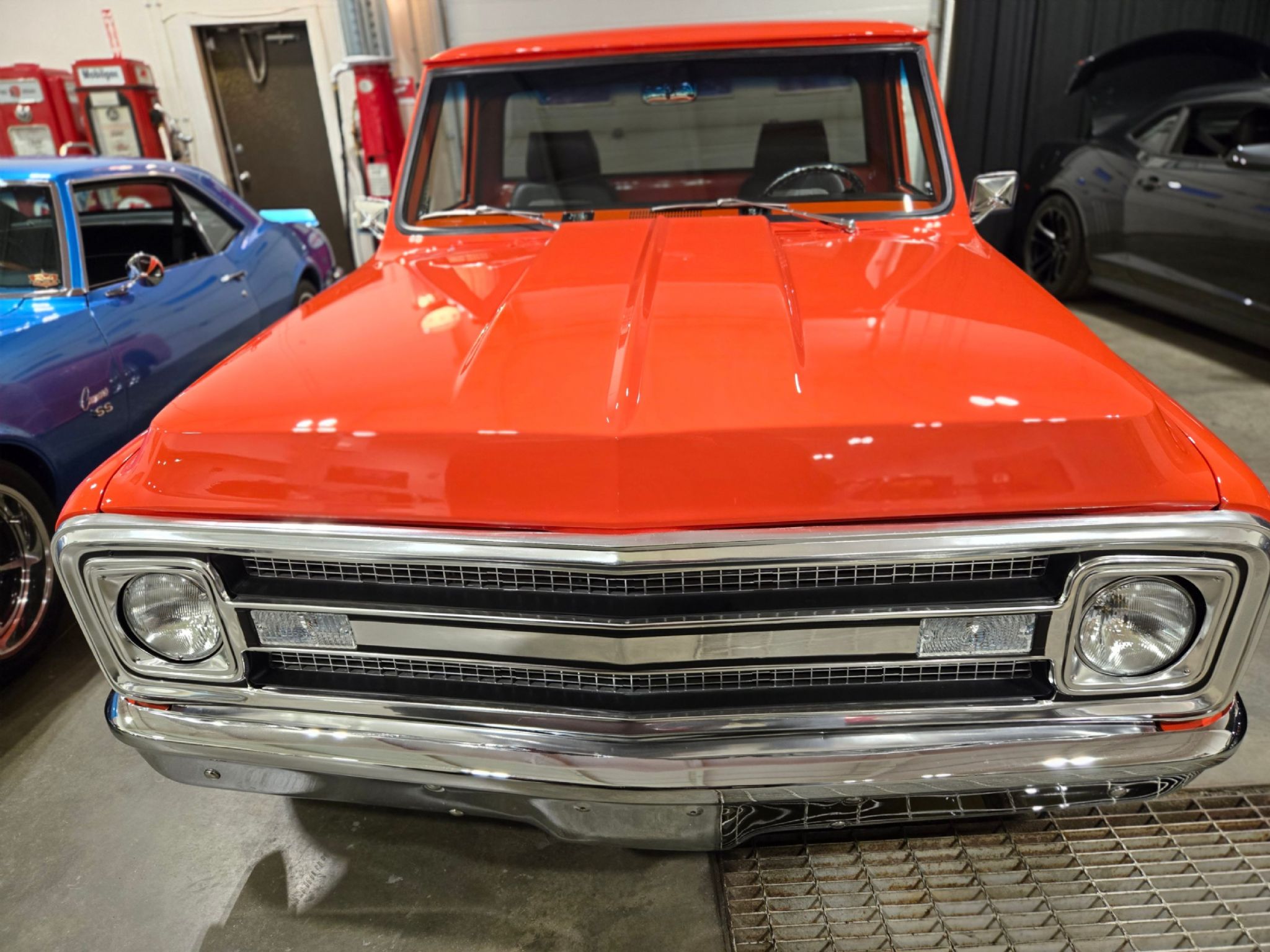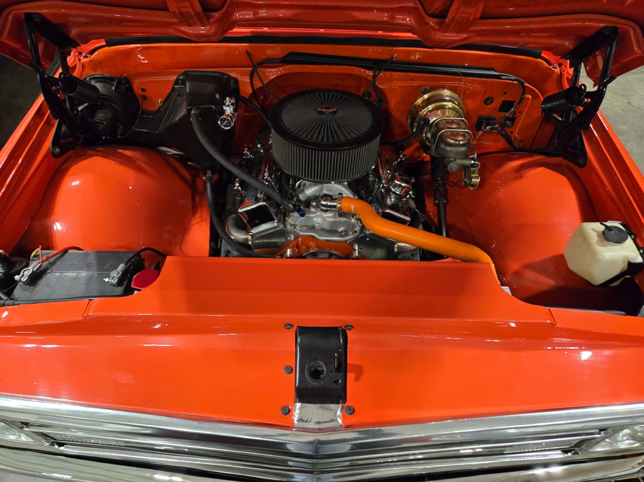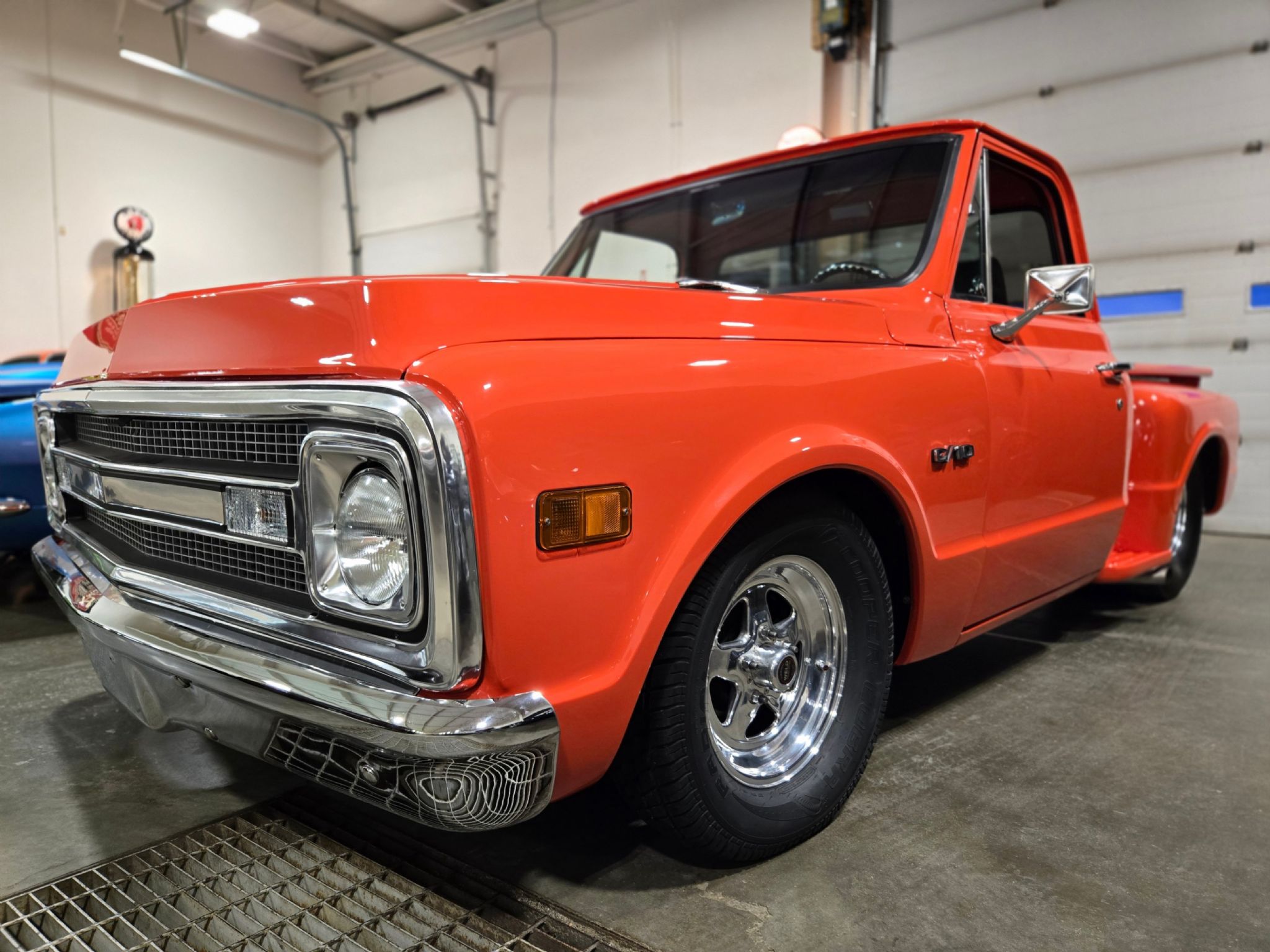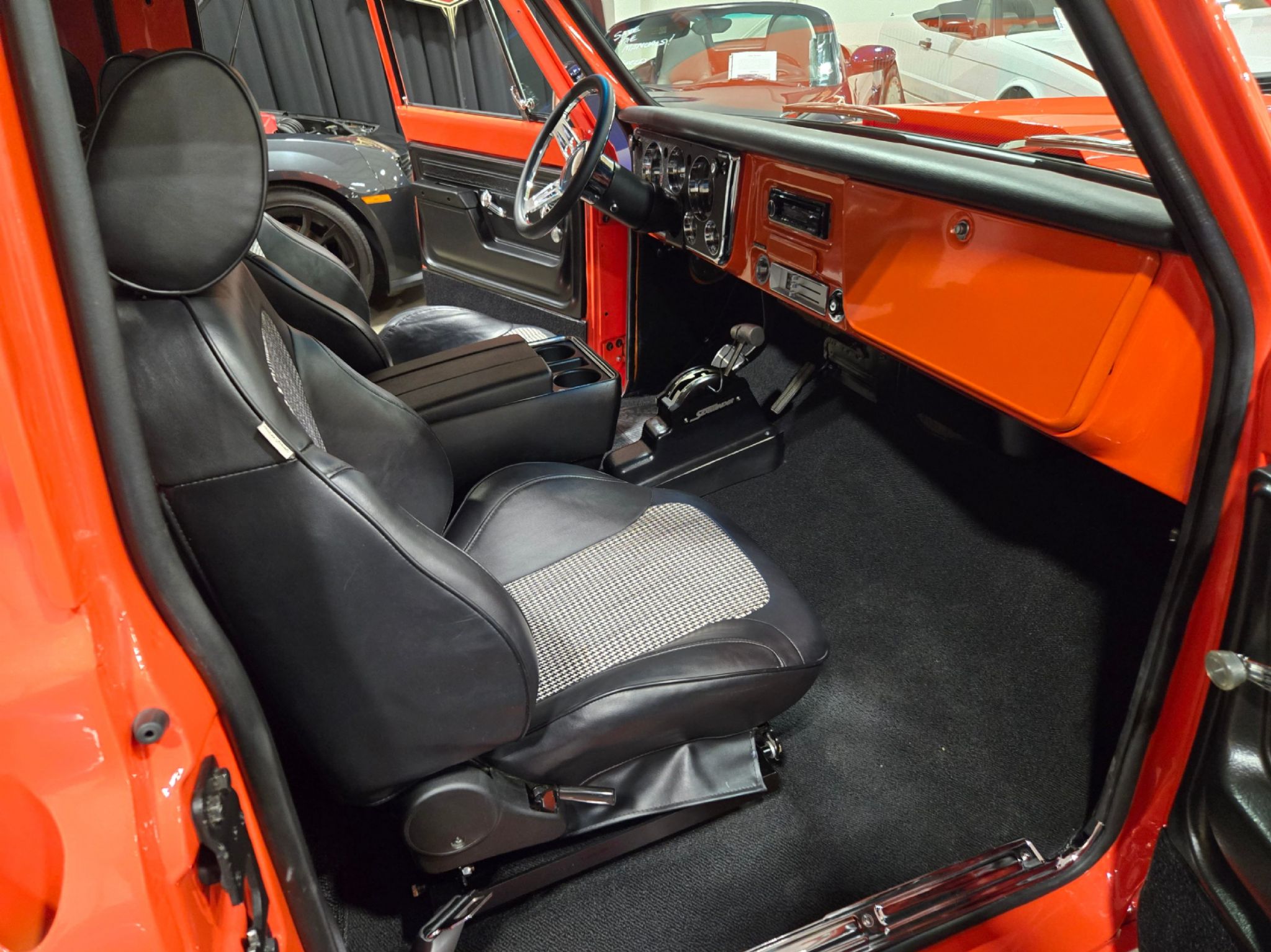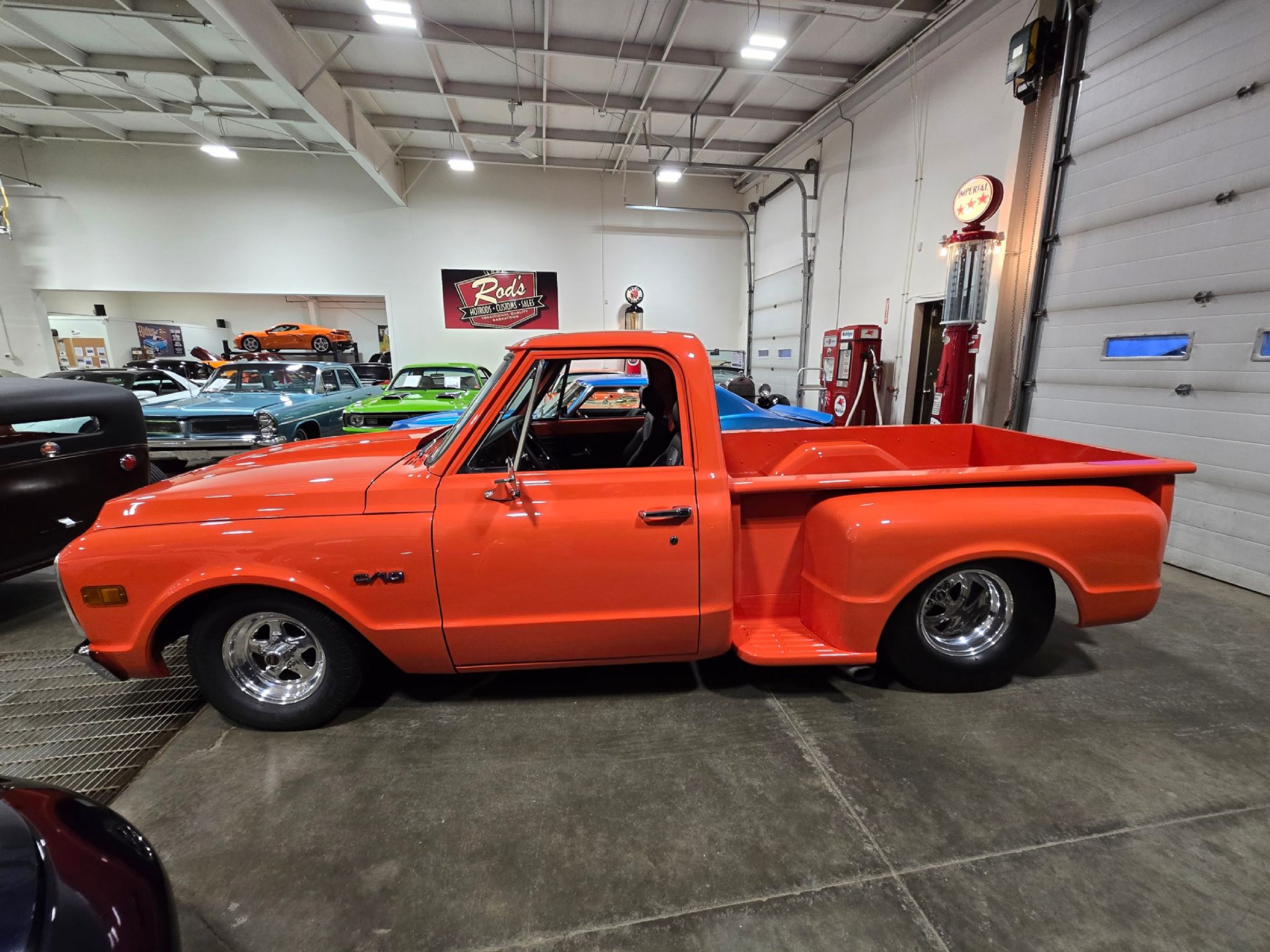 1969 Chevrolet C/10 Pro Street Regular Cab, Step side. Incredible build with high attention to detail, and now with the perfect stance thanks to a little bit of lowering at our shop. No issues with clearance or rubbing, but the perfect look! Starting under the hood lies a warmed up 350 with 10:1 pistons, gear driven cam, dart aluminum heads, Edelbrock intake and carb plus headers and lots of polished chrome and aluminum accessories. Behind that is a TH-400 with shift kit, reverse pattern, manual valve body and trans-brake. The rear end is quite narrow thanks to the huge rear tires! Highly detailed engine bay with high gloss paint on the inner fenders, rad cover and firewall thats been nicely cleaned up. Wiring is all hidden well. No power steering, but power brakes. Electric fans now in place on the aluminum rad. Truck sounds ferocious. Chrome and bright work are fantastic, and the paint is top notch. Pictures dont do it justice as the orange has a lot of pearl and metallic flake in it, so in the sunshine it has a very orange creamsicle look to it. Everything on this truck is restored or new, with nothing left to do. Cowl hood is a nice touch, and the power antenna has been frenched in on the passenger side. The box has a lot of custom work with larger tubs to accommodate wheels/tires, and the rear tailgate has been grafted to the box sides for a seamless rear end. Both the inside and outside of the box feature show quality paint with lots of gloss! No rear bumper and the roll pan in place along with the grafted tailgate feature Corvette signal/brake lights. Dual exhaust exits out the sides in front of each rear wheel. Interior is brand new with new premium door panels, new carpets and leather bolstered Procar bucket seats with houndstooth cloth inserts. These are some of the most comfortable seats youll find in any old truck, and they have custom powder coated tracks. Between them is a restored factory center console and a new shifter in front of that. The chrome trimmed vinyl headliner is new and the carpets finish off the cab very well. Heater controls are stock, but theres a modern stereo in place on the dashboard. The dash cluster features all new Intellitronix electronic gauges with full display. A chrome tilt column and new wheel finish things off perfectly. The bottom of the truck is just impressive as the top. Digital odometer shows 1200 kms since the truck was built. This is one stand out truck that could compete and win at any car show.