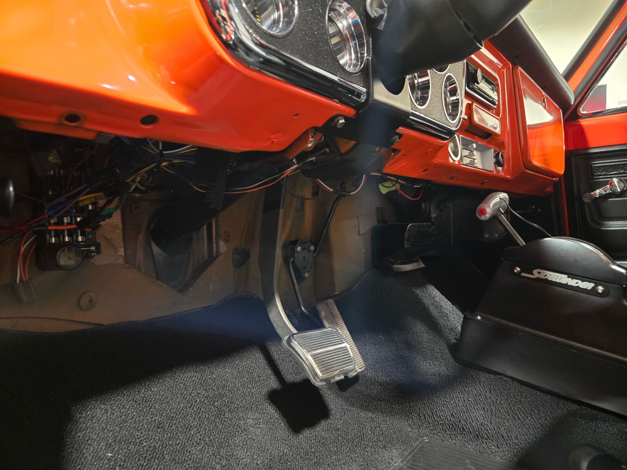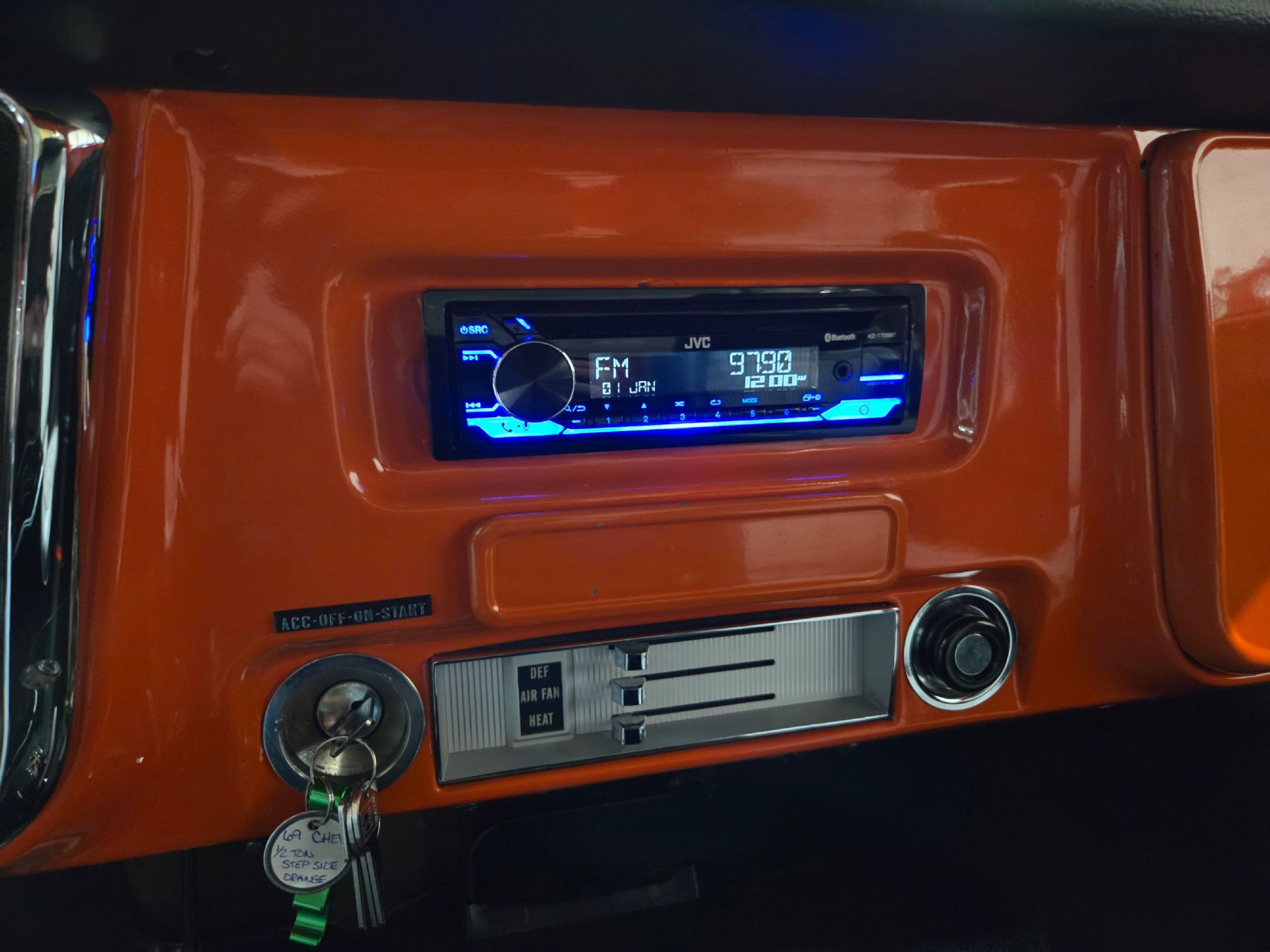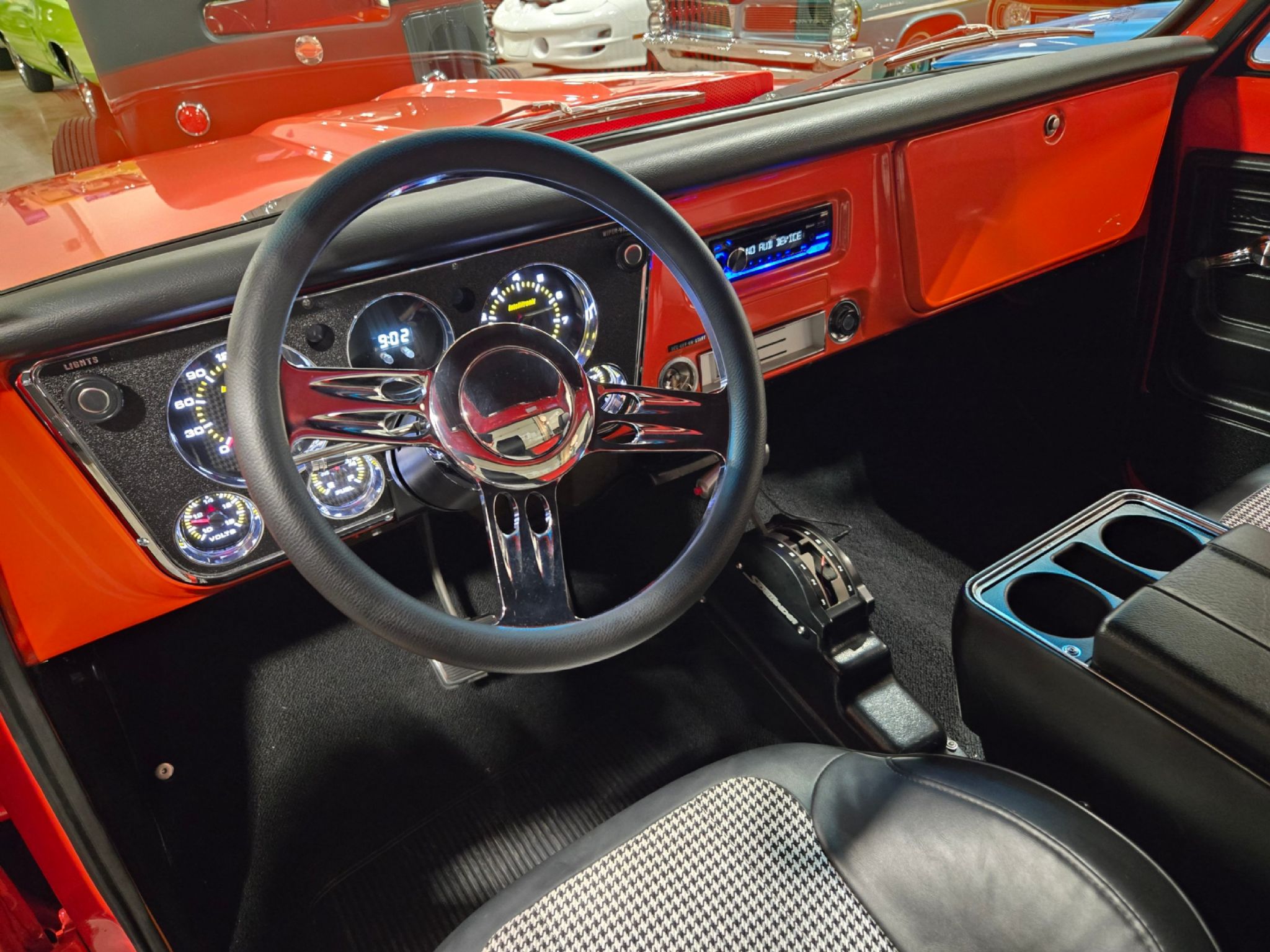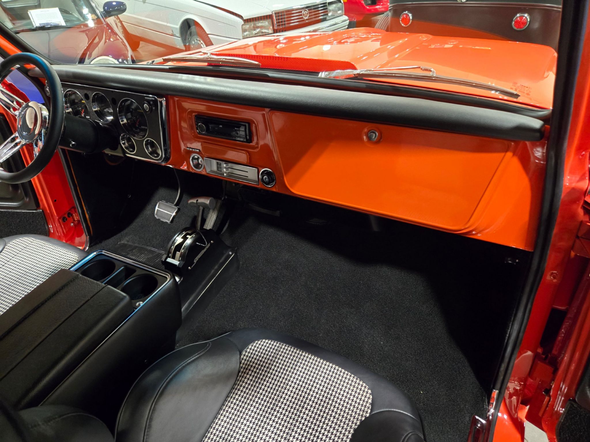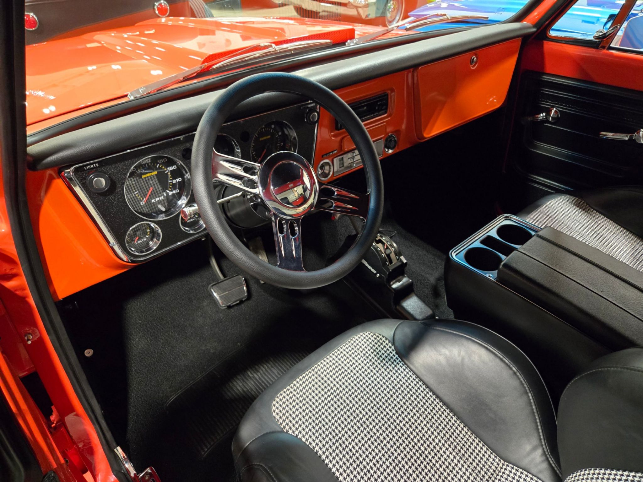 1969 Chevrolet C/10 Pro Street Regular Cab, Step side. Incredible build with high attention to detail, and now with the perfect stance thanks to a little bit of lowering at our shop. No issues with clearance or rubbing, but the perfect look! Starting under the hood lies a warmed up 350 with 10:1 pistons, gear driven cam, dart aluminum heads, Edelbrock intake and carb plus headers and lots of polished chrome and aluminum accessories. Behind that is a TH-400 with shift kit, reverse pattern, manual valve body and trans-brake. The rear end is quite narrow thanks to the huge rear tires! Highly detailed engine bay with high gloss paint on the inner fenders, rad cover and firewall thats been nicely cleaned up. Wiring is all hidden well. No power steering, but power brakes. Electric fans now in place on the aluminum rad. Truck sounds ferocious. Chrome and bright work are fantastic, and the paint is top notch. Pictures dont do it justice as the orange has a lot of pearl and metallic flake in it, so in the sunshine it has a very orange creamsicle look to it. Everything on this truck is restored or new, with nothing left to do. Cowl hood is a nice touch, and the power antenna has been frenched in on the passenger side. The box has a lot of custom work with larger tubs to accommodate wheels/tires, and the rear tailgate has been grafted to the box sides for a seamless rear end. Both the inside and outside of the box feature show quality paint with lots of gloss! No rear bumper and the roll pan in place along with the grafted tailgate feature Corvette signal/brake lights. Dual exhaust exits out the sides in front of each rear wheel. Interior is brand new with new premium door panels, new carpets and leather bolstered Procar bucket seats with houndstooth cloth inserts. These are some of the most comfortable seats youll find in any old truck, and they have custom powder coated tracks. Between them is a restored factory center console and a new shifter in front of that. The chrome trimmed vinyl headliner is new and the carpets finish off the cab very well. Heater controls are stock, but theres a modern stereo in place on the dashboard. The dash cluster features all new Intellitronix electronic gauges with full display. A chrome tilt column and new wheel finish things off perfectly. The bottom of the truck is just impressive as the top. Digital odometer shows 1200 kms since the truck was built. This is one stand out truck that could compete and win at any car show.