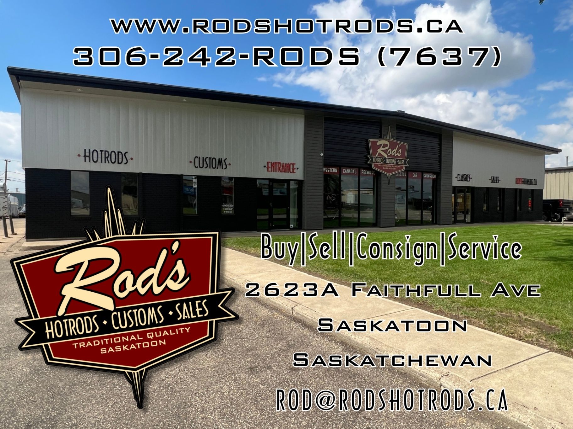 Located in Saskatoon Saskatchewan, Rods Hotrods is Western Canadas Premier Collector Car showroom! We specialize in making automotive dreams come true with a stock of over 90 special interest vehicles. Find Classic Cars, Antiques, American Muscle, Hot Rods, Sports Cars and anything else we think is just plain cool in our showroom at 2623A Faithfull Ave, Saskatoon SK. Were always hunting for the coolest cars to add to our collection, and things change fast! Check our website often, and dont miss an opportunity to take home that dream car youve always wanted! www.rodshotrods. ca . Our website also features an online store to shop for Rods branded swag - we ship worldwide!