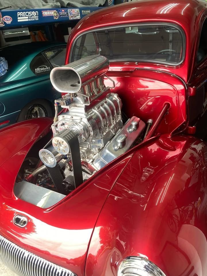This 1941 Willys Overland Americar is a restored resto-mod coupe built as an all-steel, all-metal car and presented in show-quality condition. It is set up for E-85 fuel and is powered by a Chevy 468ci engine topped with an 871 Mooneyham blower and tall 4-port Hilborn injection, along with a Jazil belt drive and Mizere water pump and radiator. It sits on a 2x3 chassis with Jaguar torsion bar front suspension and shocks, and the rear features a Ford 9-inch with coil-over 4 link, Detroit locker, and Currie 35 spline axle. The interior features black leather and suede bucket seats with black carpeting, and the dash is noted as a digital setup with carbon fiber gauges. Additional equipment includes power steering, power brakes, and power windows. The car is described as excellent to mint, and the engine is reported running with racing gas.