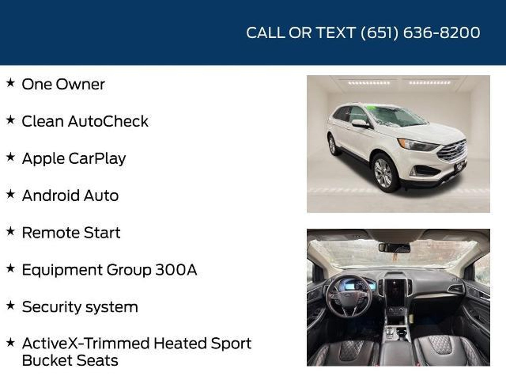 Midway Ford is honored to offer this attractive-looking 2023 Ford Edge Titanium in Star White Metallic Tri-Coat beautifully equipped with: AWD 8-Speed Automatic EcoBoost 2.0L I4 GTDi DOHC Turbocharged VCT One Owner Clean AutoCheck Apple CarPlay Android Auto Remote Start ActiveX-Trimmed Heated Sport Bucket Seats Equipment Group 300A Heated front seats Security system. 21/28 City/Highway MPG Recent Arrival! Odometer is 11944 miles below market average! CALL OR TEXT: Stop by and see us at: 2777 Snelling Ave N Saint Paul Minnesota 55113