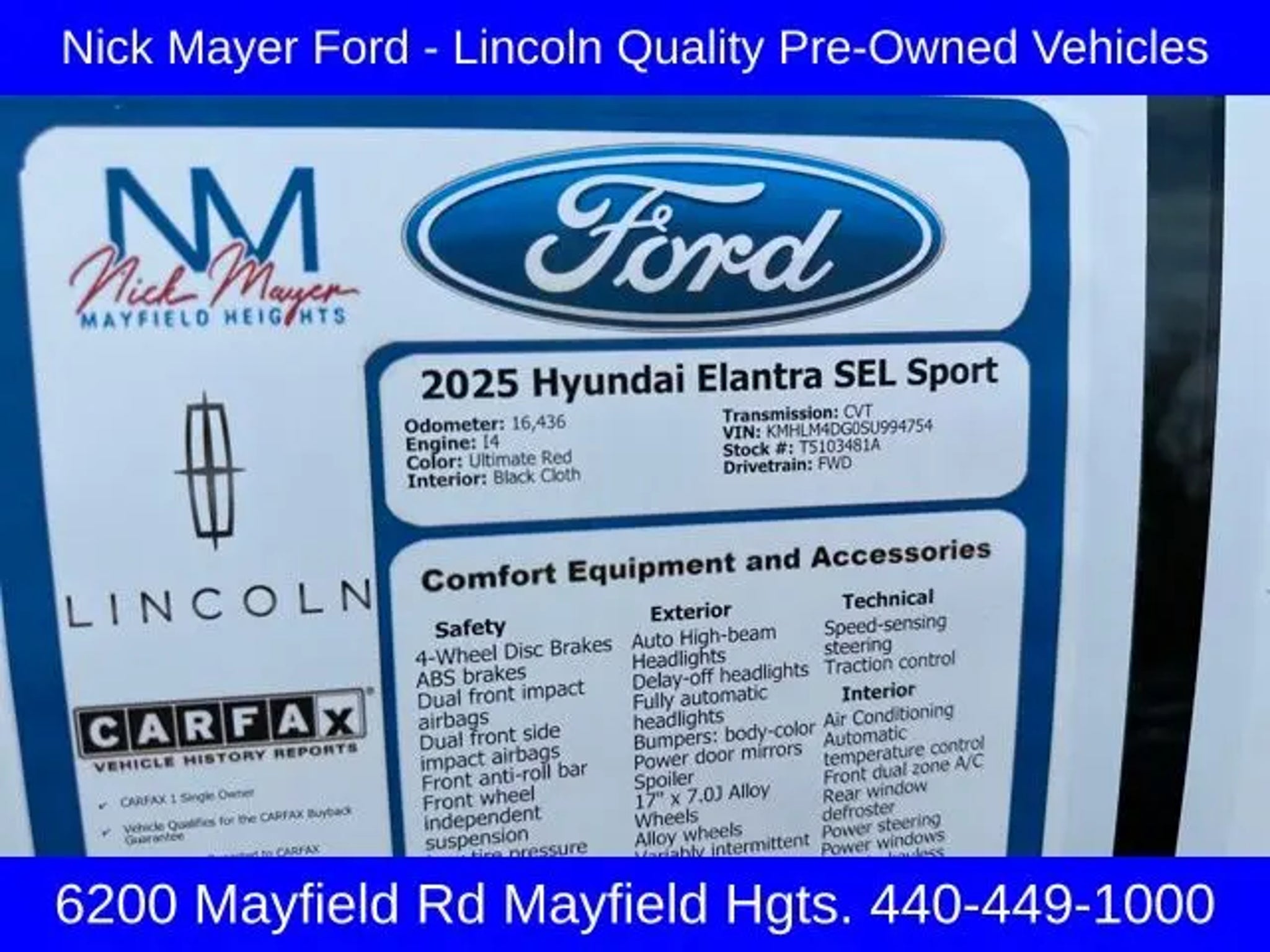 Discover the Captivating 2025 Hyundai Elantra SEL Sport: A Harmonious Blend of Style, Efficiency, and Technology. Meticulously crafted with the discerning driver in mind, the 2025 Hyundai Elantra SEL Sport is a testament to the brand's commitment to excellence. Boasting a striking exterior in the vibrant hue of Ultimate Red, this sedan commands attention wherever it goes. Complementing the bold aesthetics are a suite of premium features that elevate the driving experience to new heights. "¢ Alloy Door Sills "¢ Reversible Cargo Tray "¢ Cargo Net "¢ First Aid Kit Elevate your daily commute with the seamless integration of Apple CarPlay and Android Auto, allowing you to stay connected and entertained on the go. The premium cloth seat trim and leather-wrapped steering wheel provide a refined and comfortable cabin, while the automatic temperature control and rear window defroster ensure your comfort in any weather. Beneath the sleek exterior, the Elantra SEL Sport is powered by a responsive I4 engine paired with a smooth-shifting CVT transmission, delivering an exceptional balance of performance and efficiency. With an impressive 30 city and 39 highway MPG, this sedan promises to keep you moving without compromising your fuel budget. Safety is of the utmost importance, and the Elantra SEL Sport is equipped with a comprehensive suite of advanced safety features, including dual front impact airbags, dual front side impact airbags, and electronic stability control. The rear-view camera and auto high-beam headlights further enhance your confidence on the road. Discover the perfect blend of style, technology, and efficiency in the 2025 Hyundai Elantra SEL Sport. Experience the difference a truly exceptional sedan can make in your daily driving. Visit our showroom today and let us demonstrate how this captivating Elantra can elevate your automotive journey.
