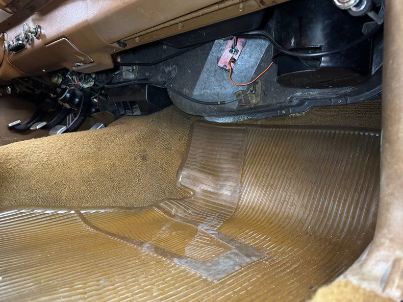 Our consignor tells us the interior is original and it's fantastic! Iconically period with Ginger vinyl coverage that begins with big stitched sectional designs on the door panels and translating to ribbed inserts on the split bench in front and rear bench and each is in great shape. If we weren't sticklers, we wouldn't have noticed the rim crack of the otherwise nice steering wheel as it frames a high, horizontal speedometer and boxy gauges on a clean dash that includes an AM radio, black faced knobs, and a vent. The golden carpet shows some slight wear but is in good condition, protected by vintage style clear plastic mats. The headliner is high and tight, and the trunk is lined with a plaid mat and is also clean underneath it.