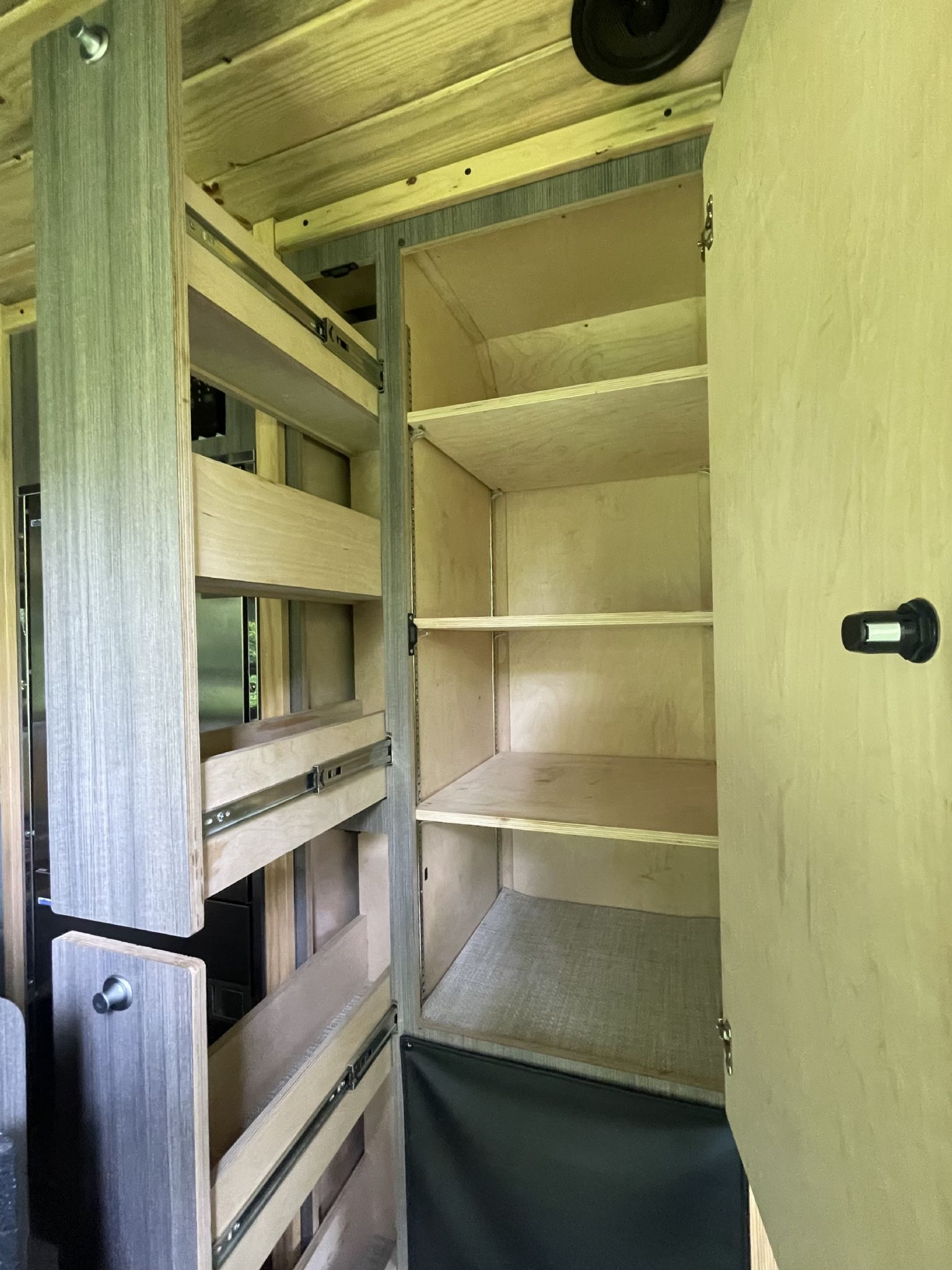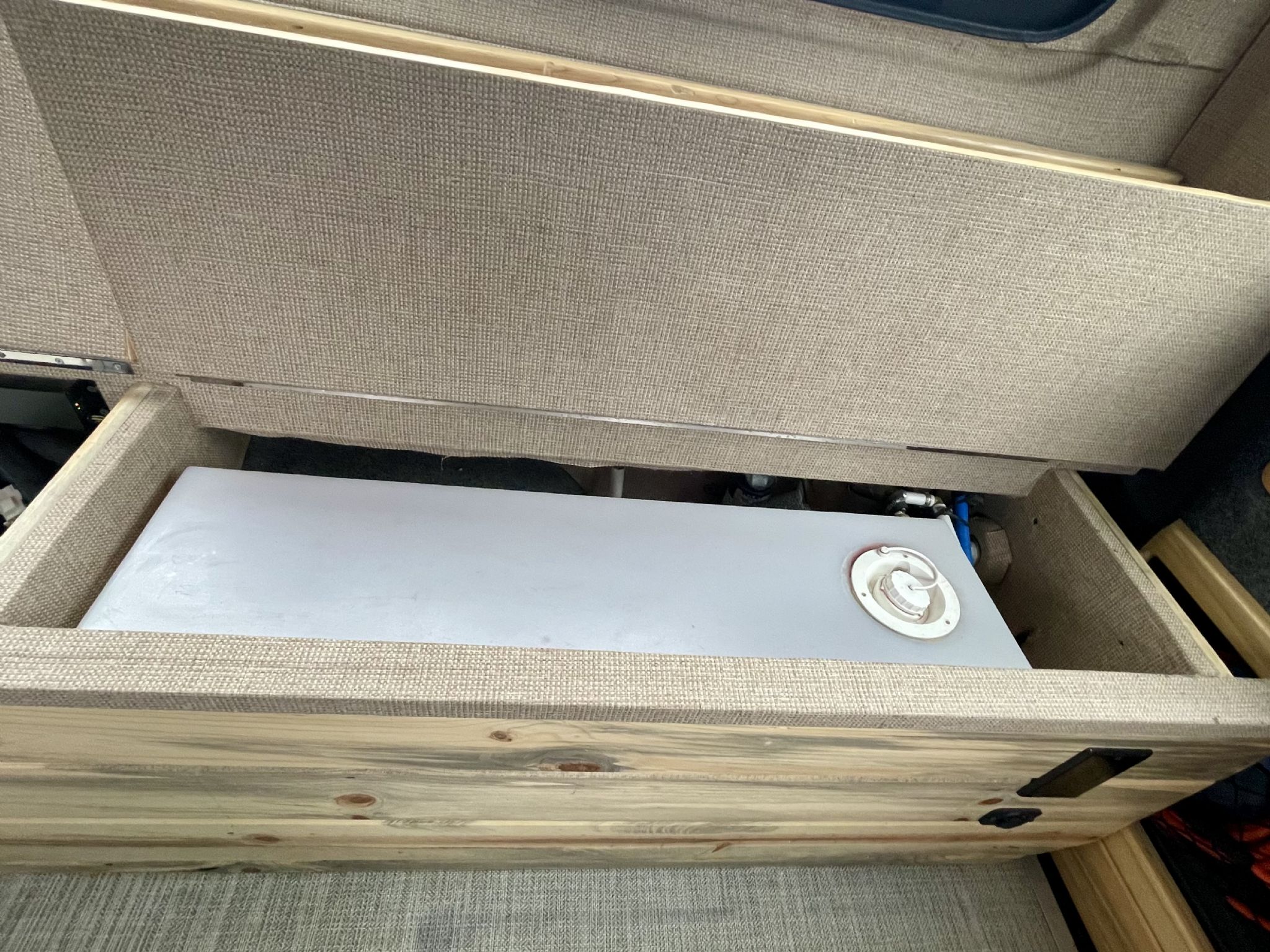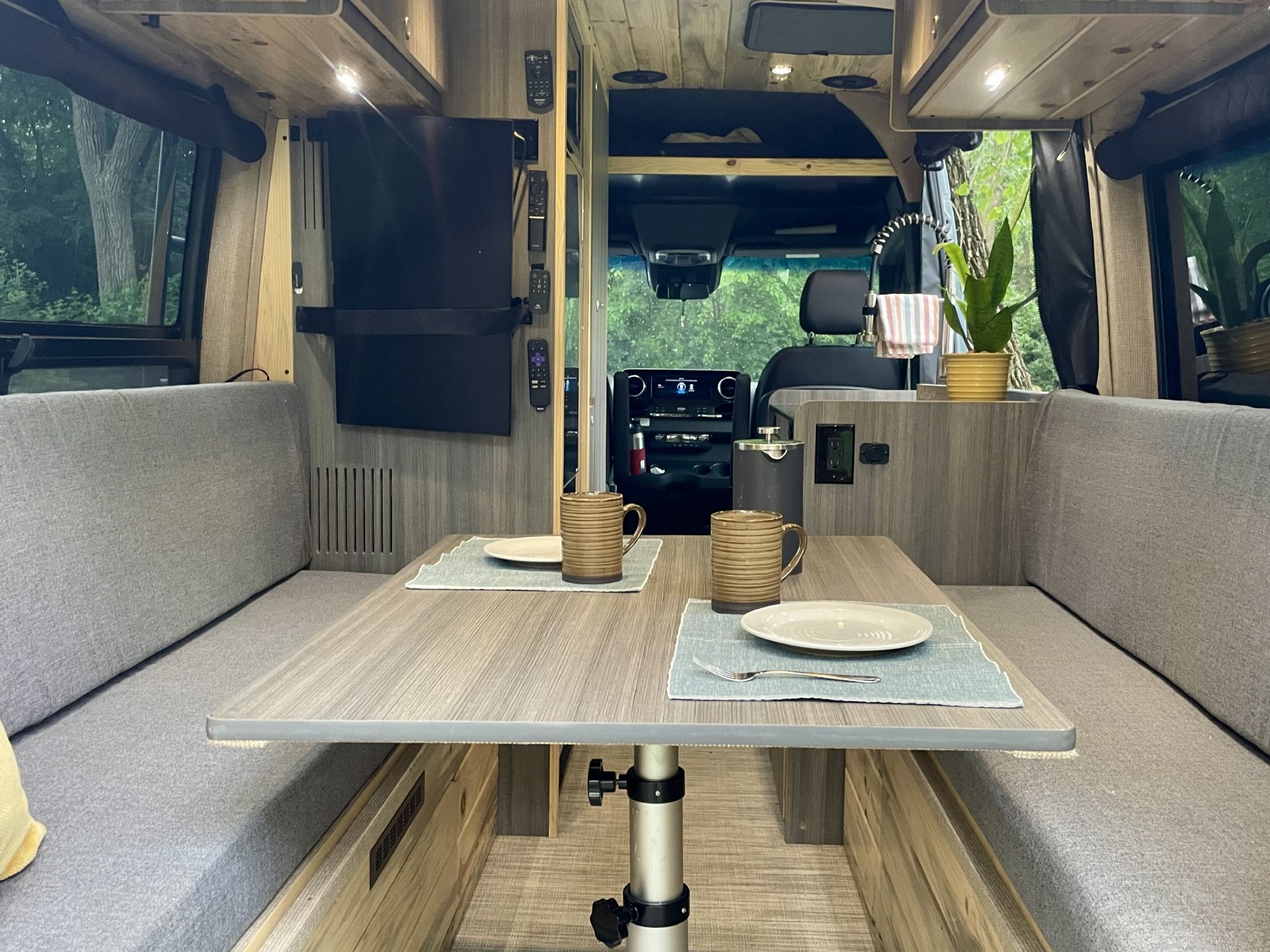 Beatle Kill Pine throughout, 2-pull large out pantry drawers, large storage cabinet, with additional ample cabinet storage above the beds, unique large Isotherm refrigerator with separate large freezer, microwave, 2000 watt inverter, dinette which converts to a bed, beautiful fabric wrap on all exposed metal surfaces, powerful Pioneer Stereo with blue tooth capability, large TV, aquahot heater that provides near instant hot water, outside shower, and plenty of LED lighting inside and out! Laveo dry flush toilet, AC and Max Air fan too, 31-gallon fresh water and 5-gallon gray water tanks, 200 watts of solar with a portable 200-watt solar panel.