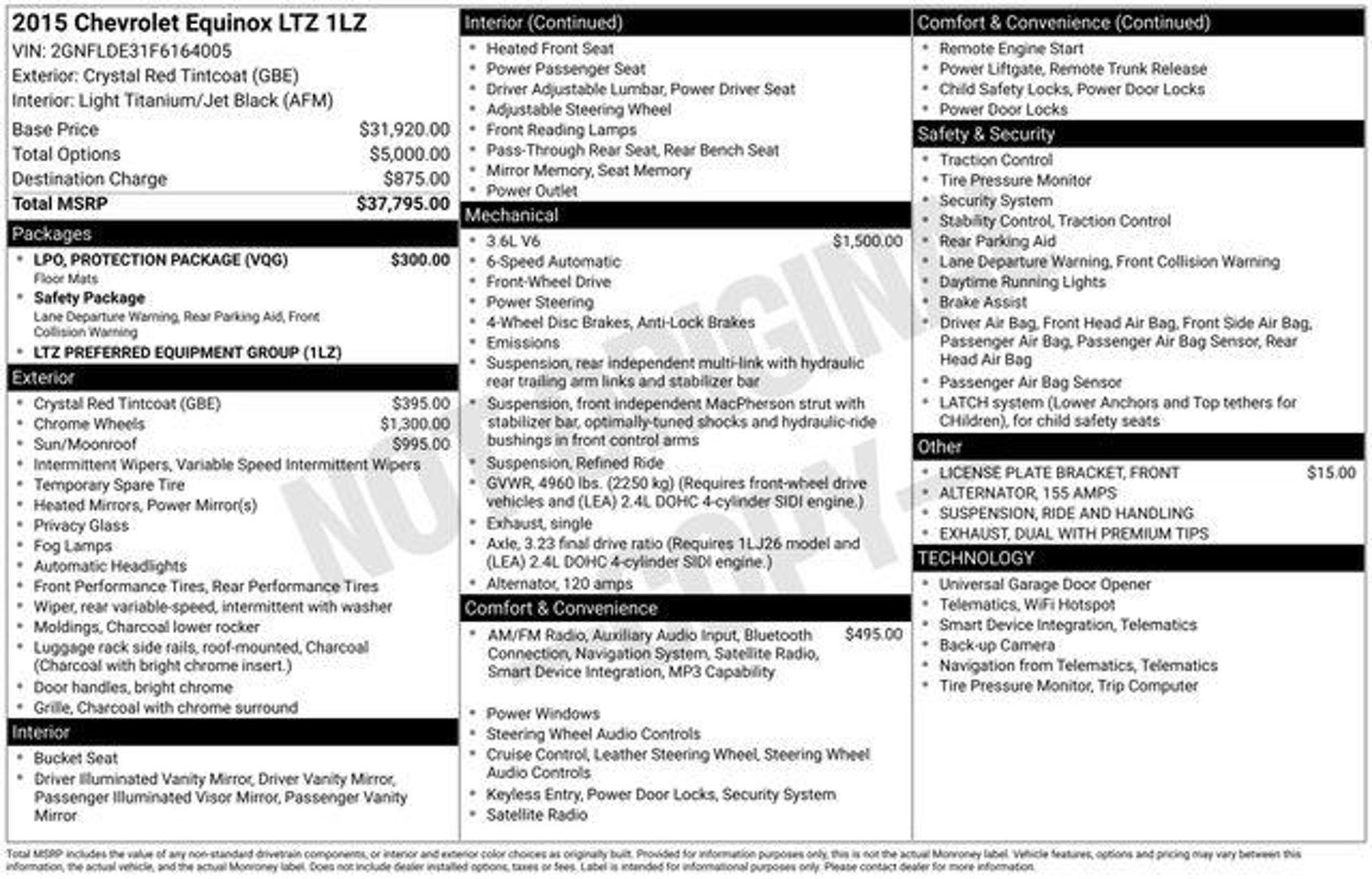 *Clean CARFAX* Equinox LTZ Backup Camera, Bluetooth, Leather Seats, Leather Wrap Steering Wheel, Power Rear Lift Gate, Remote Start, Sunroof/Moonroof, Heated Front Seats. 3.6L V6 SIDI Crystal Red Tintcoat 17/24 City/Highway MPG Recent Arrival! Where else can you shop 6 brands in one location? We offer new Ford, New Chrysler, Dodge, Jeep and Ram, and New Chevrolet. In addition to a great selection of used pre-owned inventory. Used vehicles as low as $2,999. Why Choose Us? You will receive FREE UNLIMITED CAR WASHES, good at ALL State of the Art Kelley Car Wash Locations, for as long as you own your vehicle! (**2 washes per week equates to an $832.00 value per year!**) Free Car Wash Locations include the 14/69 Auto Mall, Kelley Chevrolet, and Tom Kelley Chevrolet Buick Ford! (Just south of Fort Wayne in Decatur, IN) Kelley Automotive Group is proud to Pre-Apply Forever New Paint Protection to ALL New & Pre-Owned vehicles. To receive the Forever New Limited Warranty, $399 will be added to the purchase price of your Pre-Owned Vehicle. (Kelley Price $399 (to receive Limited Warranty) Awards: * JD Power Initial Quality Study * JD Power Initial Quality Study, JD Power Dependability Study * 2015 IIHS Top Safety Pick * 2015 KBB.com 10 Best Used Family Cars Under $15,000 * 2015 KBB.com 10 Best Used Compact SUVs Under $15,000 Reviews: * If you haul rear-seat passengers more often than you fill the cargo area in your compact SUV, then you might want to give the 2015 Chevy Equinox a look. The ability to tow 3,500 pounds in V6 models is shoulders above most competitors. Source: KBB.com * Premium look inside and out; strong optional V6 engine; quiet interior; comfortable highway ride; spacious and adjustable backseat. Source: Edmunds