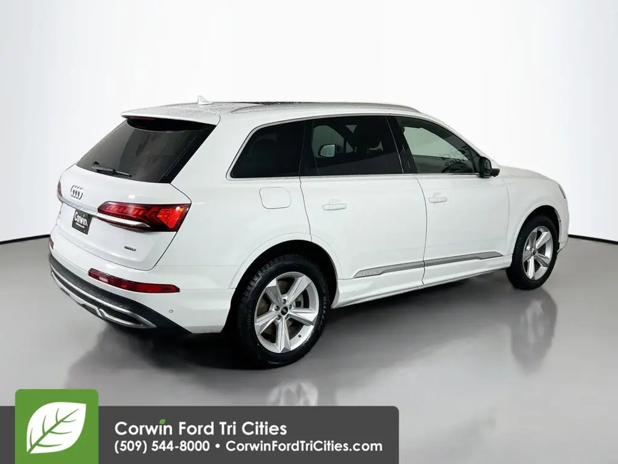 Prepare your family for a long, comfortable road trip in our Accident Free 2022 Audi Q7 45 Premium Plus quattro presented in stunning Glacier White Metallic. Motivated by a TurboCharged 2.0 Liter 4 Cylinder generating 248hp tethered to an 8 Speed Automatic transmission for inspiring acceleration. A smooth, quiet ride encourages you to enjoy this All Wheel Drive SUV's ability to attain up to 25mpg on the highway for as long as possible while you show off its seductive bodywork accented with a panoramic sunroof, LED lighting, and eye-catching alloy wheels. Our Q7 Premium Plus adds a sense of comfort and relaxation to every journey thanks to a leather-trimmed interior designed with your needs in mind. Amenities such as heated power front seats, a heated multi-function steering wheel, keyless entry/ignition, ambient lighting, an inductive charging pad, and tri-zone automatic climate control help you stay focused on the road ahead without fatigue. A full-color virtual cockpit instrument cluster and dash-mounted MMI infotainment system providing navigation, Bluetooth®, Android Auto®, Apple CarPlay®, a USB input, and Bang & Olufsen 3D surround sound make it easy to add your preferred soundtrack. You'll feel incredibly safe and secure thanks to a long list of safety technologies included in our remarkable Audi. Adaptive cruise control with traffic jam assist, blind-spot monitoring with rear cross-traffic alert, lane departure warning, and a backup camera with surround view work together for your peace of mind. Our Q7 Premium Plus is the perfect SUV for your needs! Save this Page and Call for Availability. We Know You Will Enjoy Your Corwin Ford Tri-City Test Drive Towards Ownership! See us today at Corwin Ford Tri-Cities. Family owned for over 100 years! Excellent selection of New and Used vehicles, Financing options. Serving Pasco, Kennewick, Richland, Walla Walla, Hermiston, Umatilla, Yakima, Spokane, Sunnyside, Grandview, Dayton, Prescott, Benton County, Franklin County, Yakima County, Spokane County, Adams County, Grant County, and the Greater Columbia Basin. *All Prices plus applicable sales tax and licensing. A negotiable documentary service fee up to $200 may be added to sales price or capitalized cost of the vehicle. One vehicle unless otherwise noted and subject to prior sale without notice. While supplies last. EPA mileage estimates are for newly manufactured vehicles only. Your actual mileage will vary depending on how you drive and maintain your vehicle.